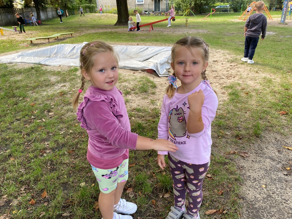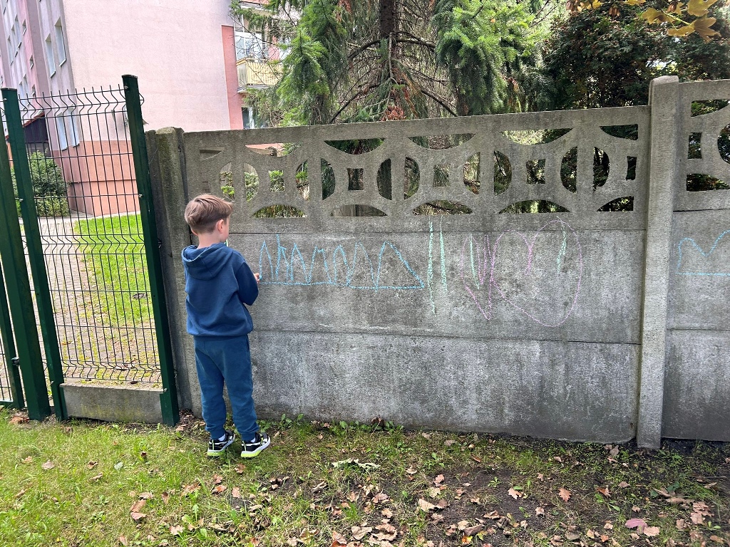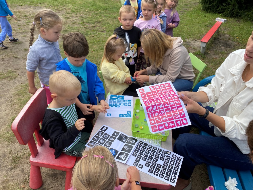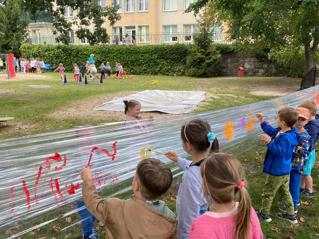 Po bajce nadszedł czas na zabawę na placu zabaw, który na ten dzień zamienił się w kolorową strefę atrakcji. Przedszkolaki mogły malować kredą po murze,