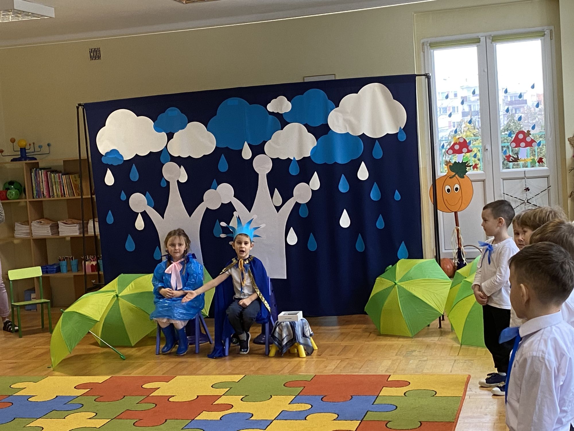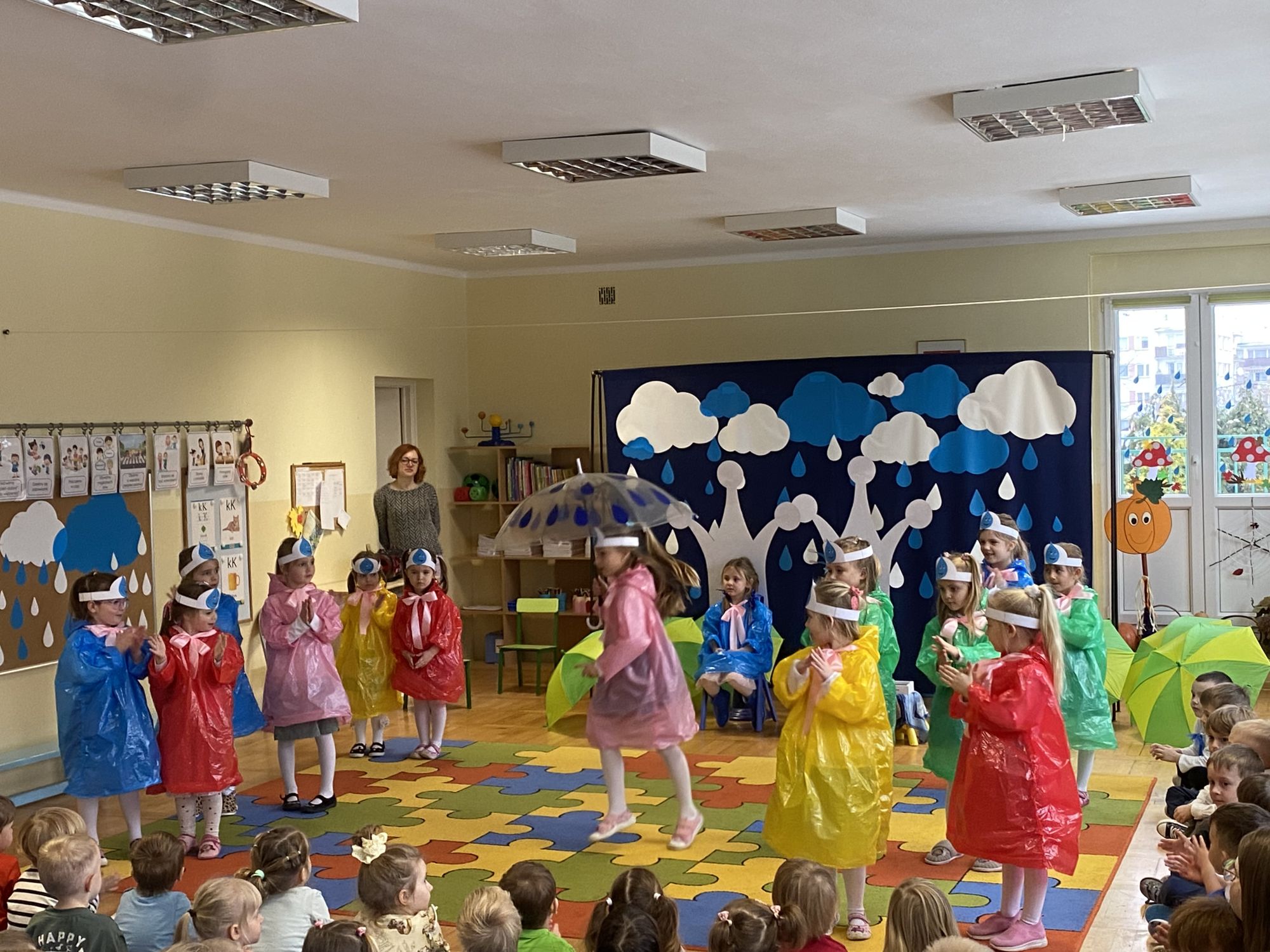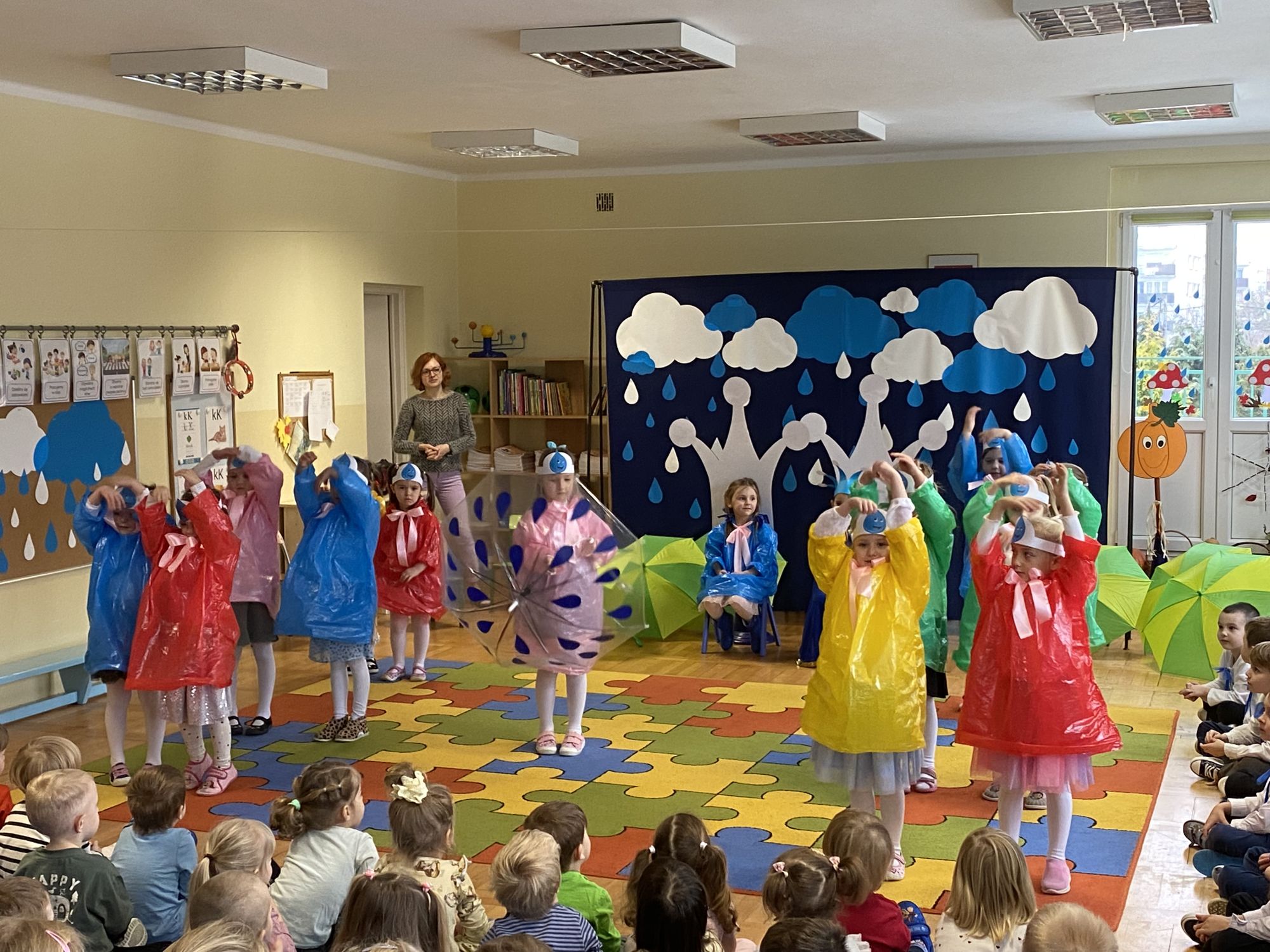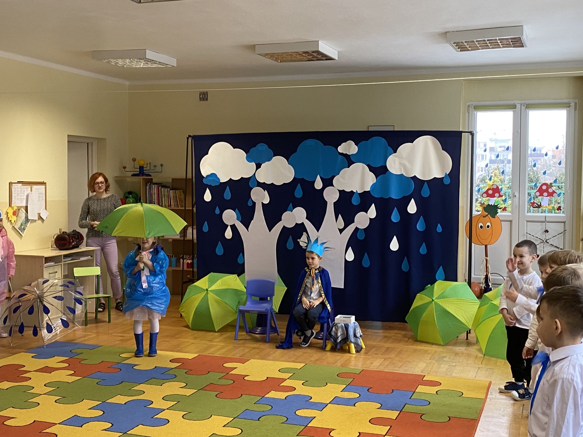 Spotkanie rozpoczęło się od słuchania odgłosów jesiennego deszczu, co wprowadziło wszystkich w niezwykły, nastrojowy klimat. Następnie dzieci z wielkim zaangażowaniem zaprezentowały piosenkę o jesieni. Kolejnym punktem programu była inscenizacja „Deszczowy Król”, w której nasi mali aktorzy wcielili się w role jesiennych bohaterów, pokazując, jak jesienny deszcz może być nie tylko szary, ale także magiczny i pełen niespodzianek.