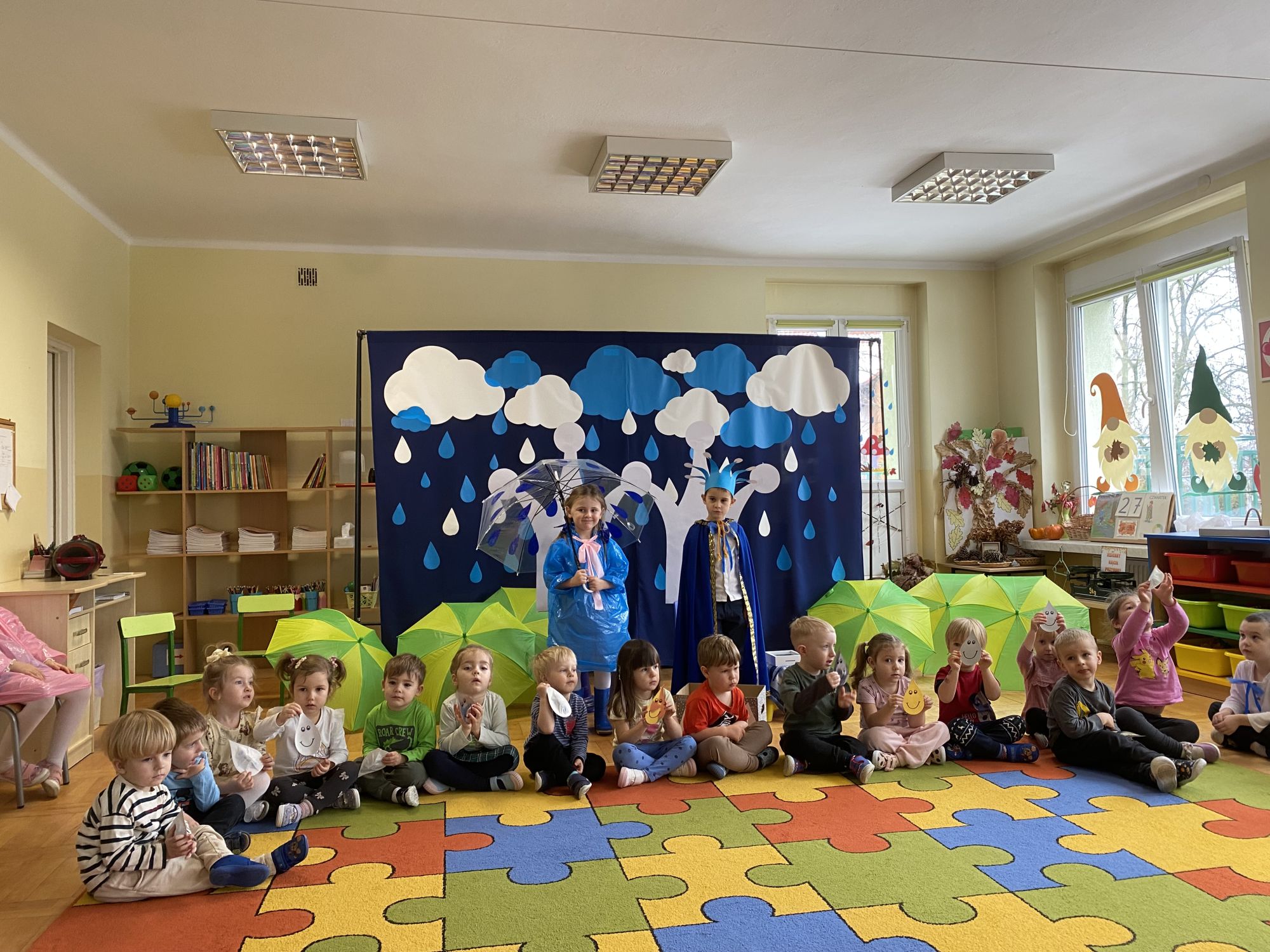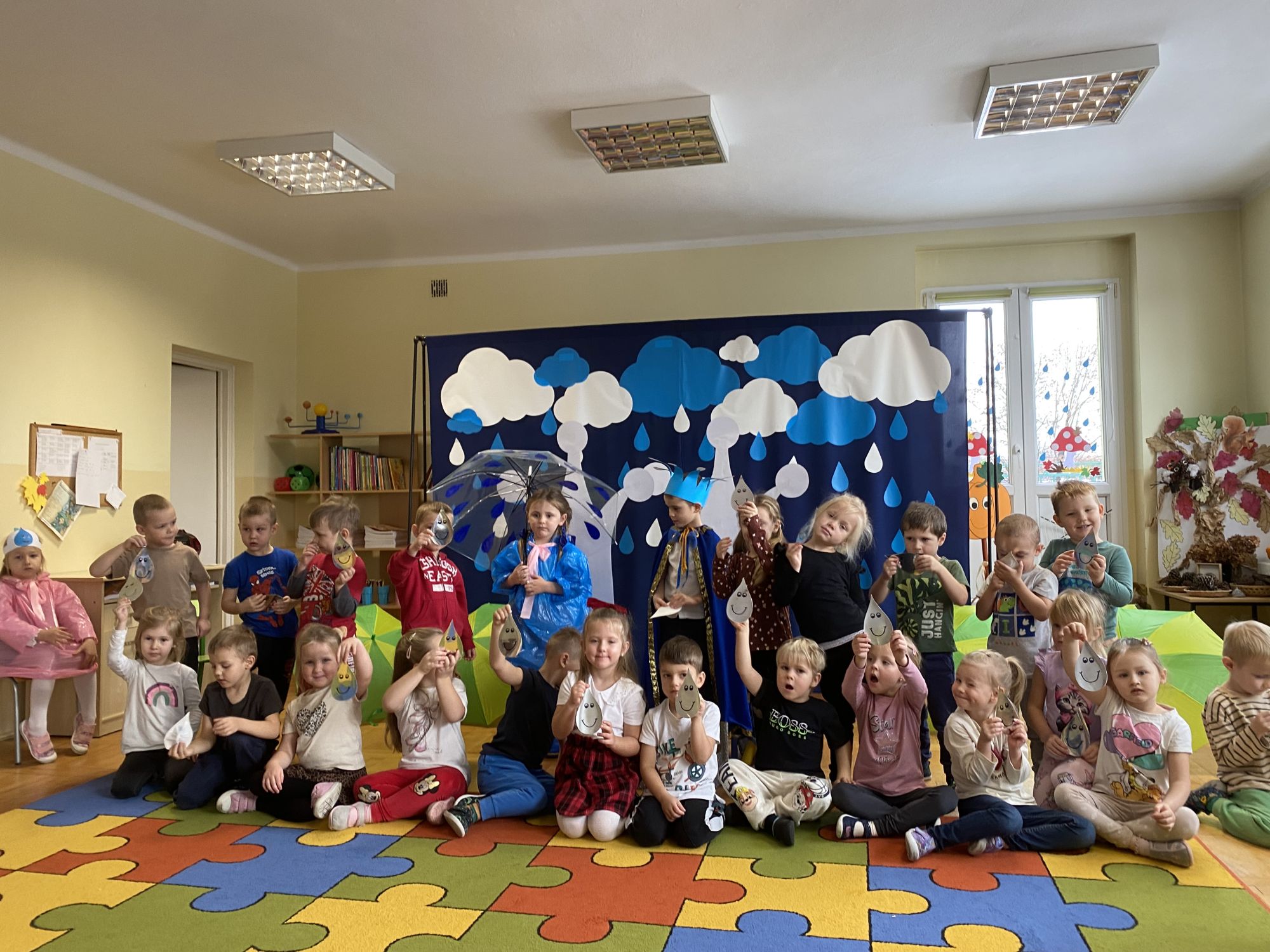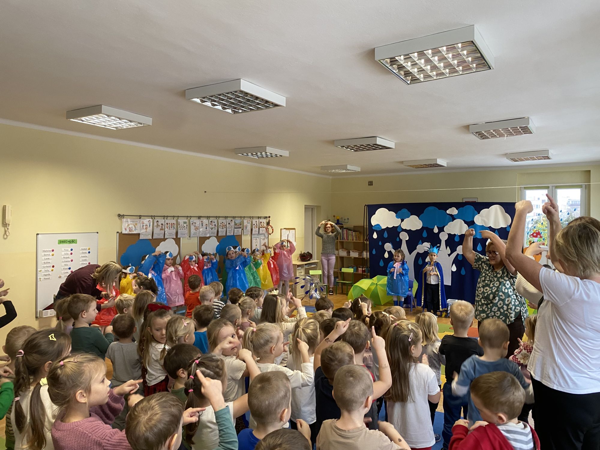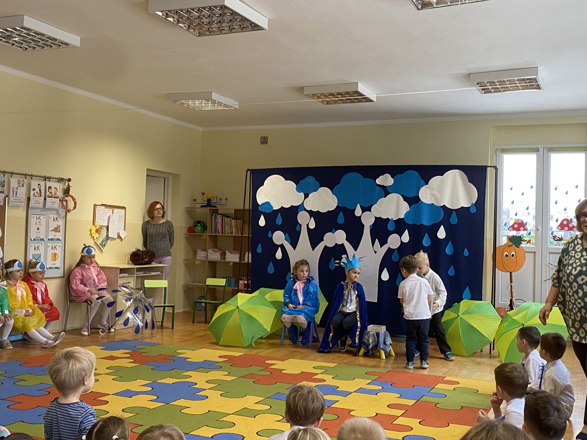 Spotkanie rozpoczęło się od słuchania odgłosów jesiennego deszczu, co wprowadziło wszystkich w niezwykły, nastrojowy klimat. Następnie dzieci z wielkim zaangażowaniem zaprezentowały piosenkę o jesieni. Kolejnym punktem programu była inscenizacja „Deszczowy Król”, w której nasi mali aktorzy wcielili się w role jesiennych bohaterów, pokazując, jak jesienny deszcz może być nie tylko szary, ale także magiczny i pełen niespodzianek.