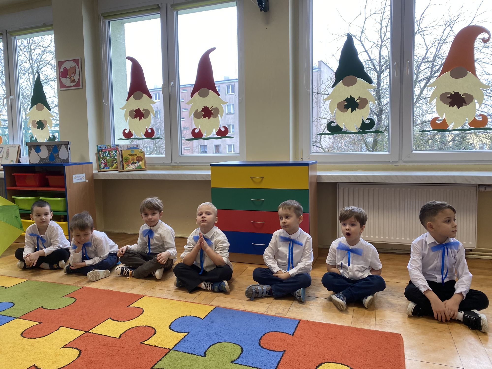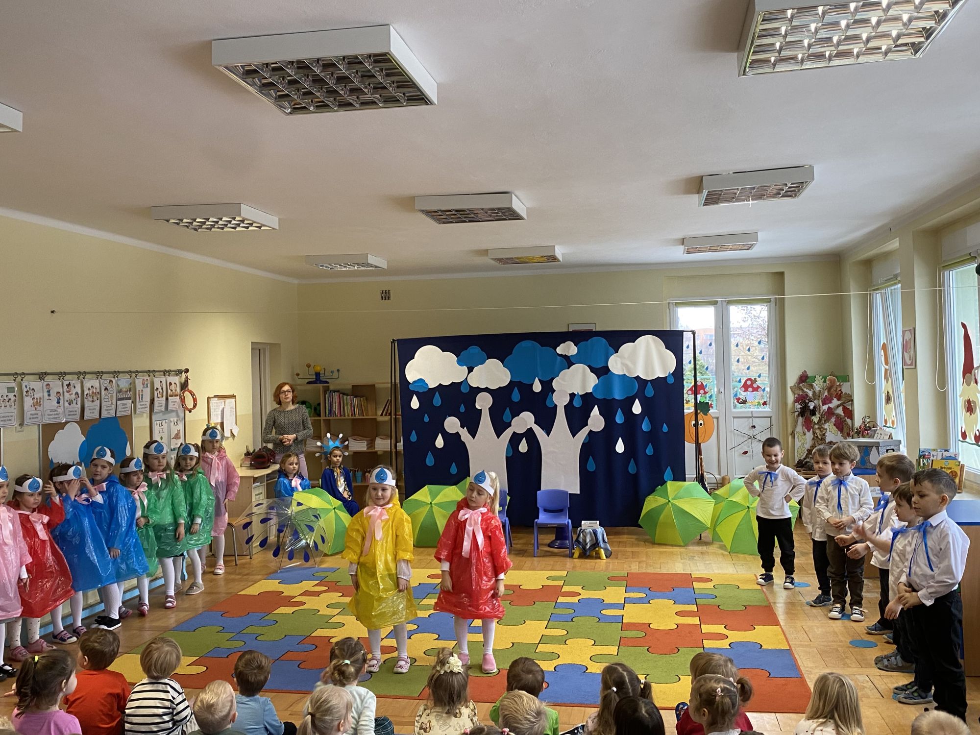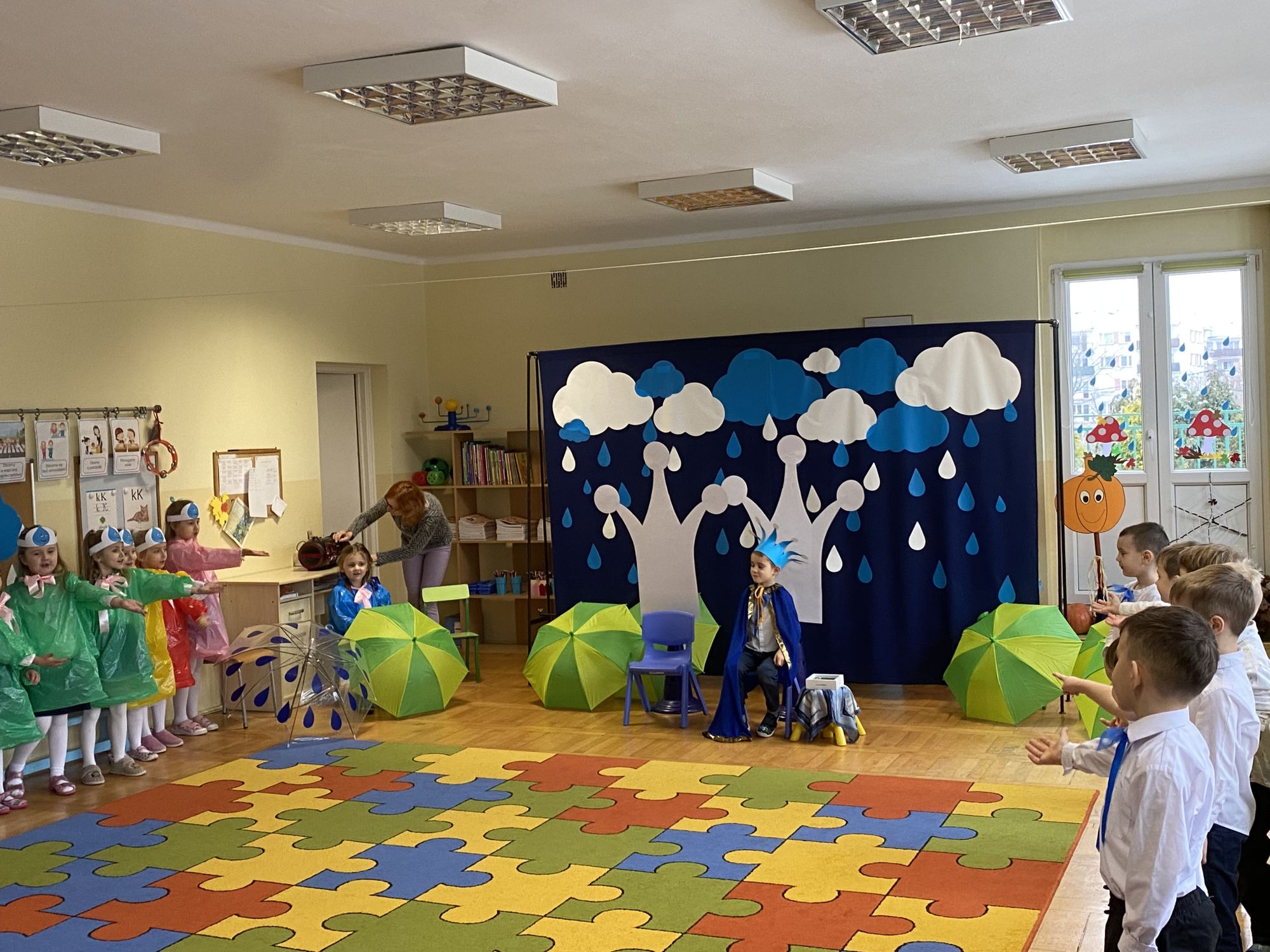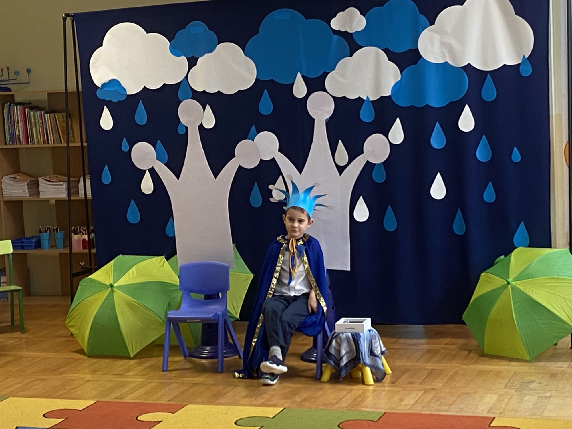 Spotkanie rozpoczęło się od słuchania odgłosów jesiennego deszczu, co wprowadziło wszystkich w niezwykły, nastrojowy klimat. Następnie dzieci z wielkim zaangażowaniem zaprezentowały piosenkę o jesieni. Kolejnym punktem programu była inscenizacja „Deszczowy Król”, w której nasi mali aktorzy wcielili się w role jesiennych bohaterów, pokazując, jak jesienny deszcz może być nie tylko szary, ale także magiczny i pełen niespodzianek.