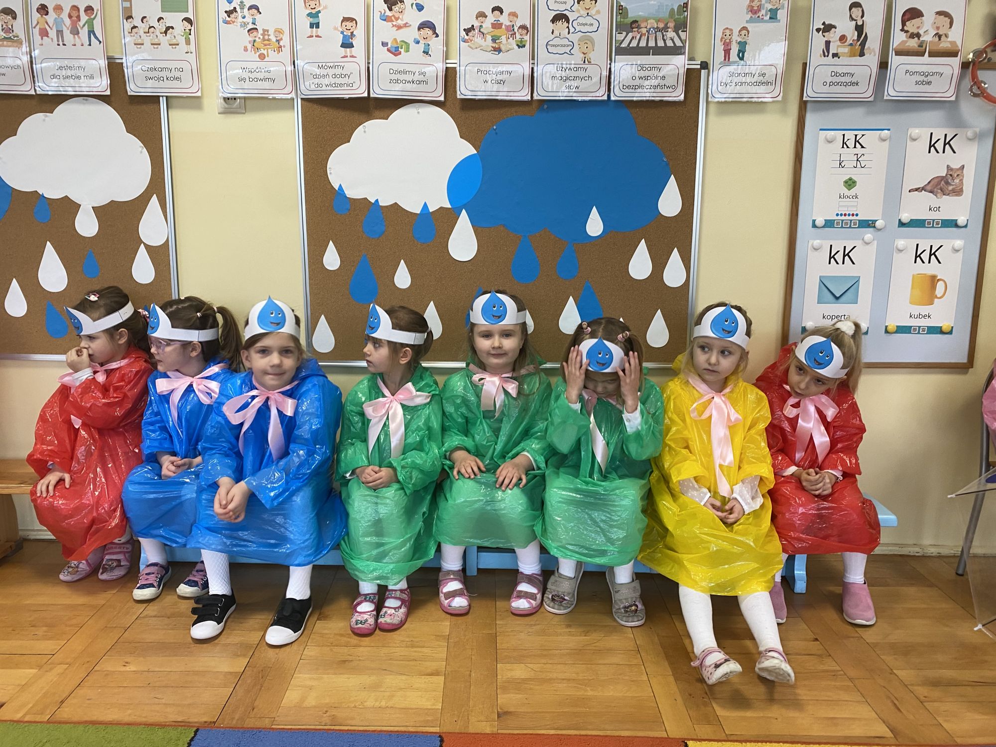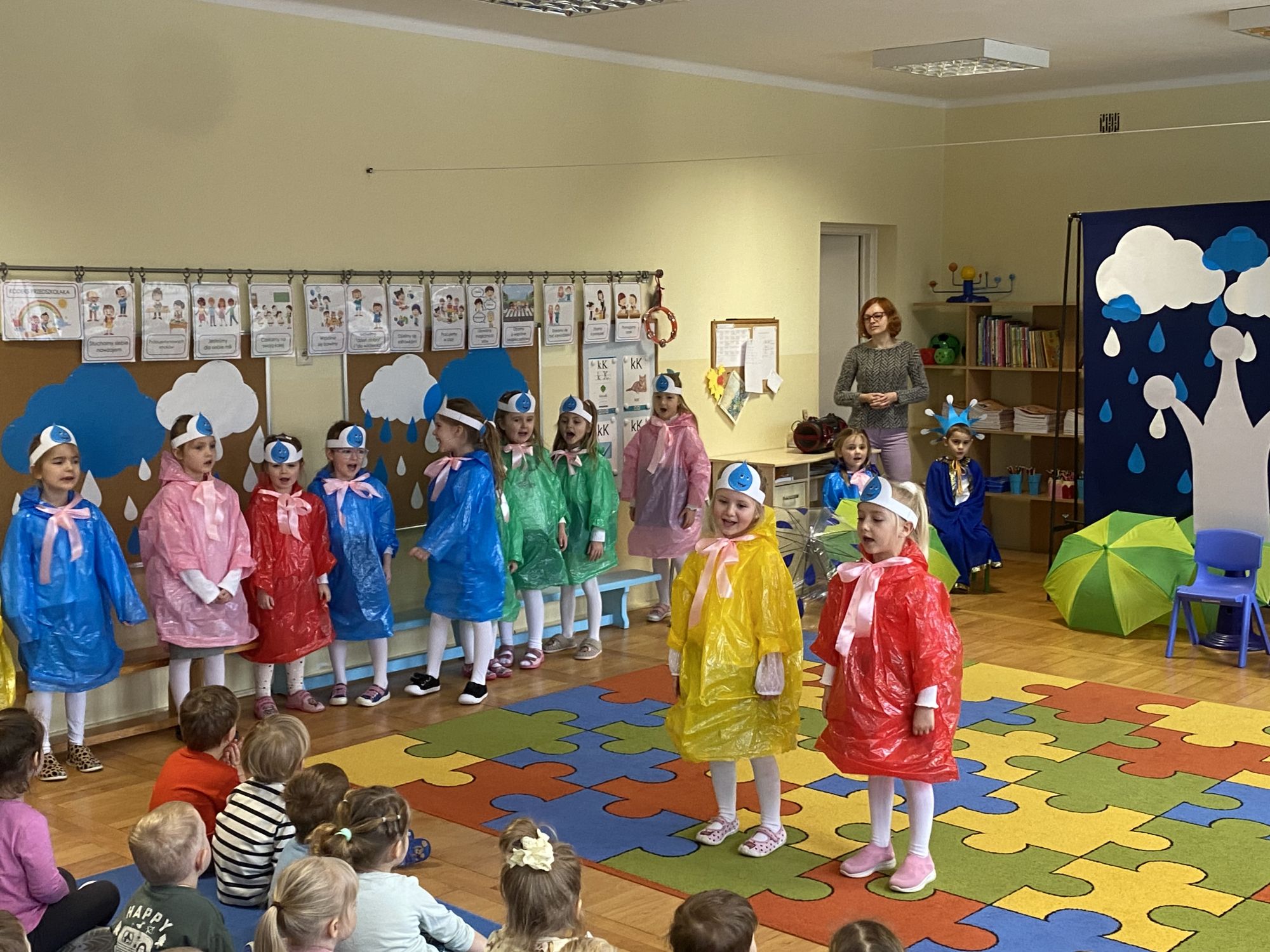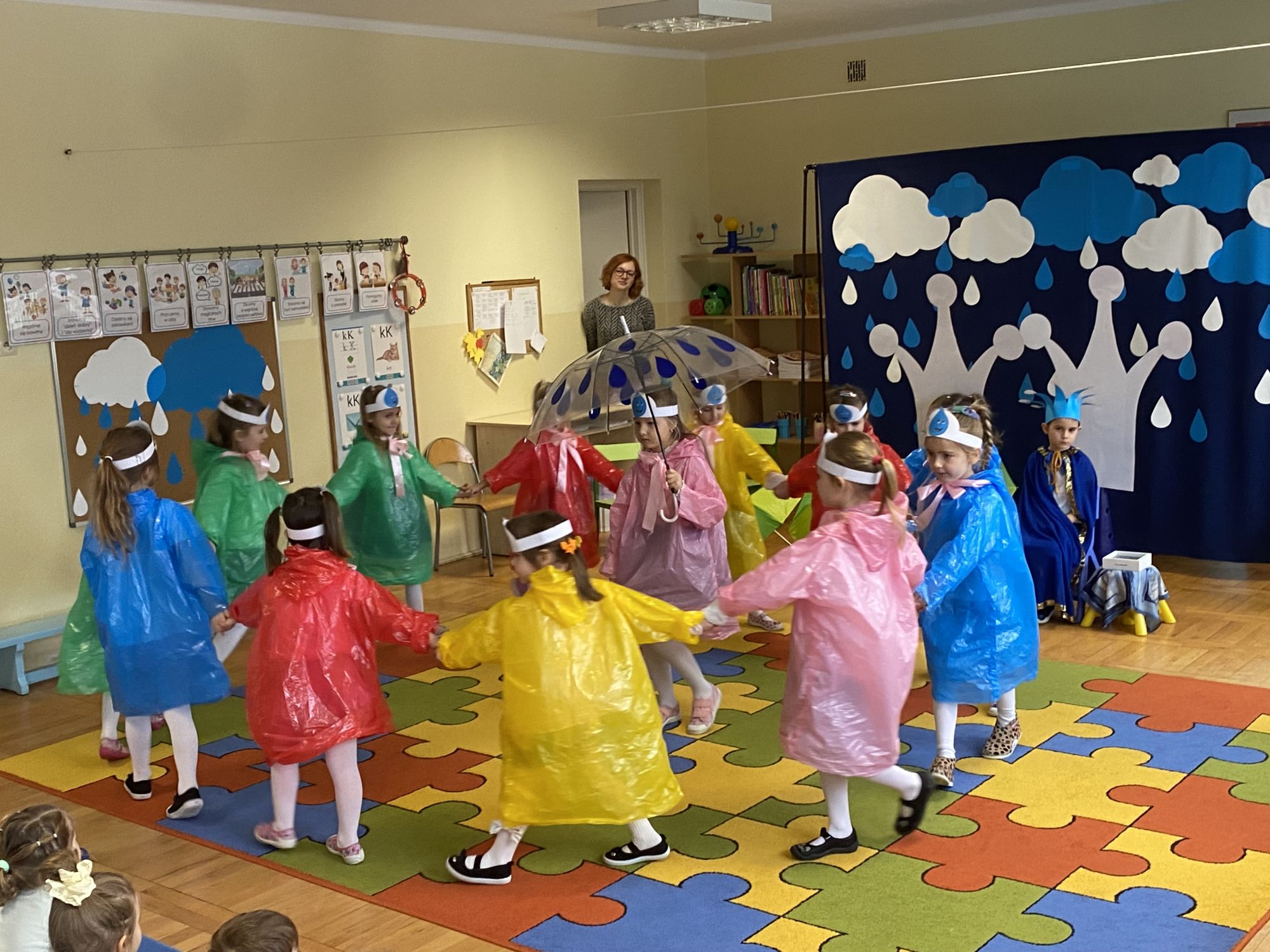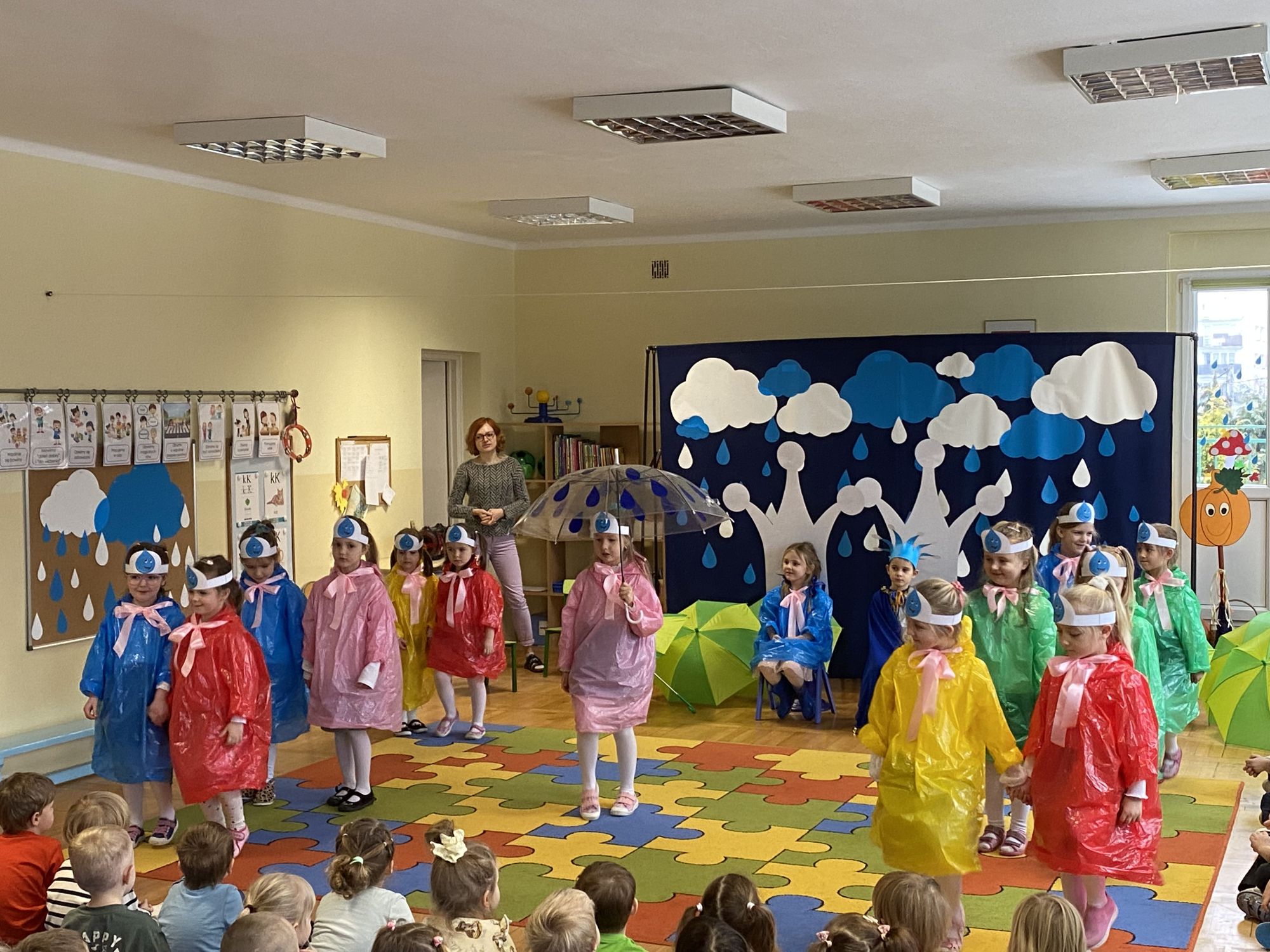 Bardzo miłym akcentem przedstawienia był pełen energii i uśmiechu taniec "Wesołych Deszczowych Kropelek, który wzbudził zachwyt publiczności. Dziewczynki z wielką swobodą i radością zaprezentowały swoje umiejętności taneczne, tworząc barwne, poruszające się jak deszczowa chmurka widowisko.