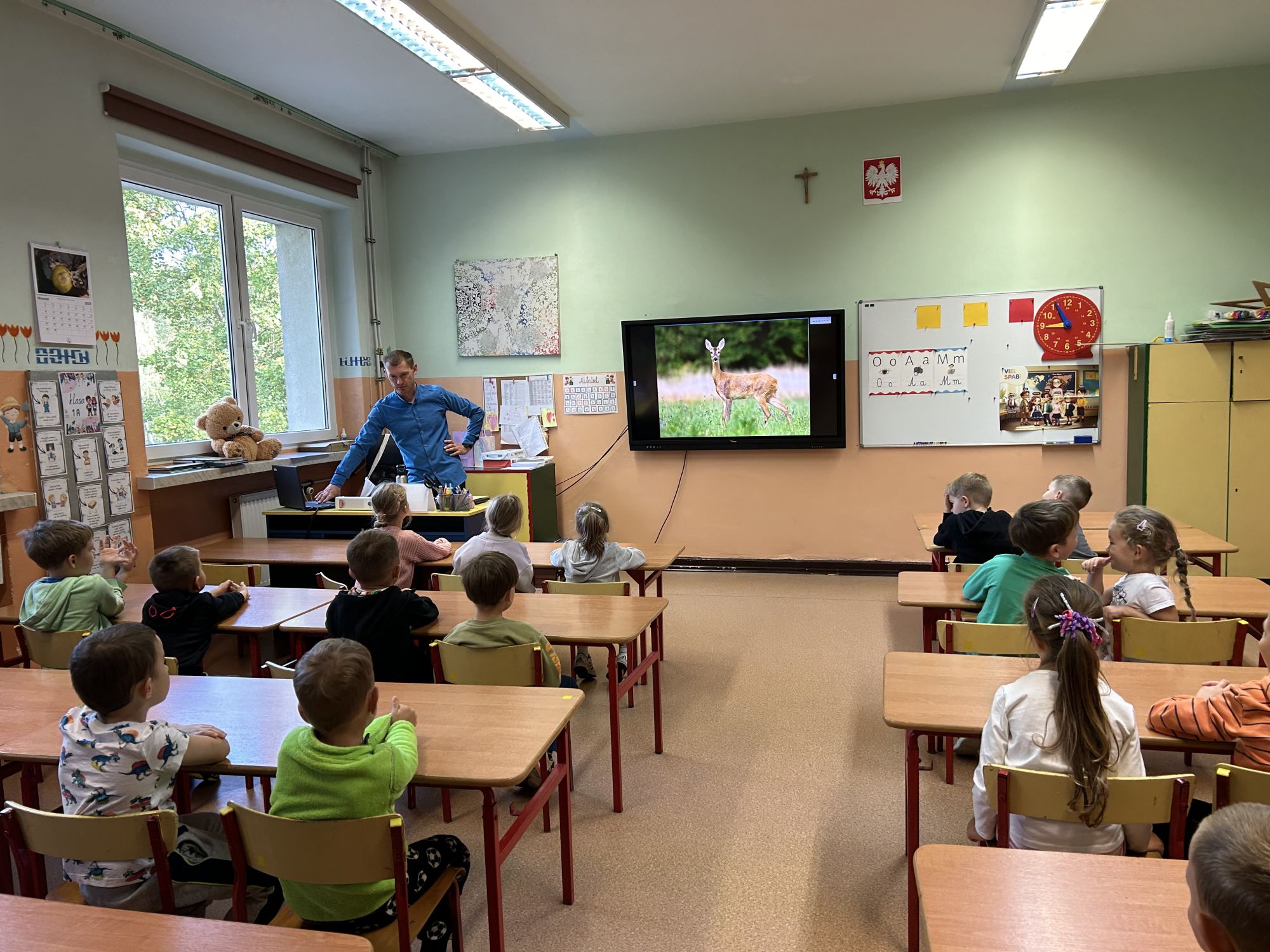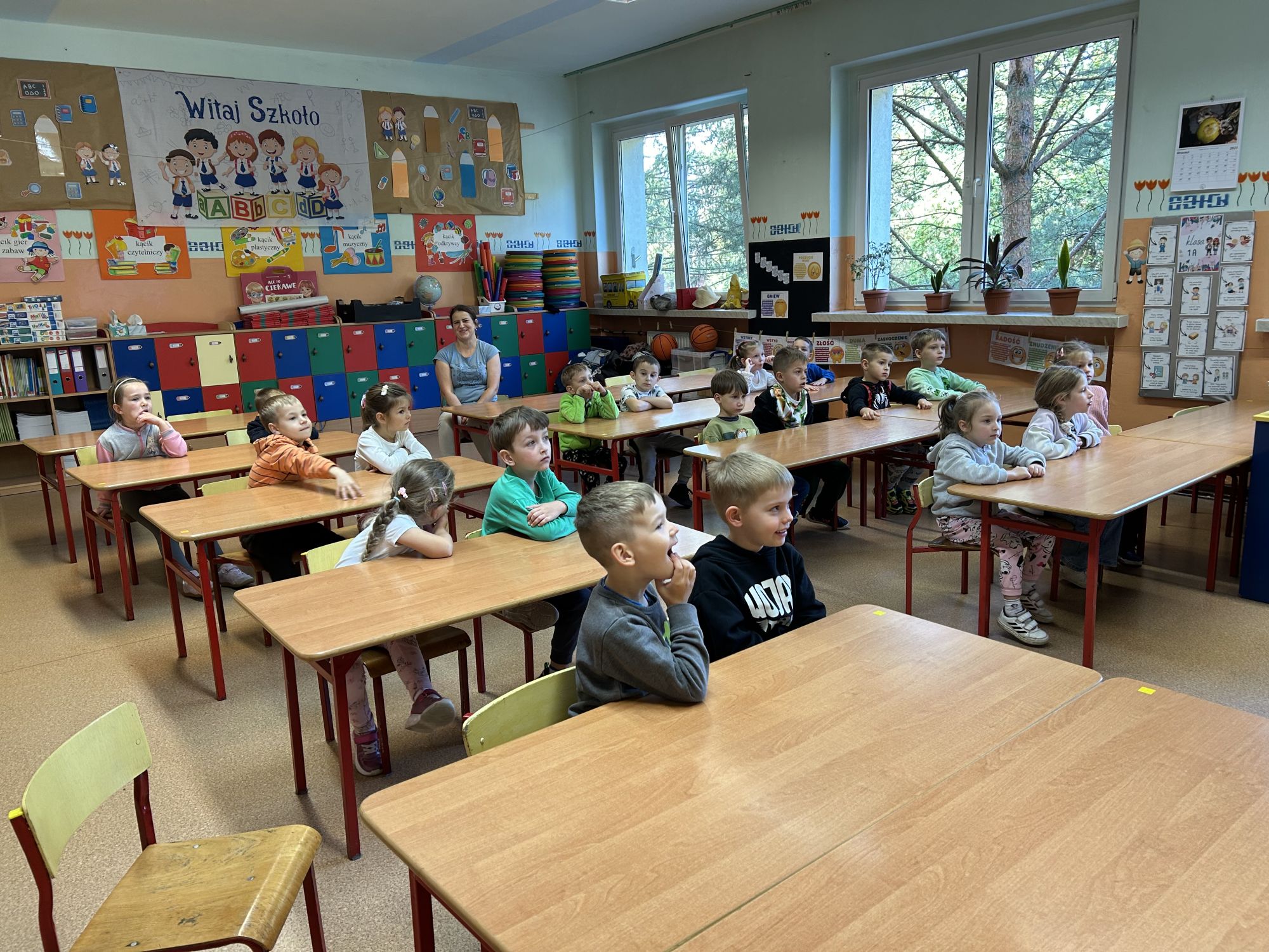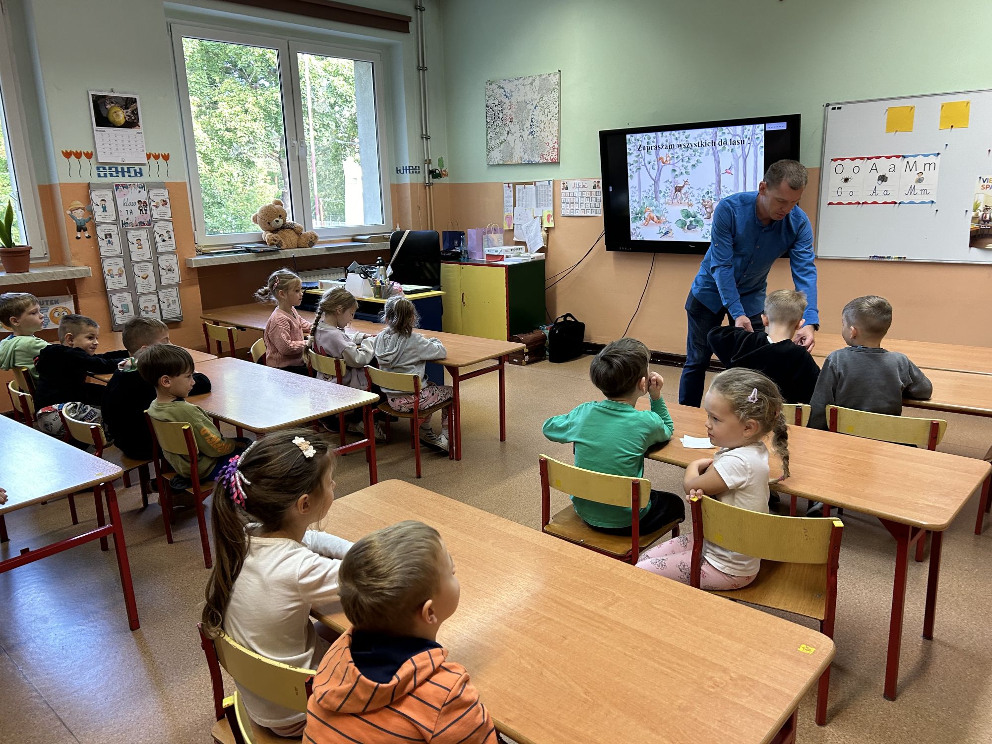 25 września dzieci z grupy IV odwiedziły pobliską szkołę podstawową, gdzie wzięły udział w wyjątkowych zajęciach przyrodniczych pt. „Wycieczka do lasu”. Zajęcia poprowadził nauczyciel przyrody, Pan Marek Kaziak.