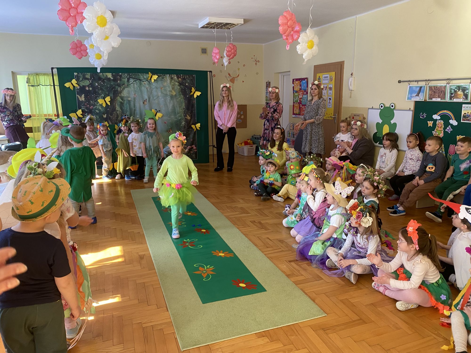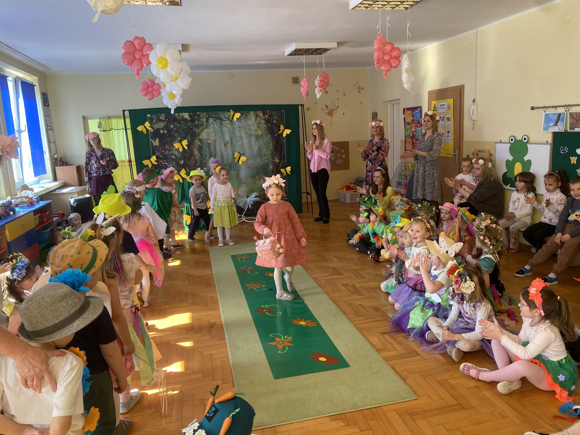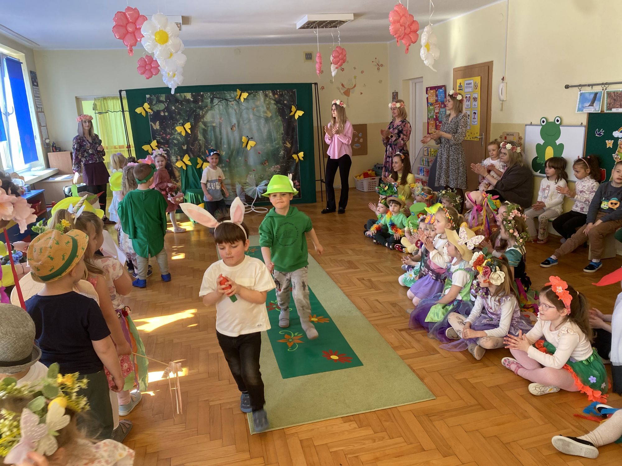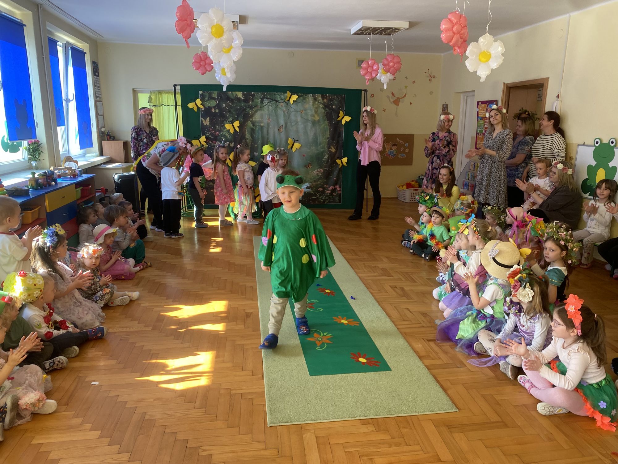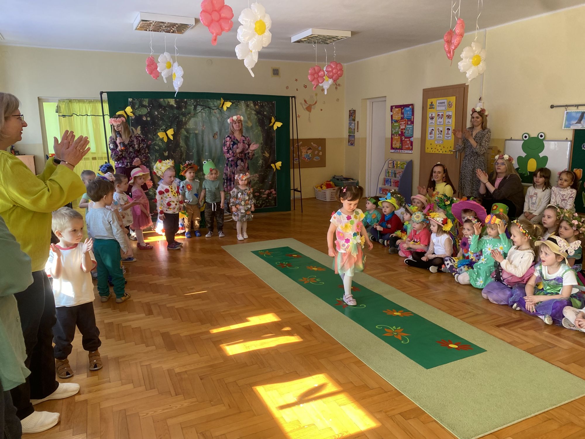 Następnie na dzieci czekały wiosenne zagadki oraz wesołe zabawy ruchowe, które wprowadziły wszystkich w doskonały nastrój. Kolejnym, bardzo wyczekiwanym punktem programu był wiosenny pokaz mody. Dzieci, ubrane w kolorowe, pomysłowe stroje inspirowane wiosną, z dumą prezentowały się na zielonym dywanie, wzbudzając zachwyt i ogromne brawa.
