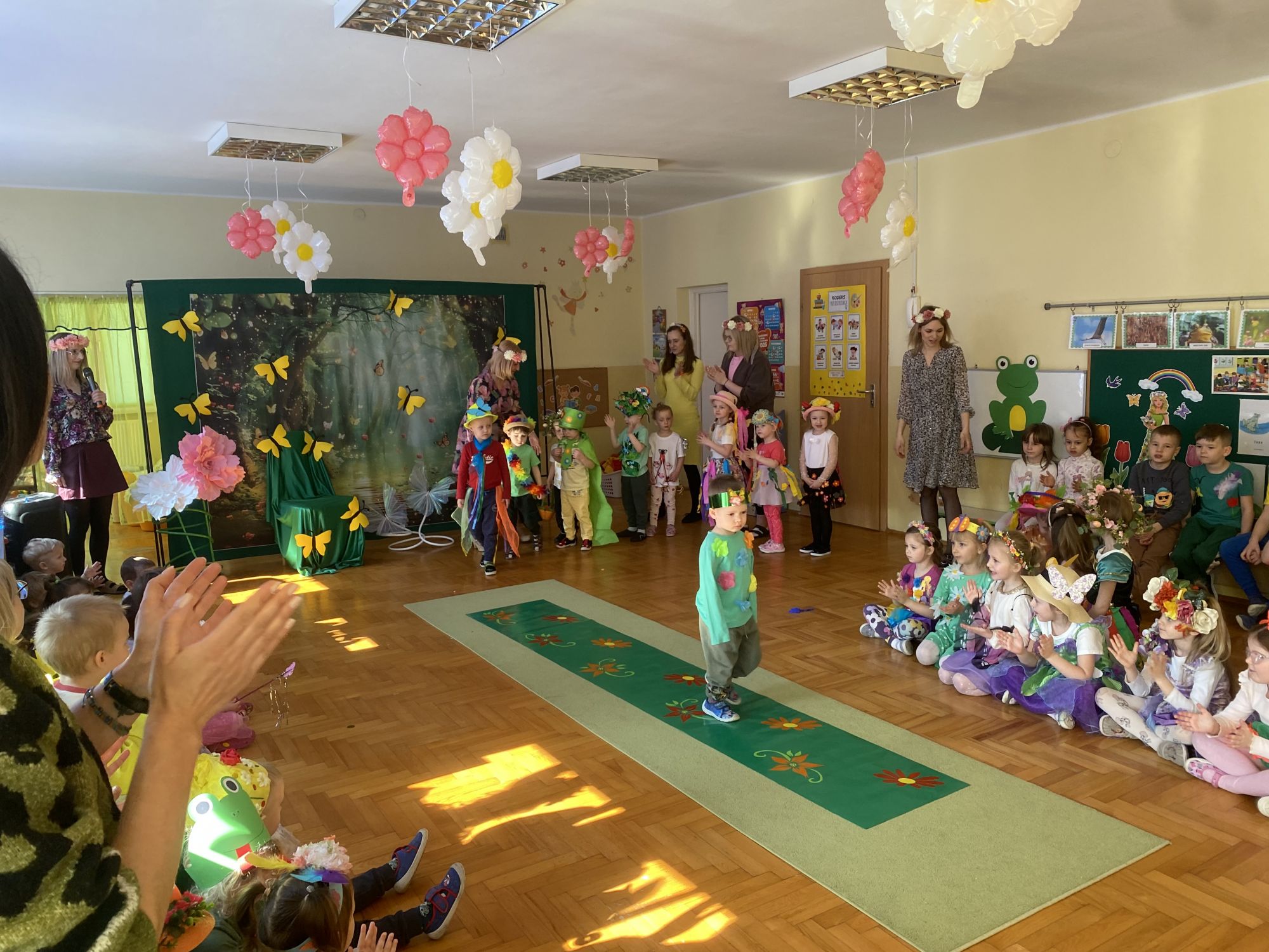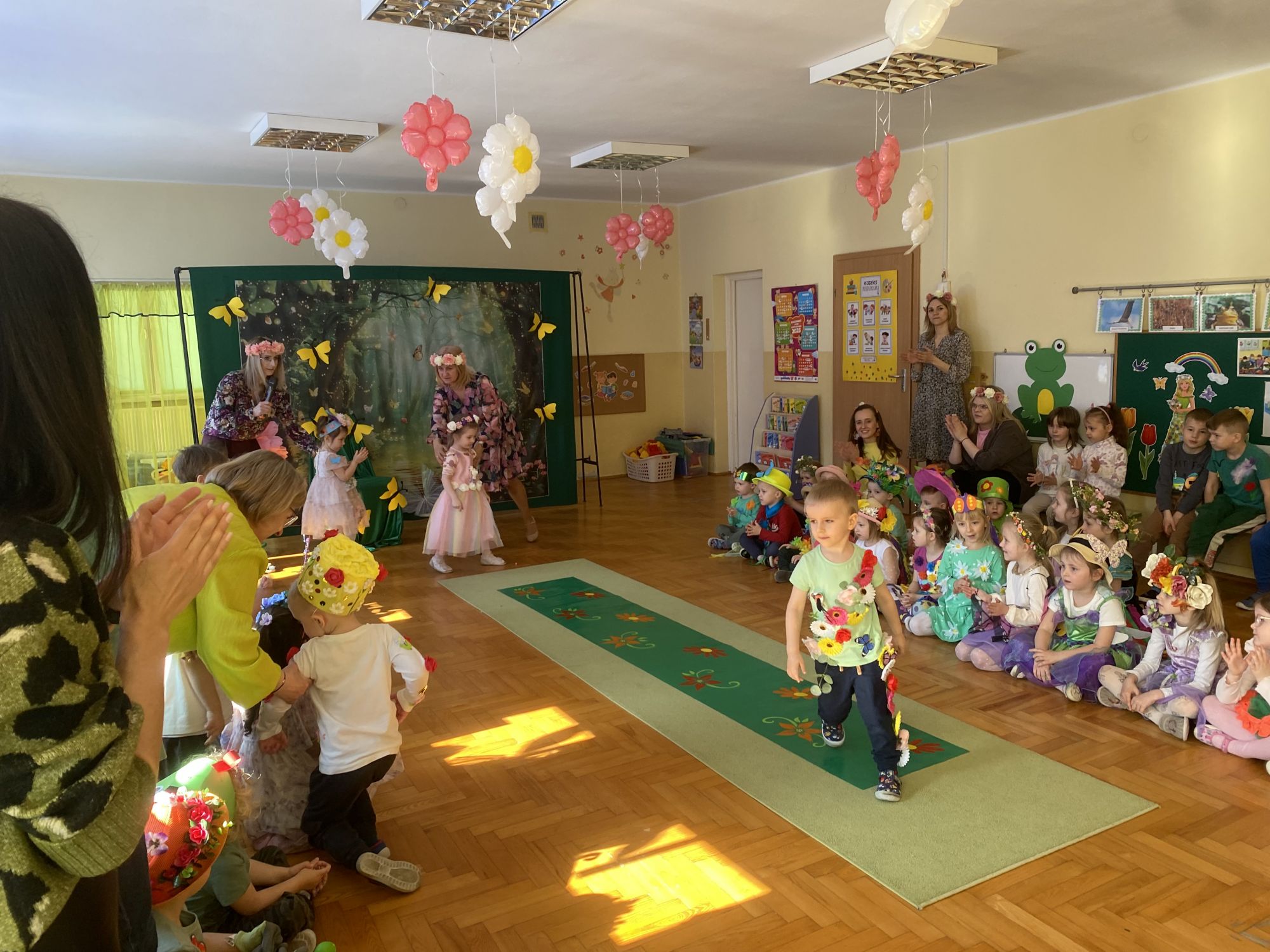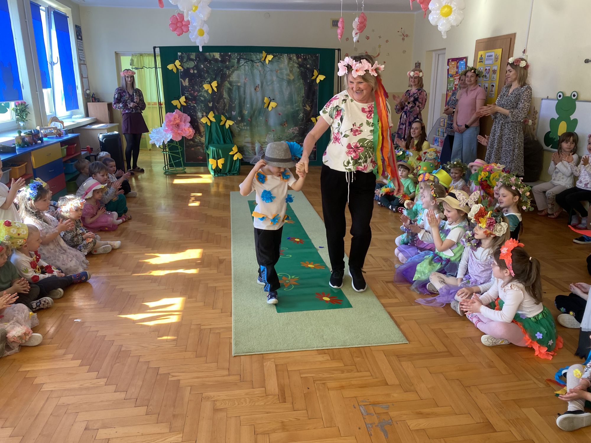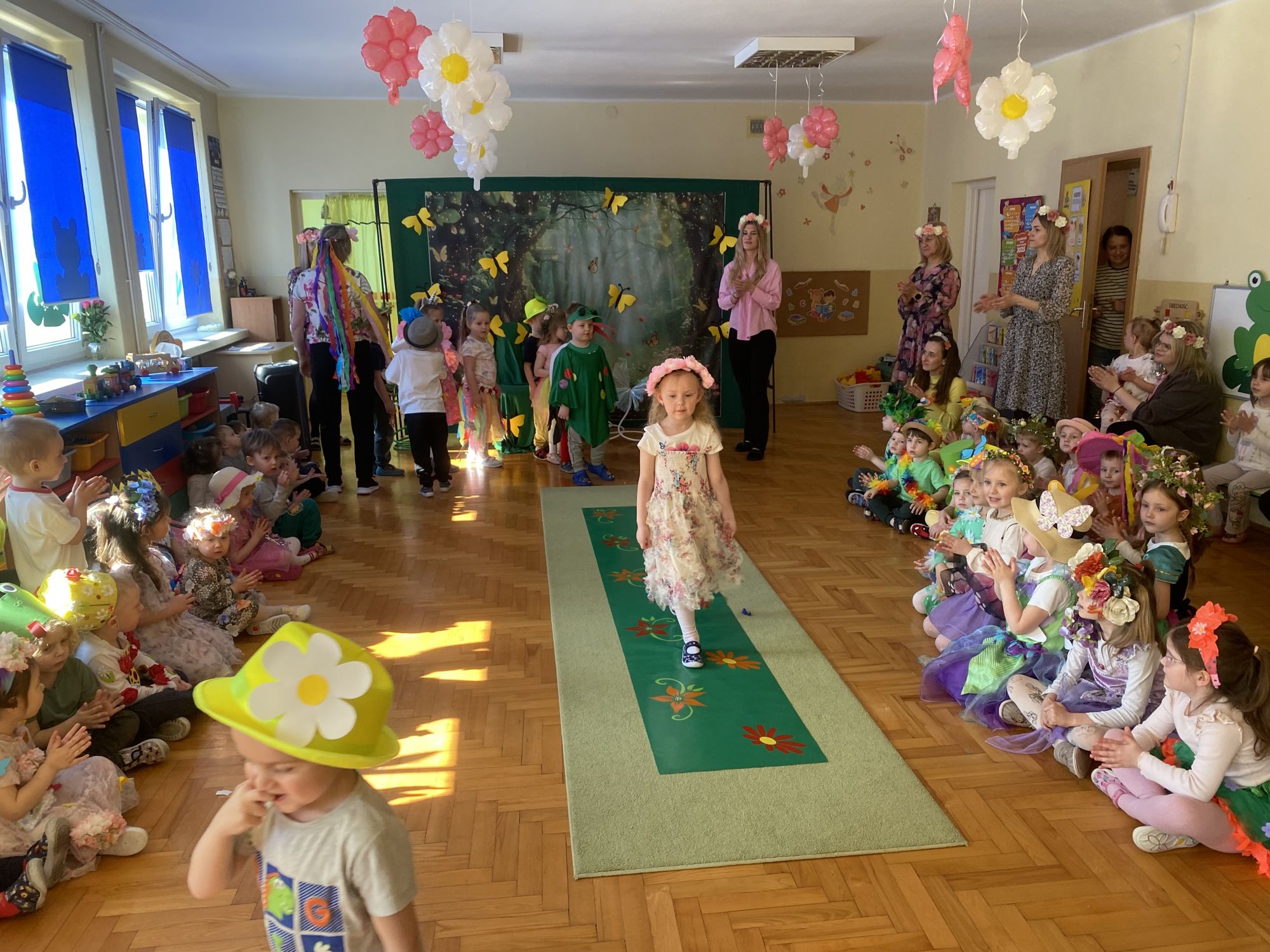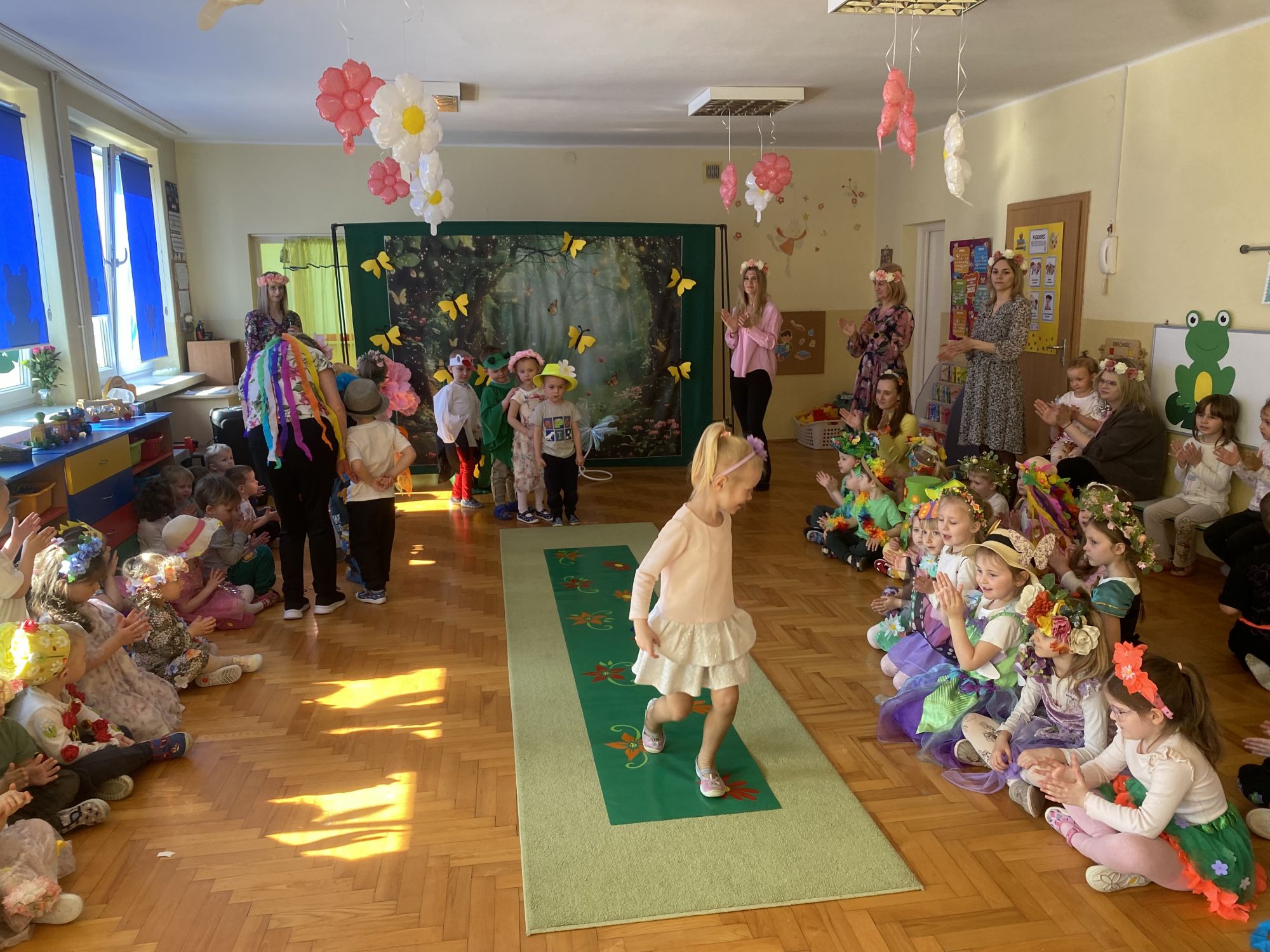 Następnie na dzieci czekały wiosenne zagadki oraz wesołe zabawy ruchowe, które wprowadziły wszystkich w doskonały nastrój. Kolejnym, bardzo wyczekiwanym punktem programu był wiosenny pokaz mody. Dzieci, ubrane w kolorowe, pomysłowe stroje inspirowane wiosną, z dumą prezentowały się na zielonym dywanie, wzbudzając zachwyt i ogromne brawa.