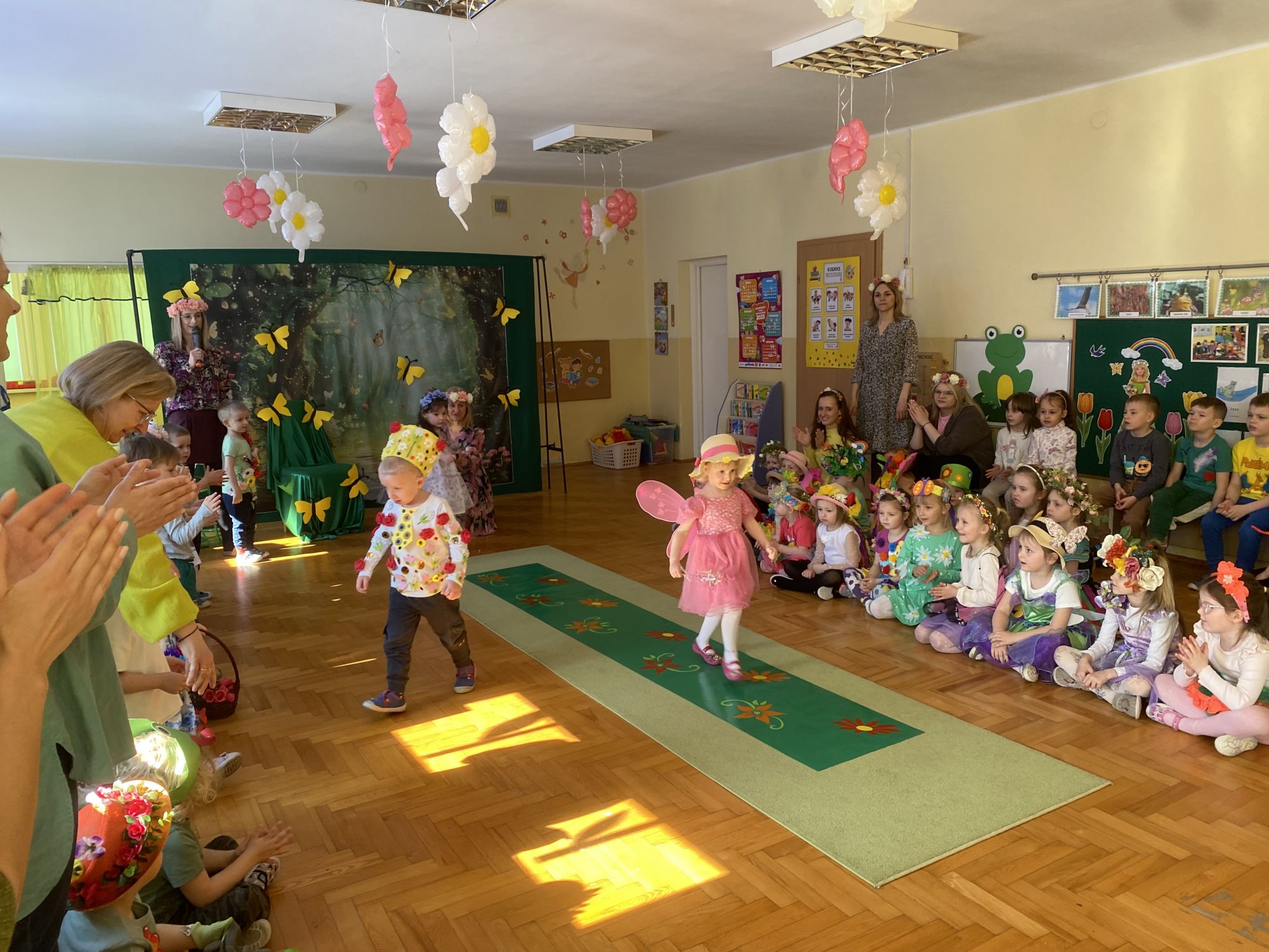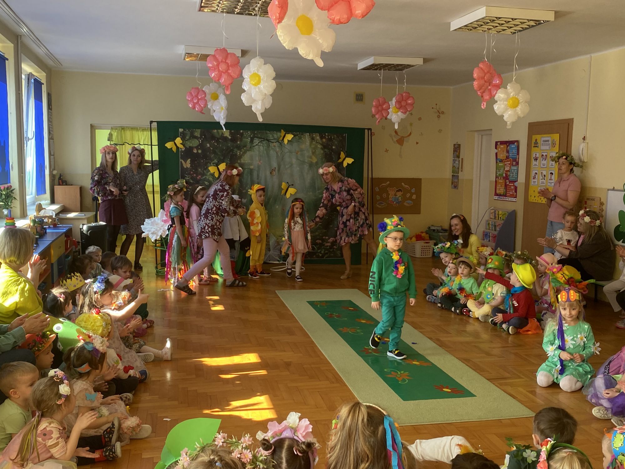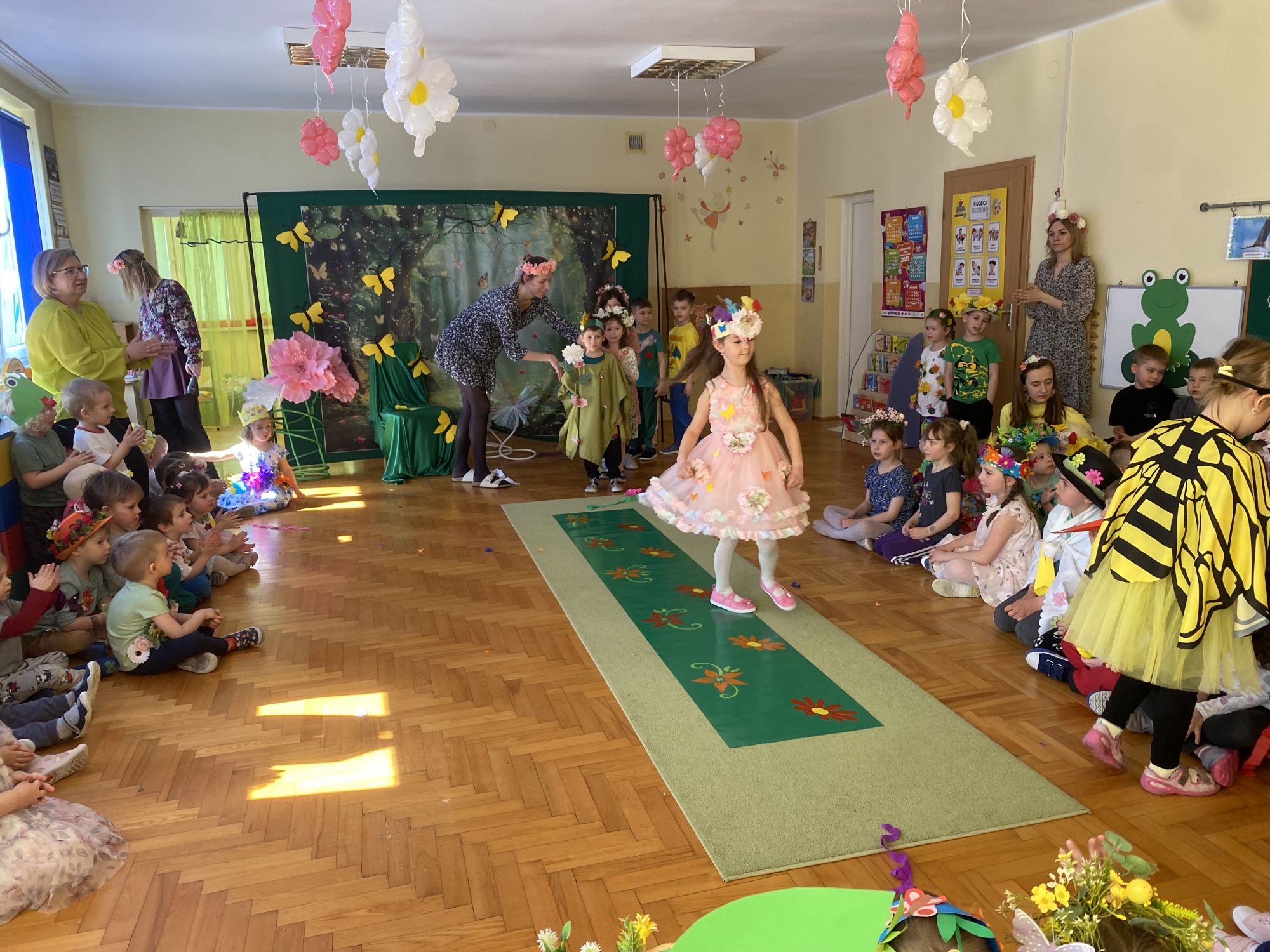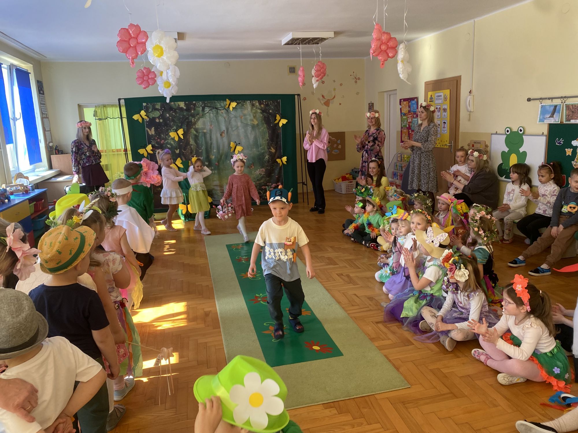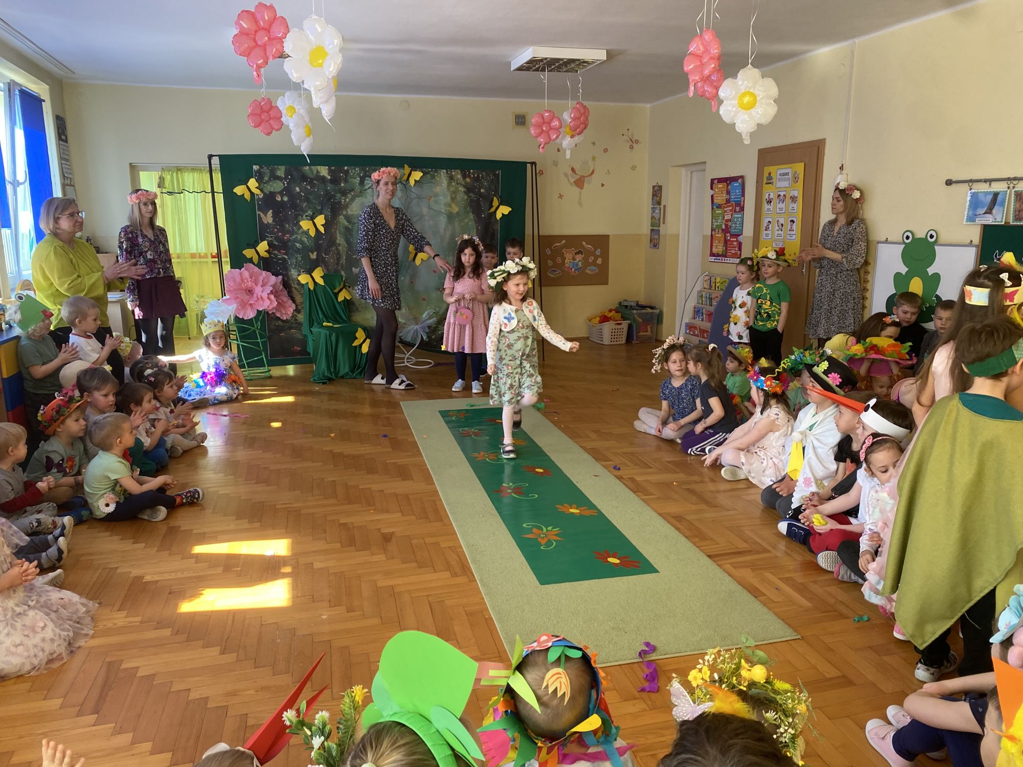 Następnie na dzieci czekały wiosenne zagadki oraz wesołe zabawy ruchowe, które wprowadziły wszystkich w doskonały nastrój. Kolejnym, bardzo wyczekiwanym punktem programu był wiosenny pokaz mody. Dzieci, ubrane w kolorowe, pomysłowe stroje inspirowane wiosną, z dumą prezentowały się na zielonym dywanie, wzbudzając zachwyt i ogromne brawa.