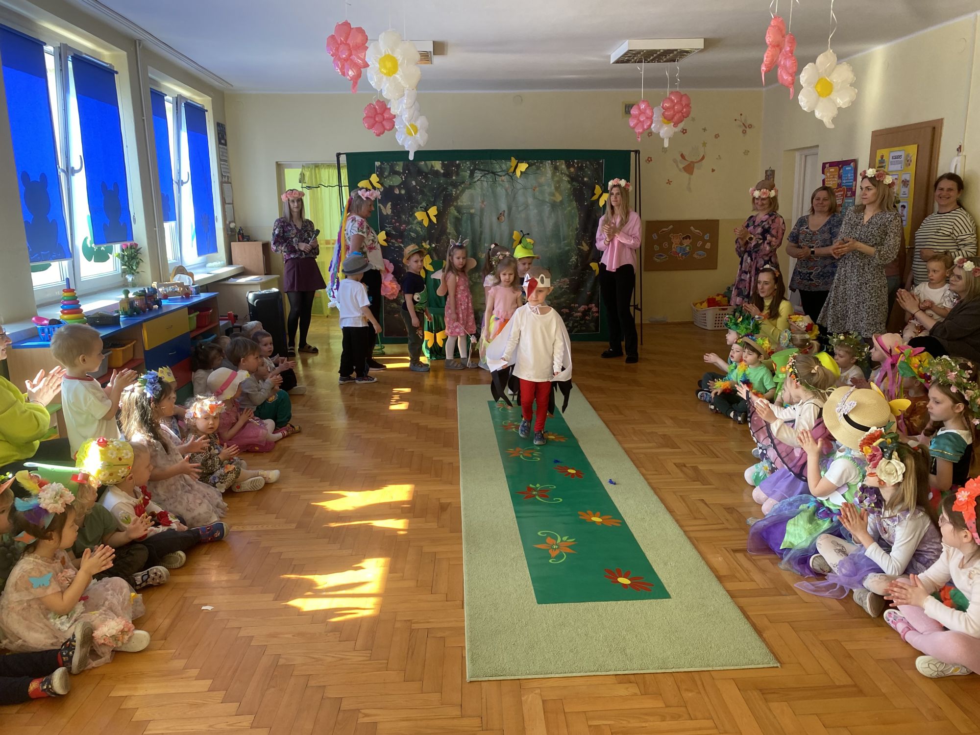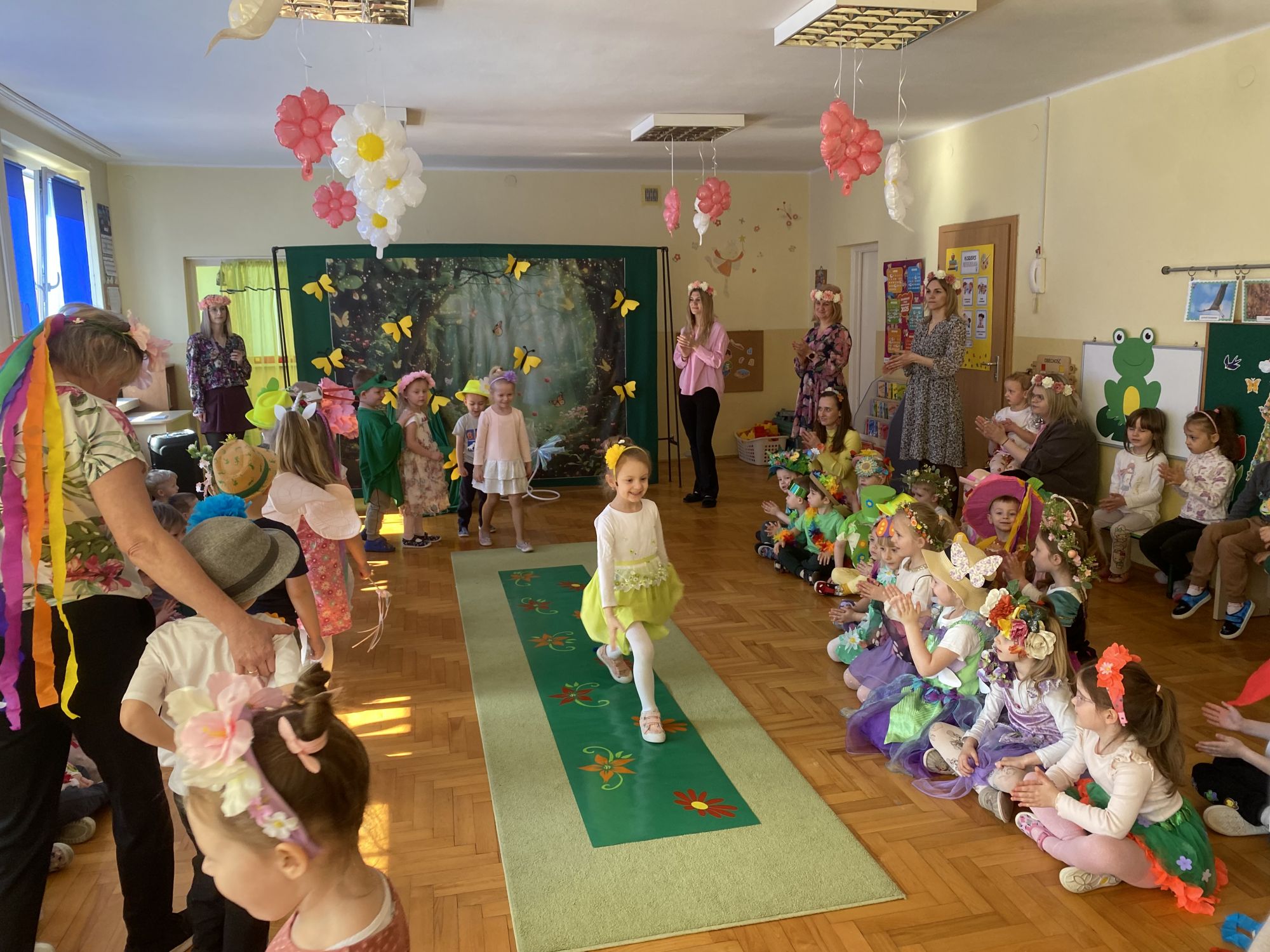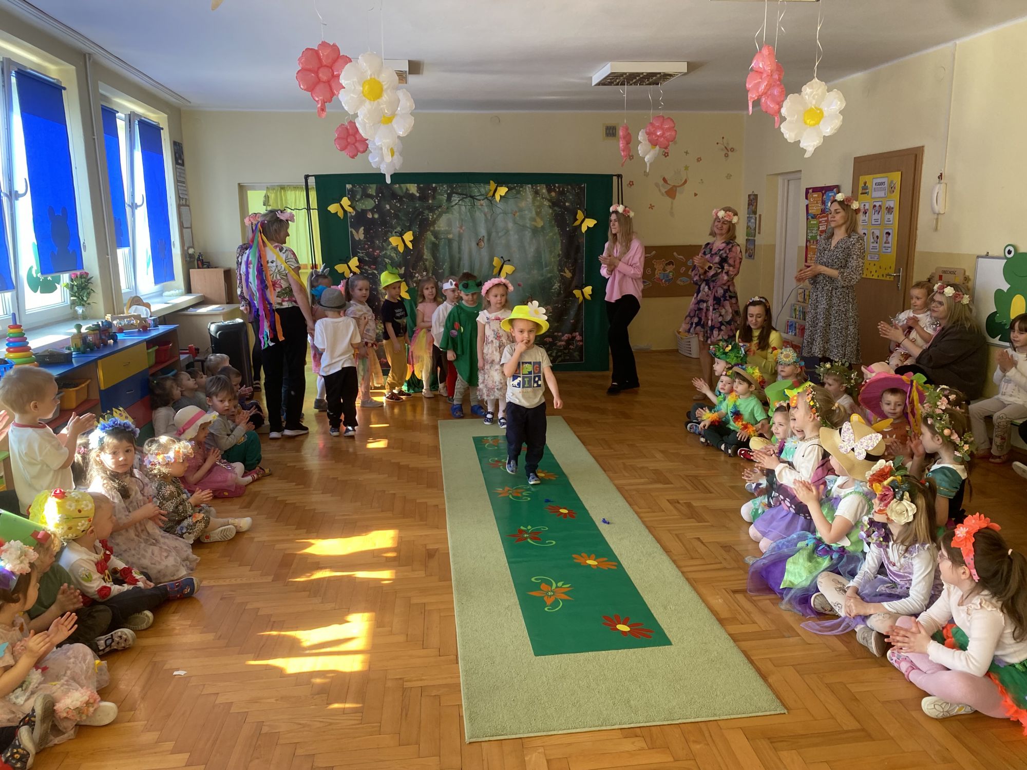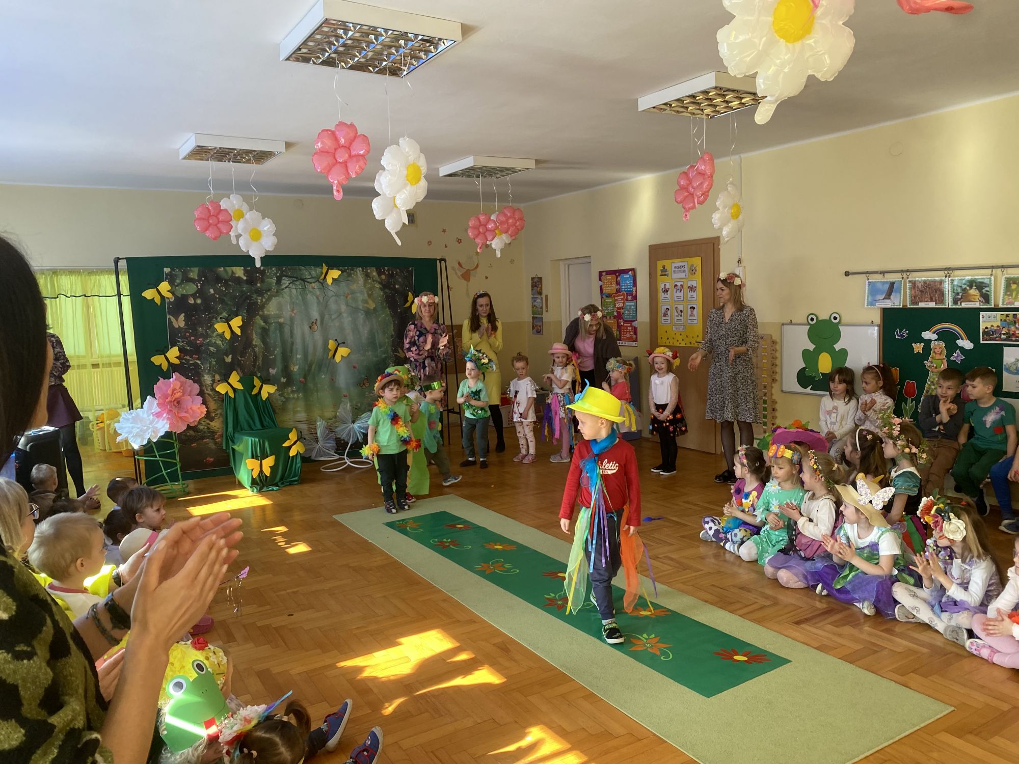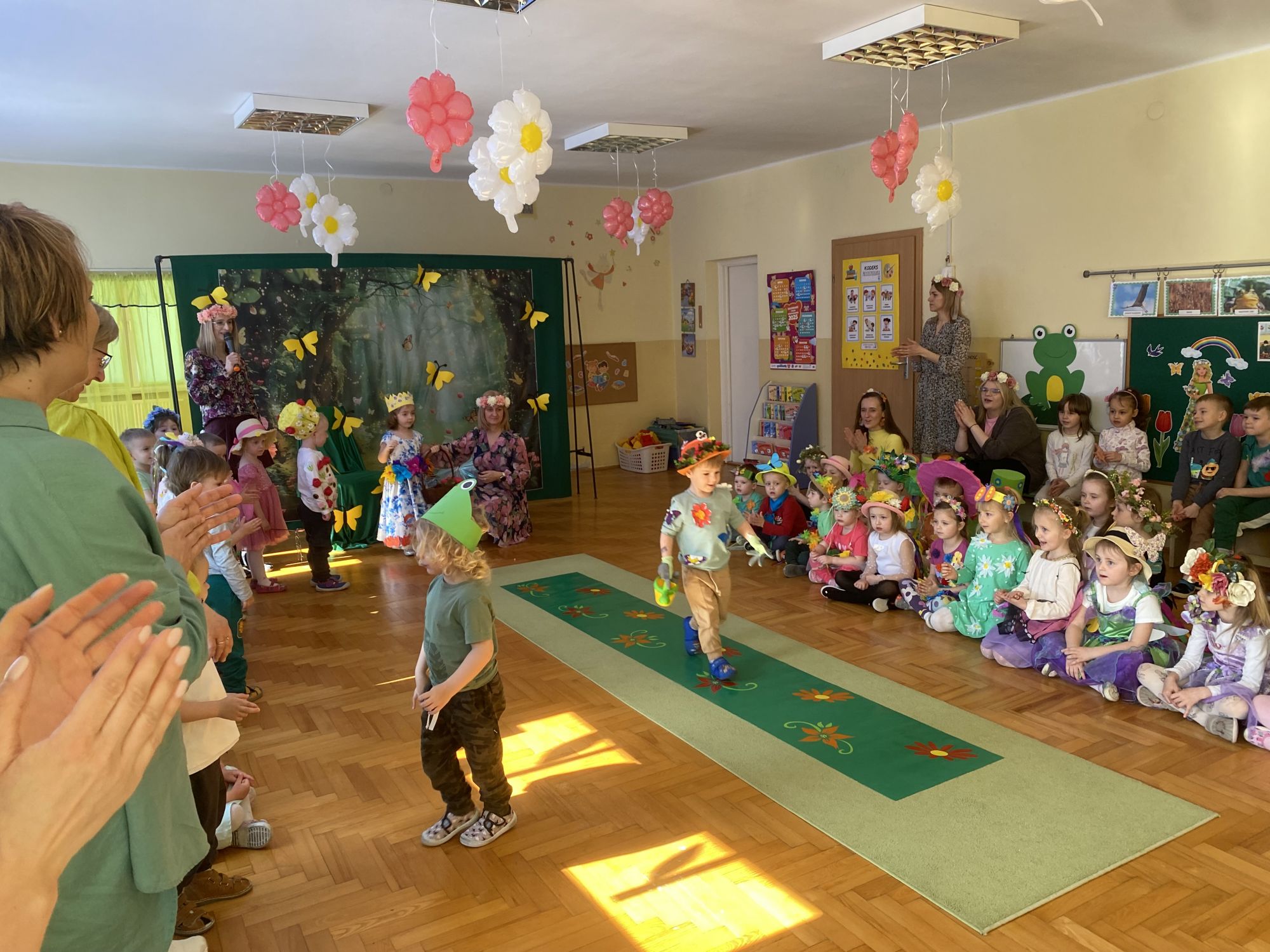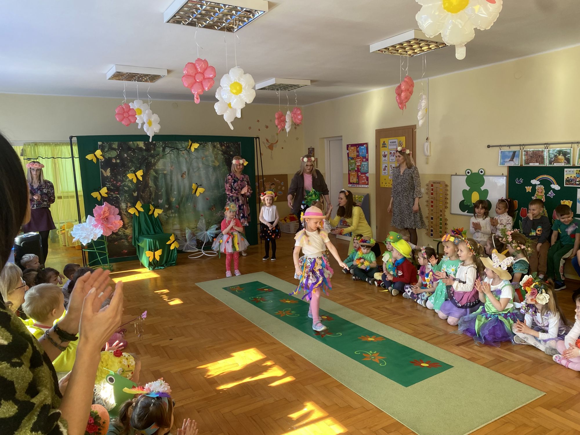Następnie na dzieci czekały wiosenne zagadki oraz wesołe zabawy ruchowe, które wprowadziły wszystkich w doskonały nastrój. Kolejnym, bardzo wyczekiwanym punktem programu był wiosenny pokaz mody. Dzieci, ubrane w kolorowe, pomysłowe stroje inspirowane wiosną, z dumą prezentowały się na zielonym dywanie, wzbudzając zachwyt i ogromne brawa.