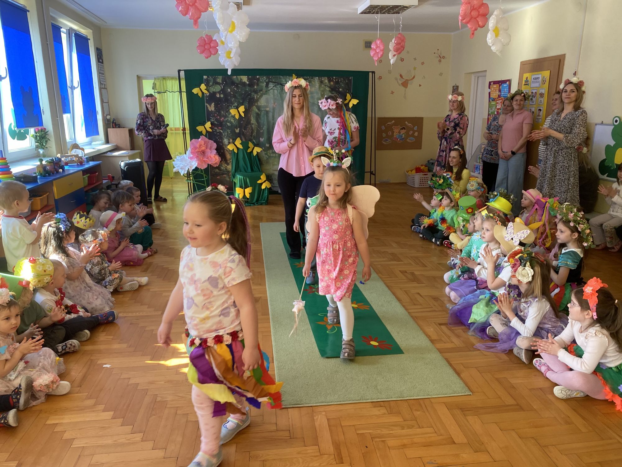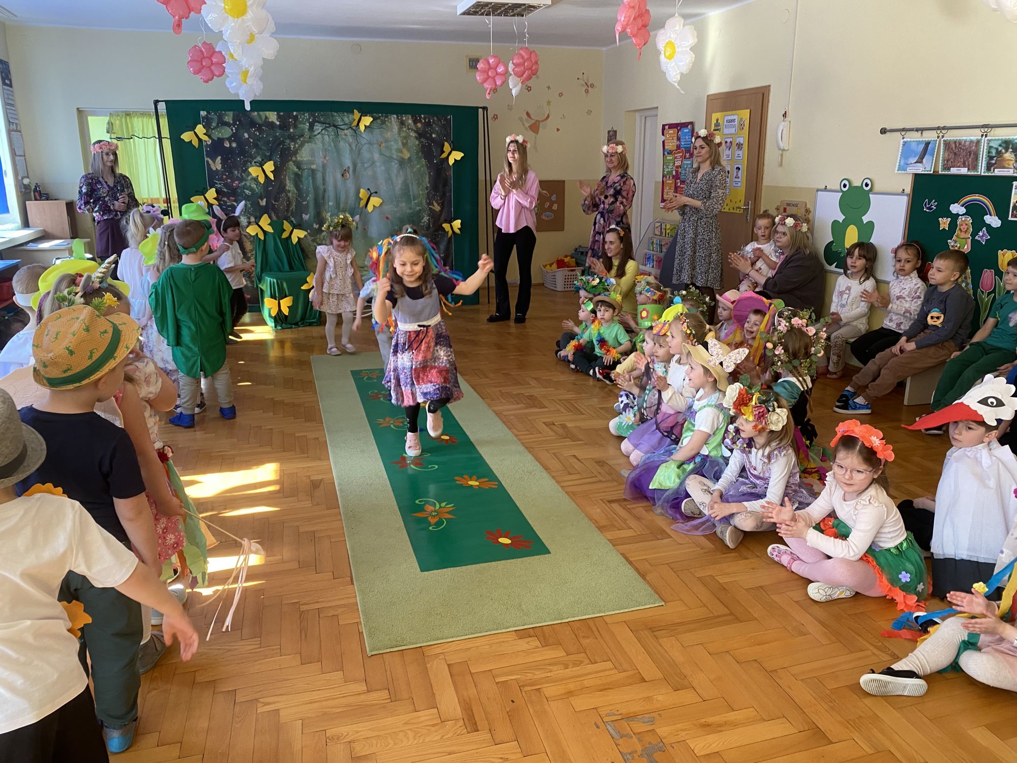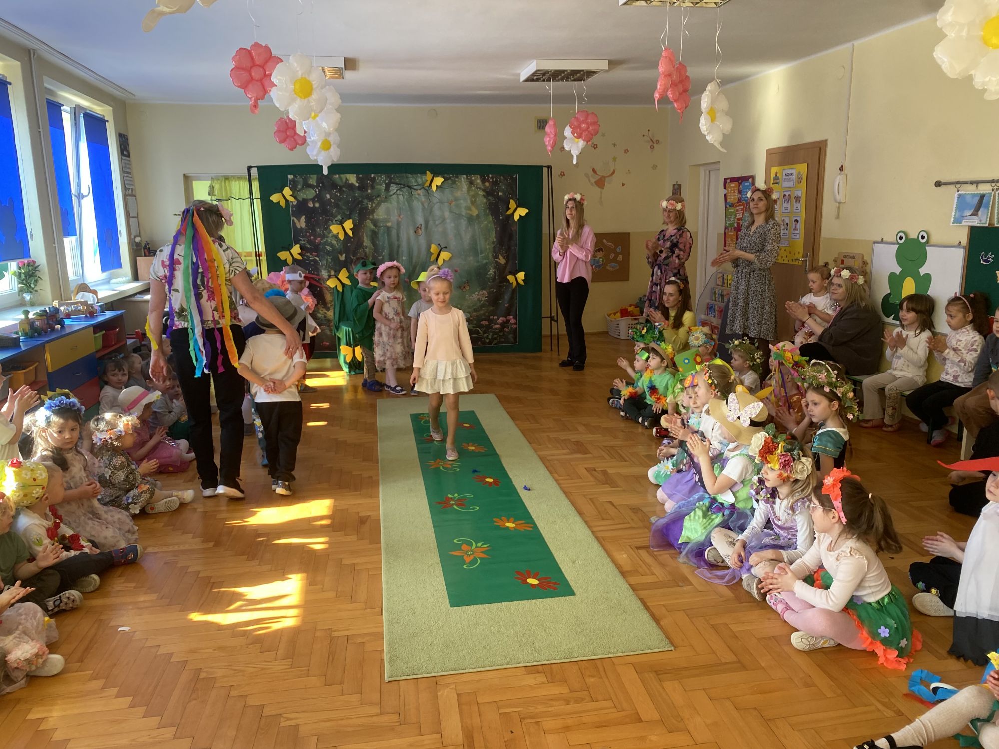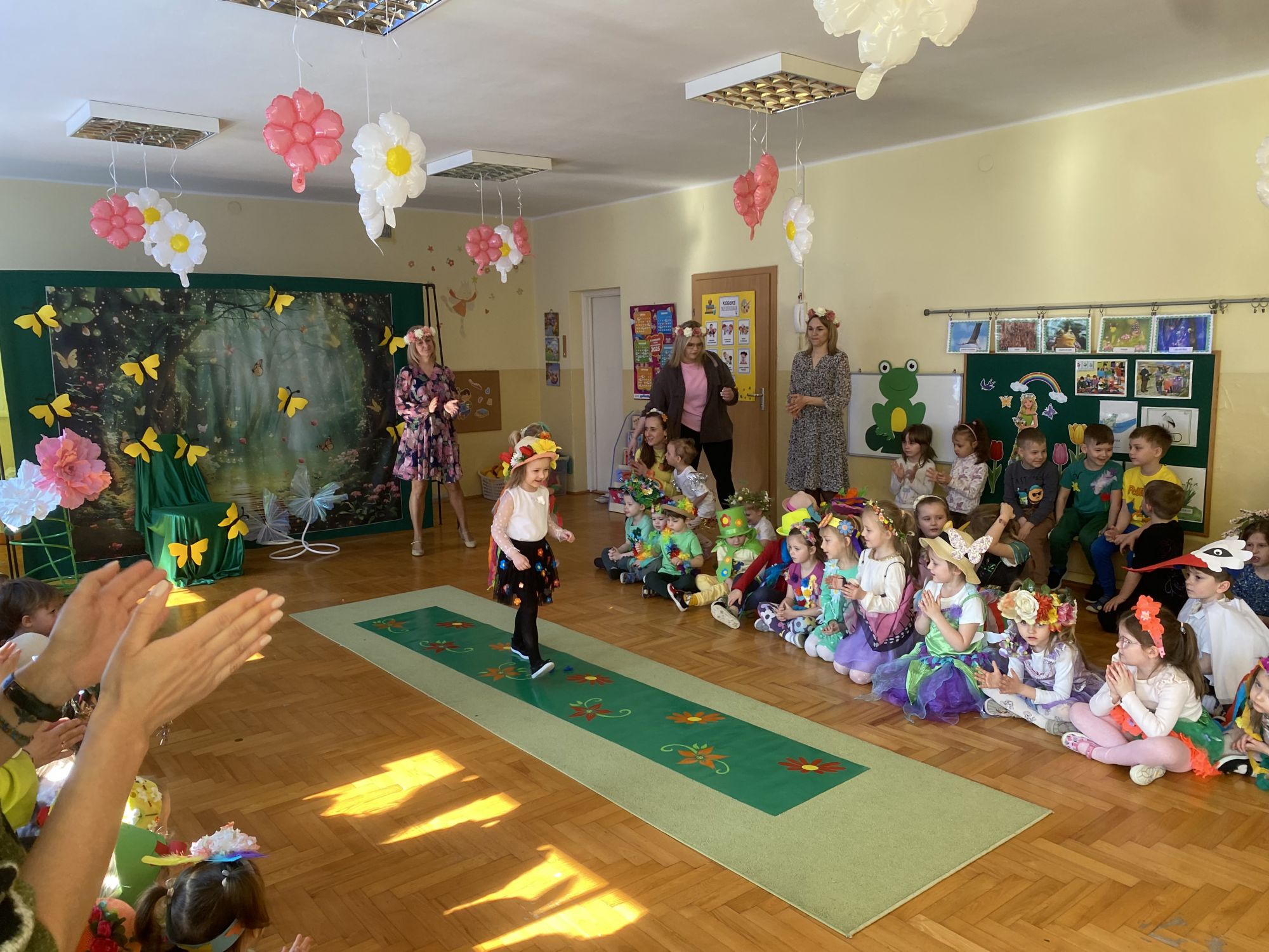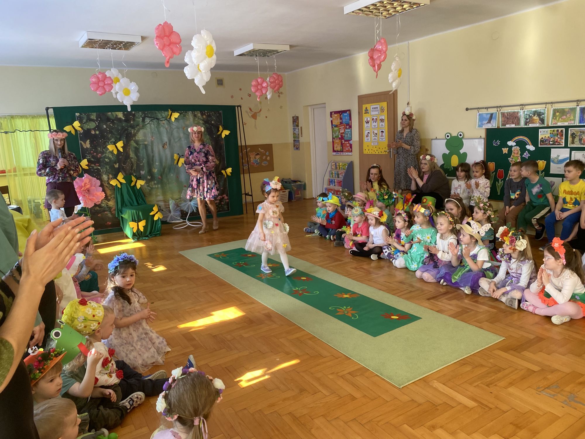 Następnie na dzieci czekały wiosenne zagadki oraz wesołe zabawy ruchowe, które wprowadziły wszystkich w doskonały nastrój. Kolejnym, bardzo wyczekiwanym punktem programu był wiosenny pokaz mody. Dzieci, ubrane w kolorowe, pomysłowe stroje inspirowane wiosną, z dumą prezentowały się na zielonym dywanie, wzbudzając zachwyt i ogromne brawa.