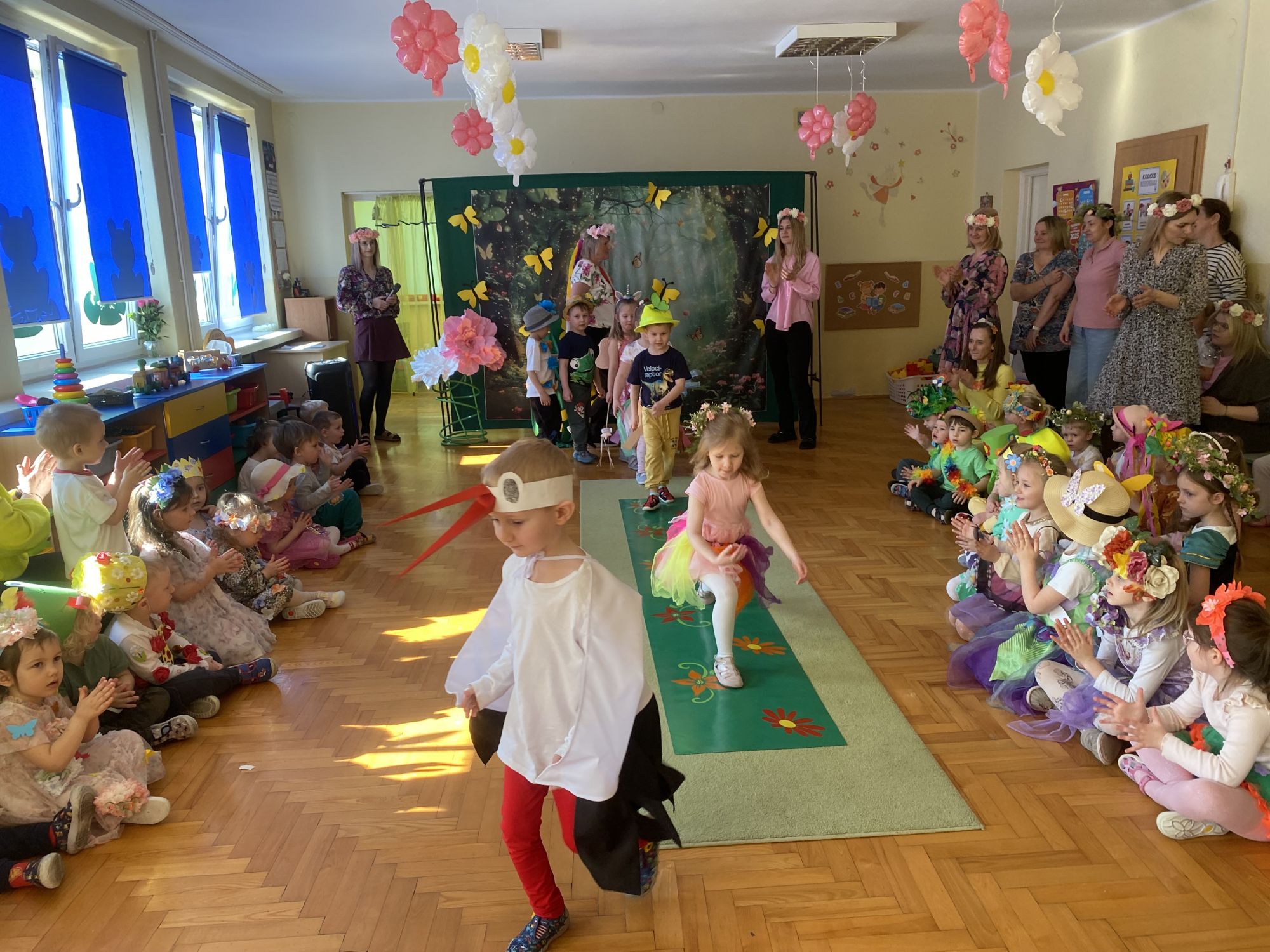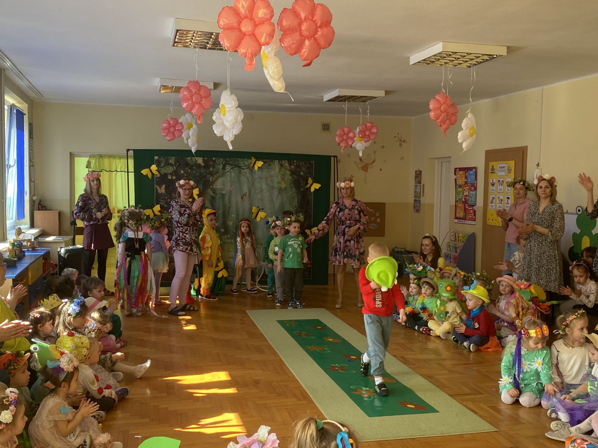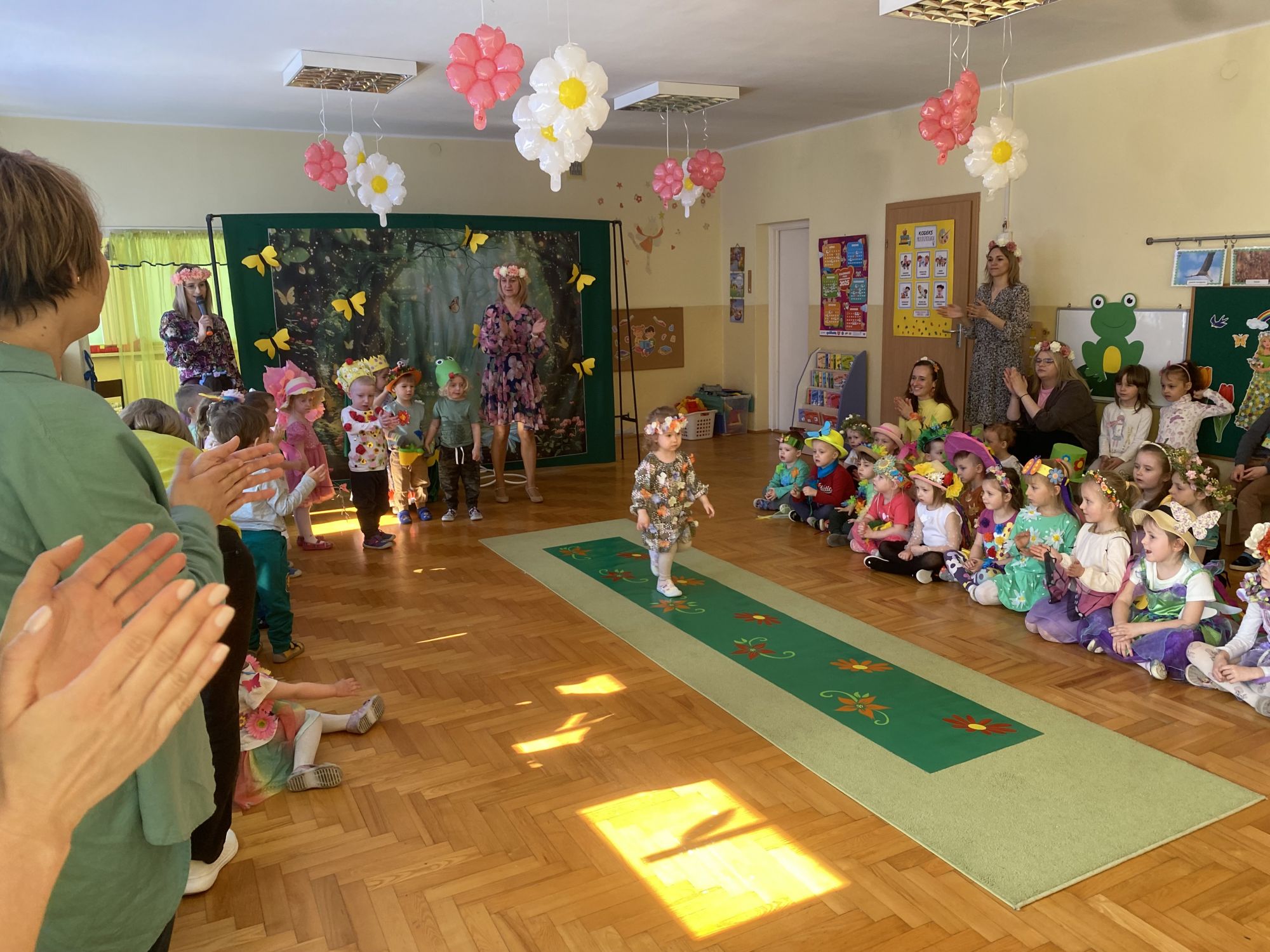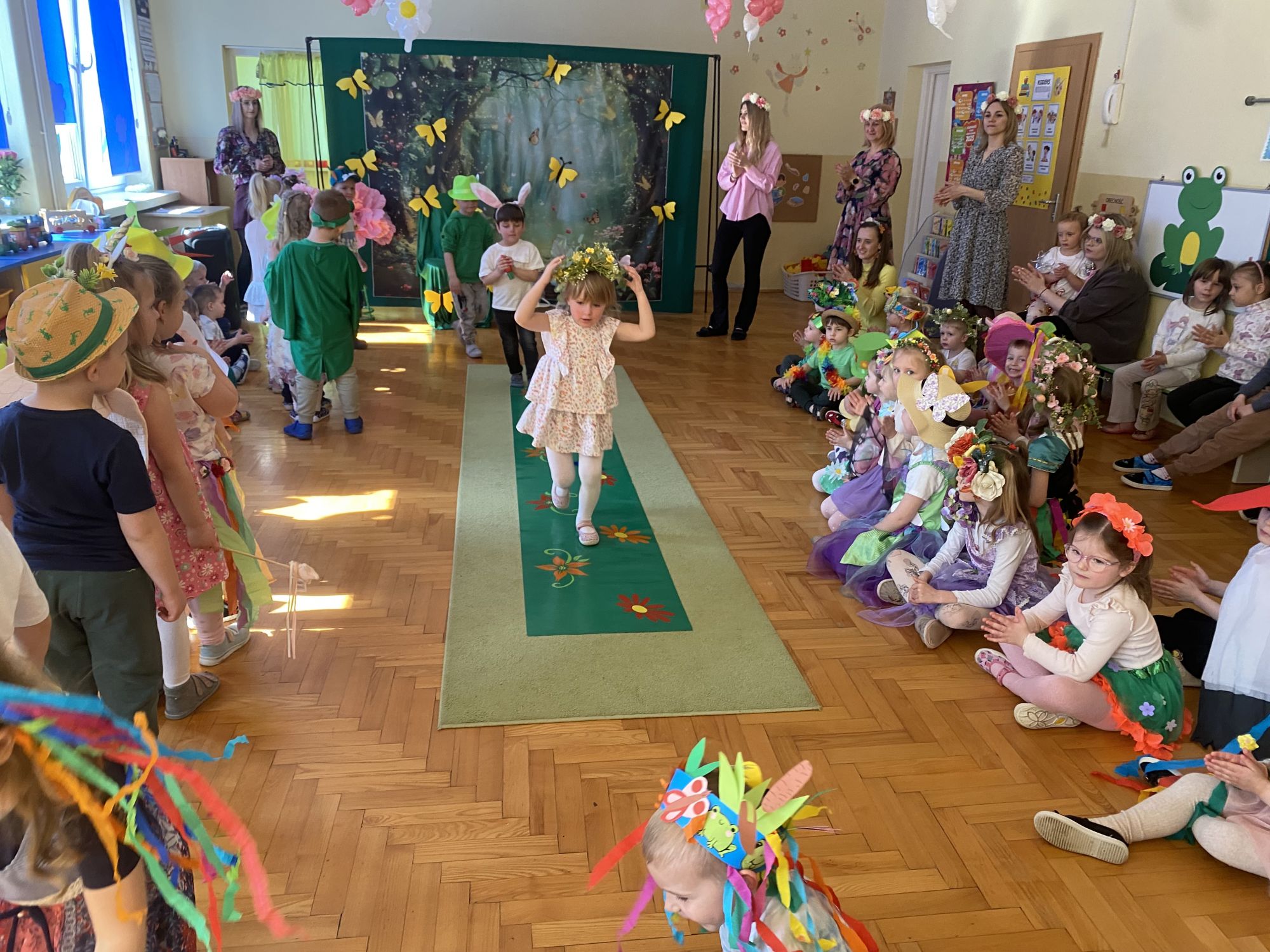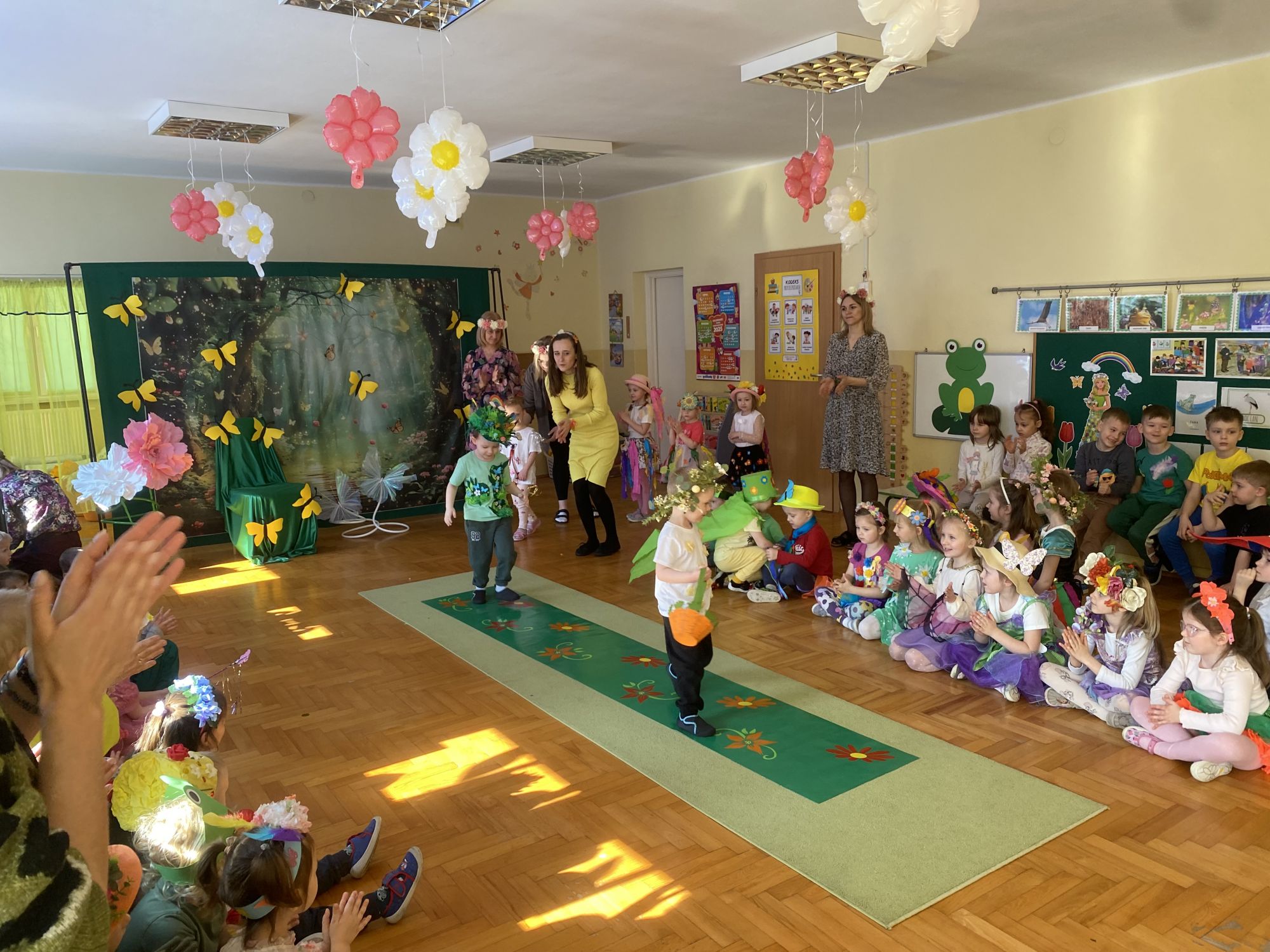 Następnie na dzieci czekały wiosenne zagadki oraz wesołe zabawy ruchowe, które wprowadziły wszystkich w doskonały nastrój. Kolejnym, bardzo wyczekiwanym punktem programu był wiosenny pokaz mody. Dzieci, ubrane w kolorowe, pomysłowe stroje inspirowane wiosną, z dumą prezentowały się na zielonym dywanie, wzbudzając zachwyt i ogromne brawa.