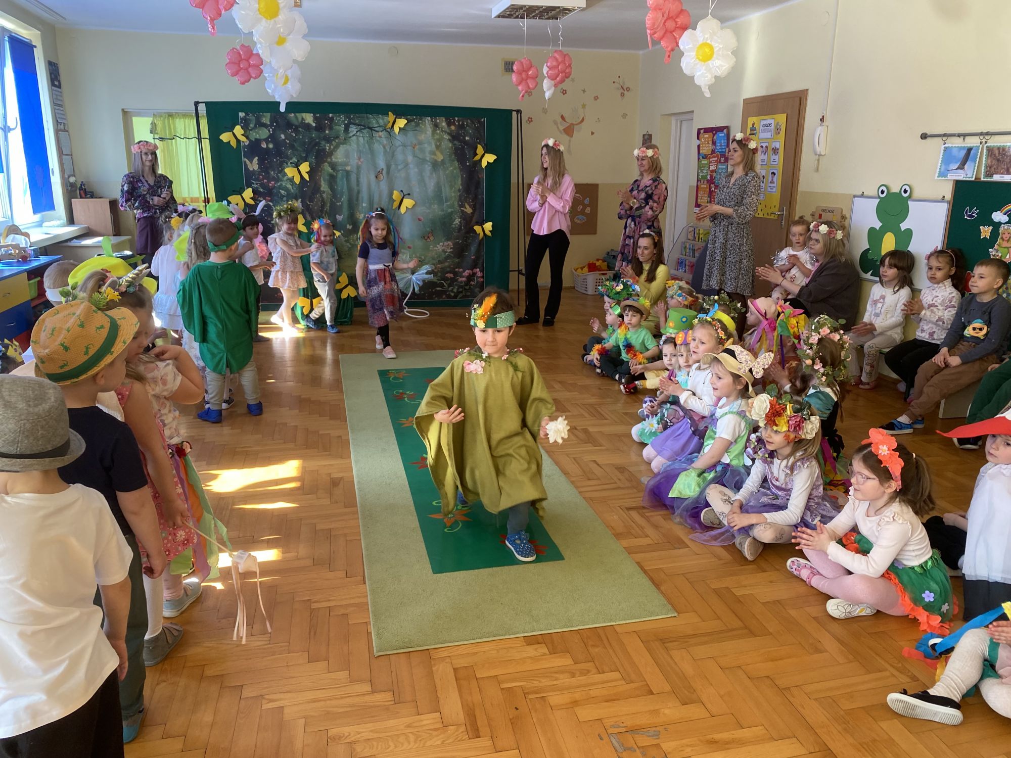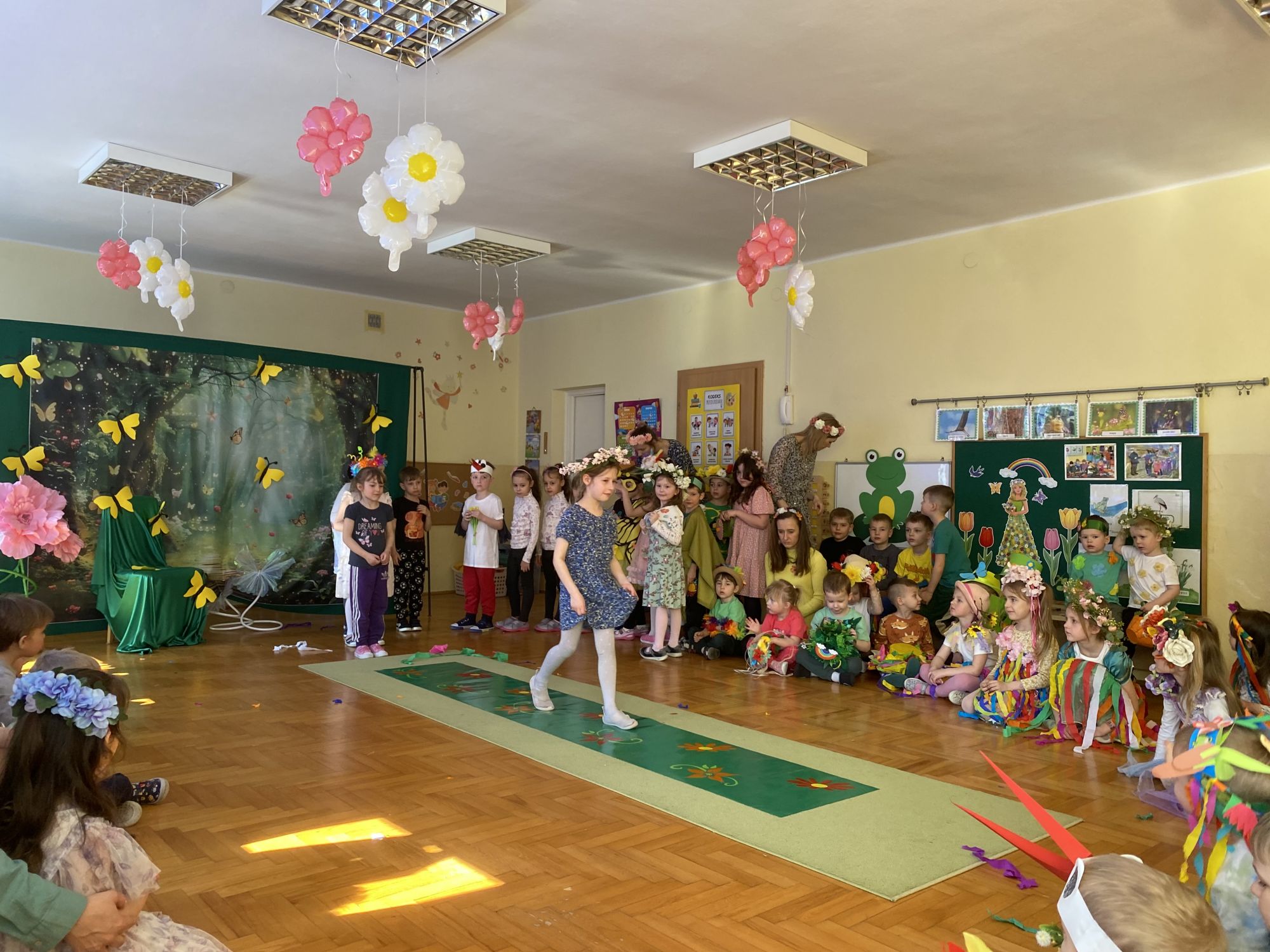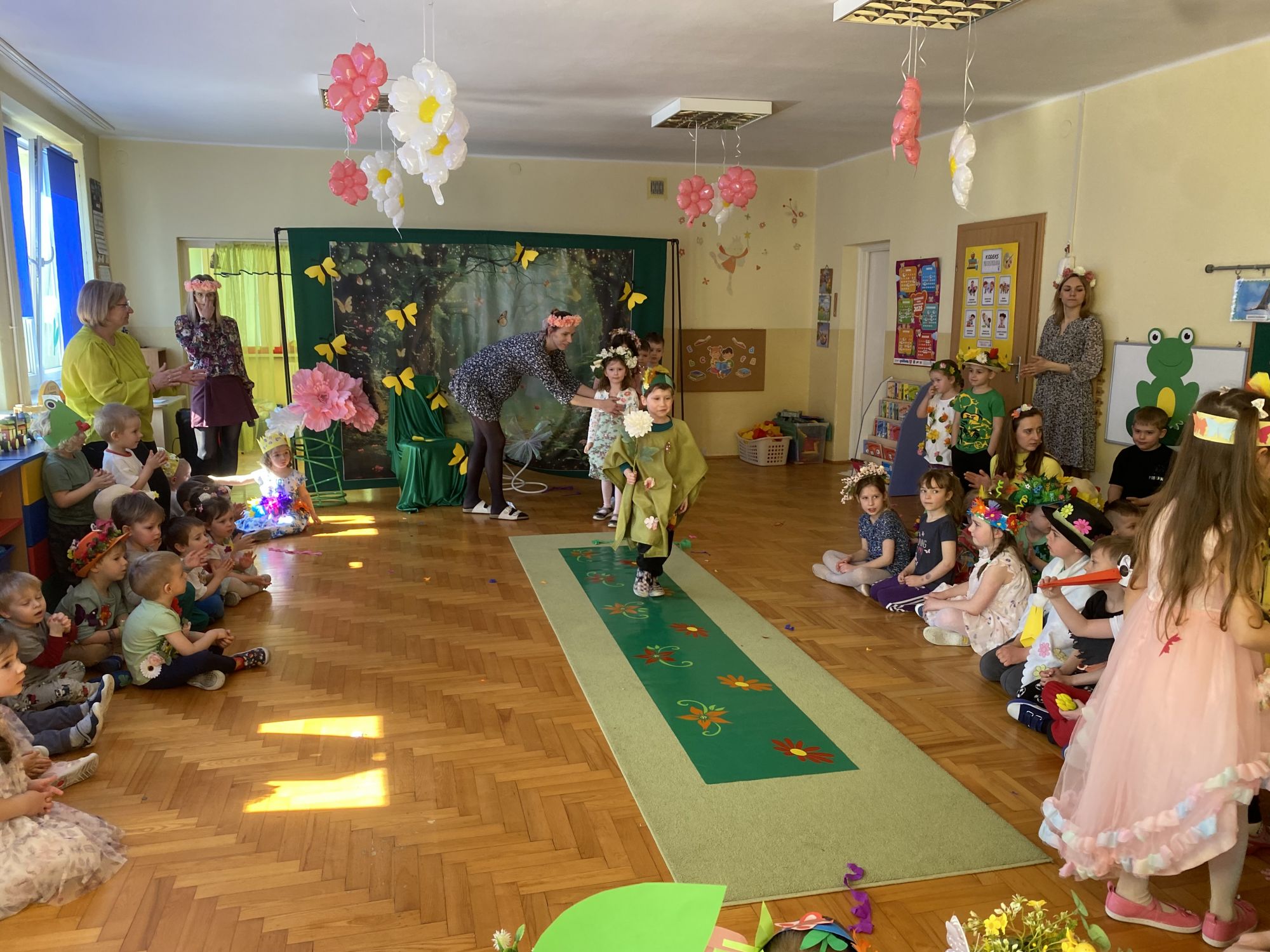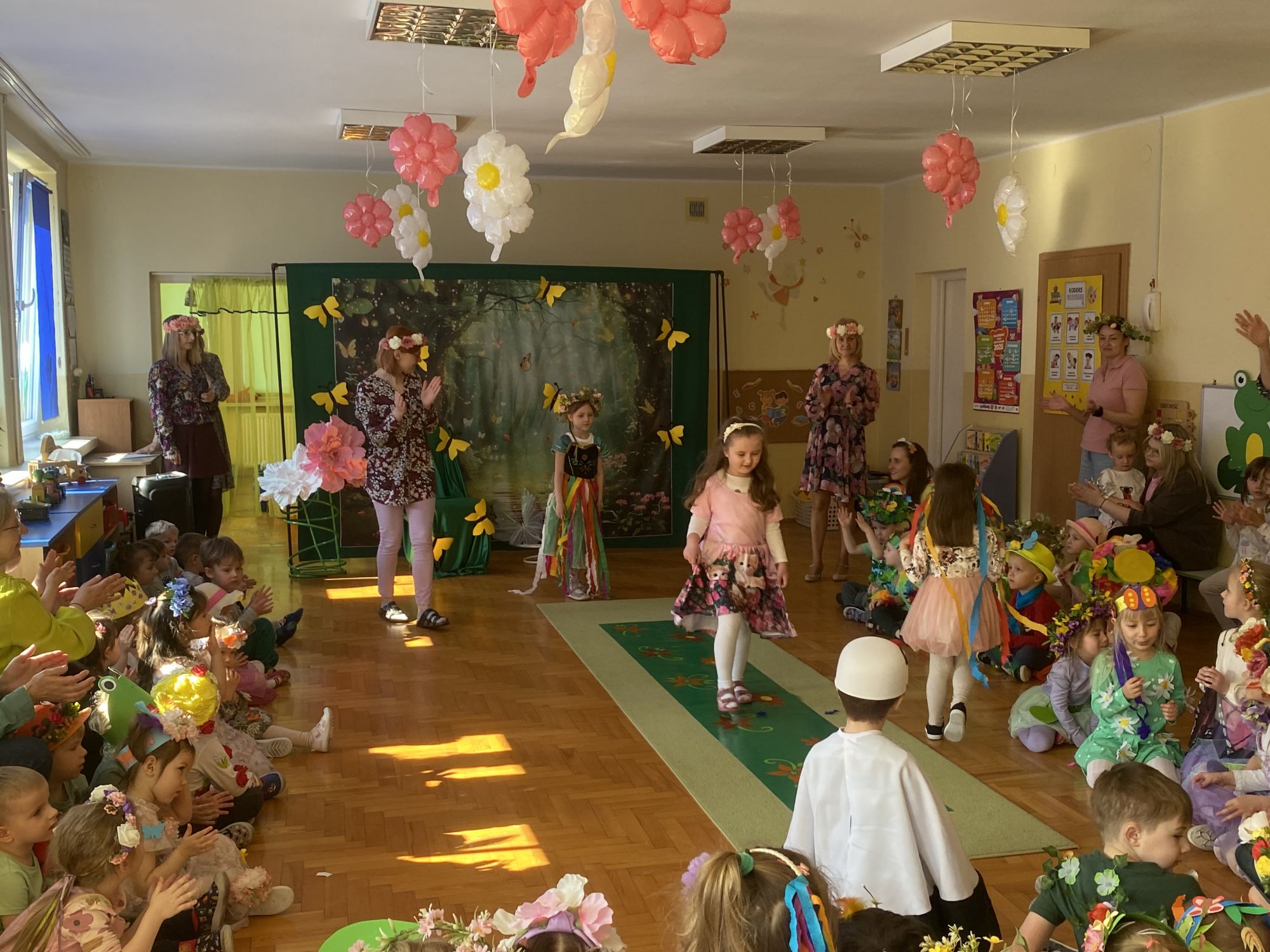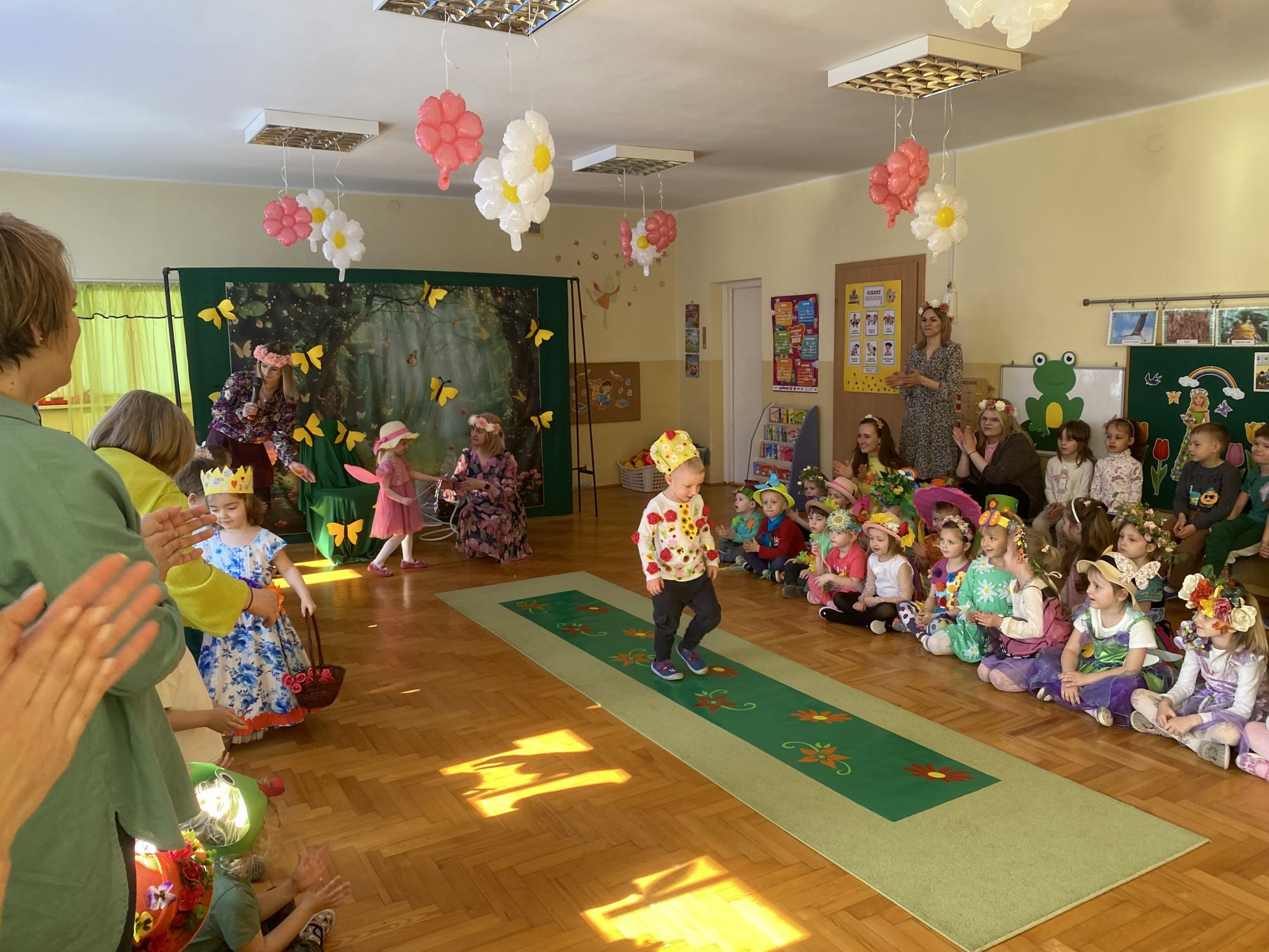 Następnie na dzieci czekały wiosenne zagadki oraz wesołe zabawy ruchowe, które wprowadziły wszystkich w doskonały nastrój. Kolejnym, bardzo wyczekiwanym punktem programu był wiosenny pokaz mody. Dzieci, ubrane w kolorowe, pomysłowe stroje inspirowane wiosną, z dumą prezentowały się na zielonym dywanie, wzbudzając zachwyt i ogromne brawa.