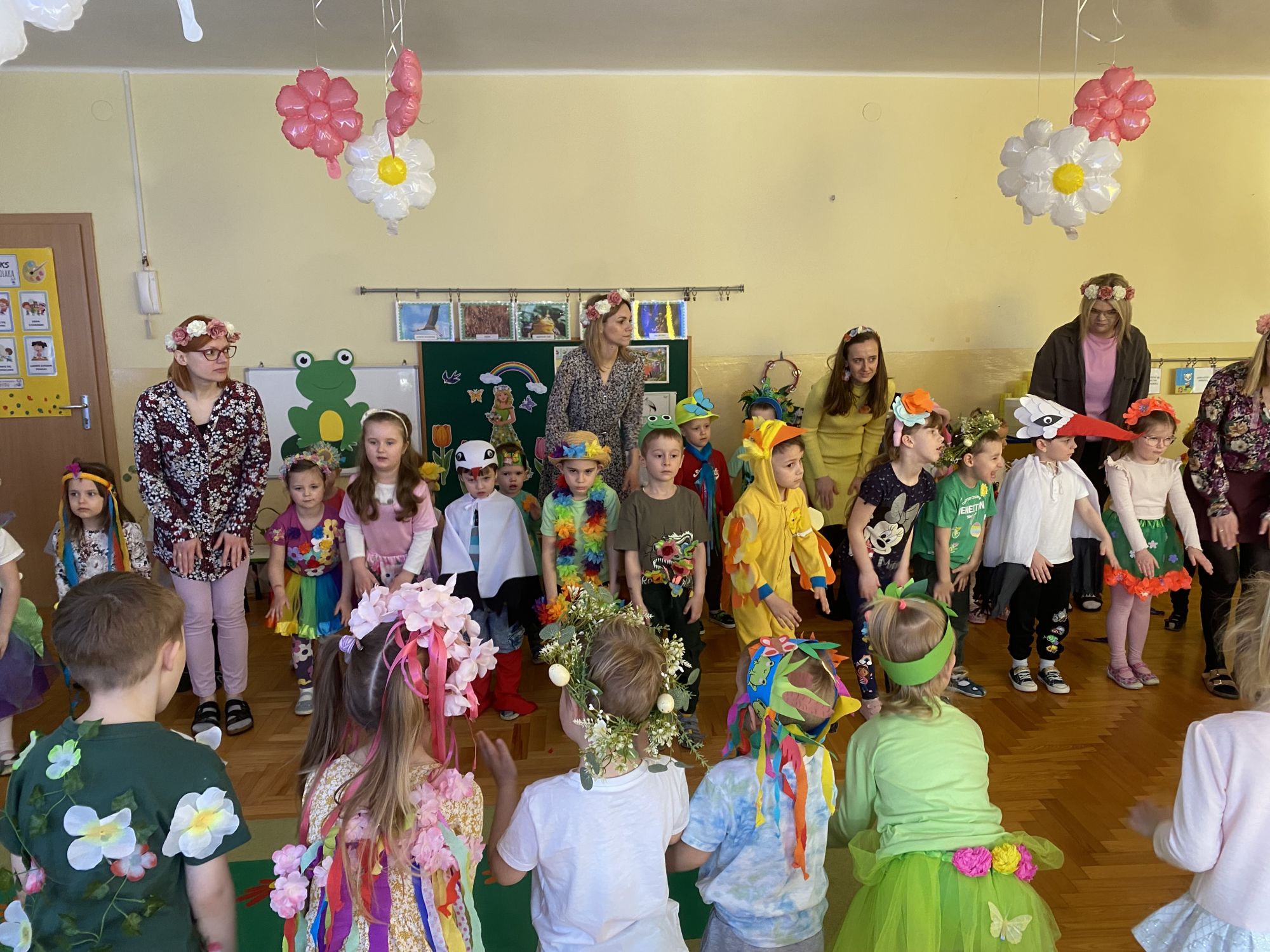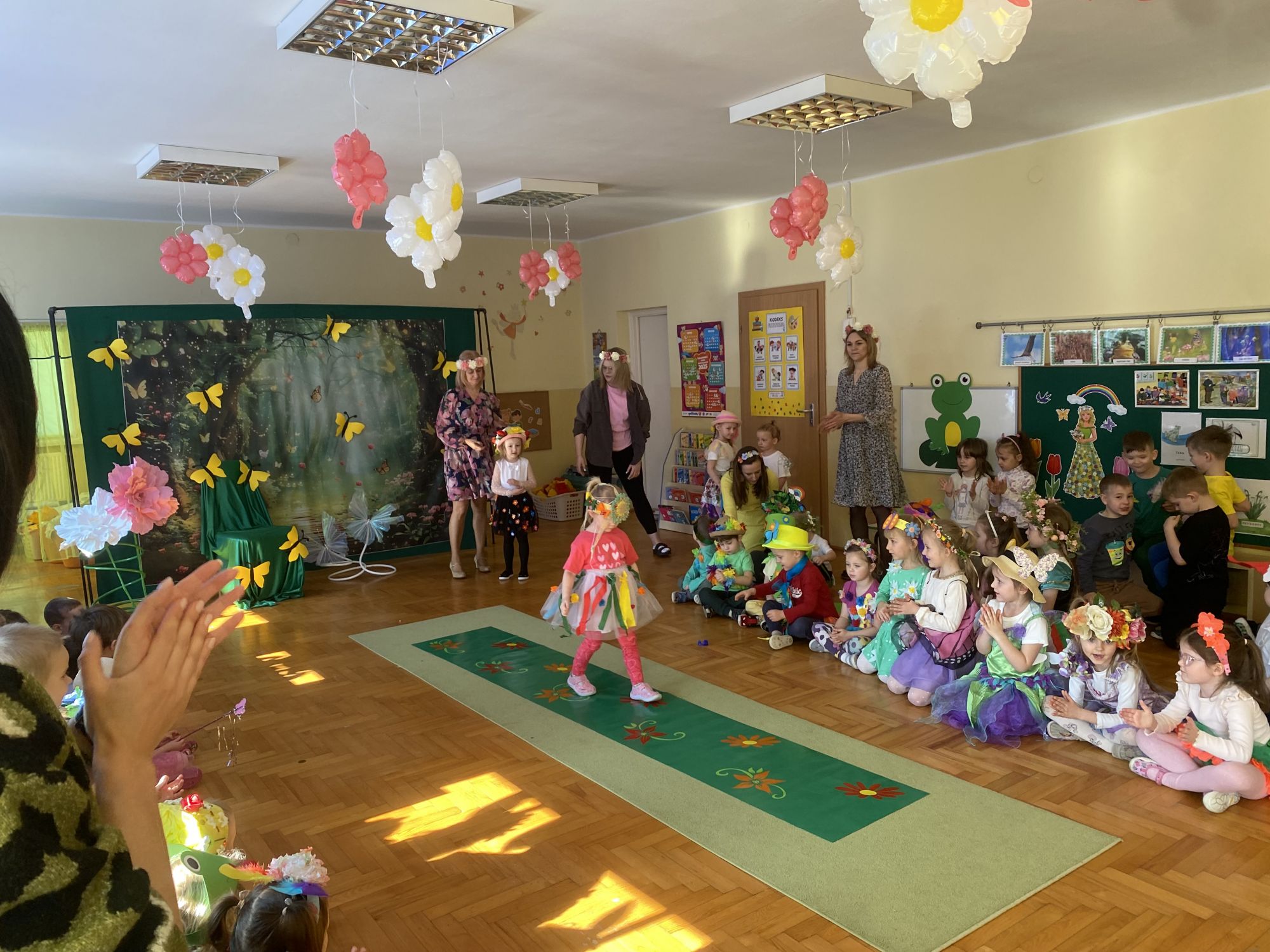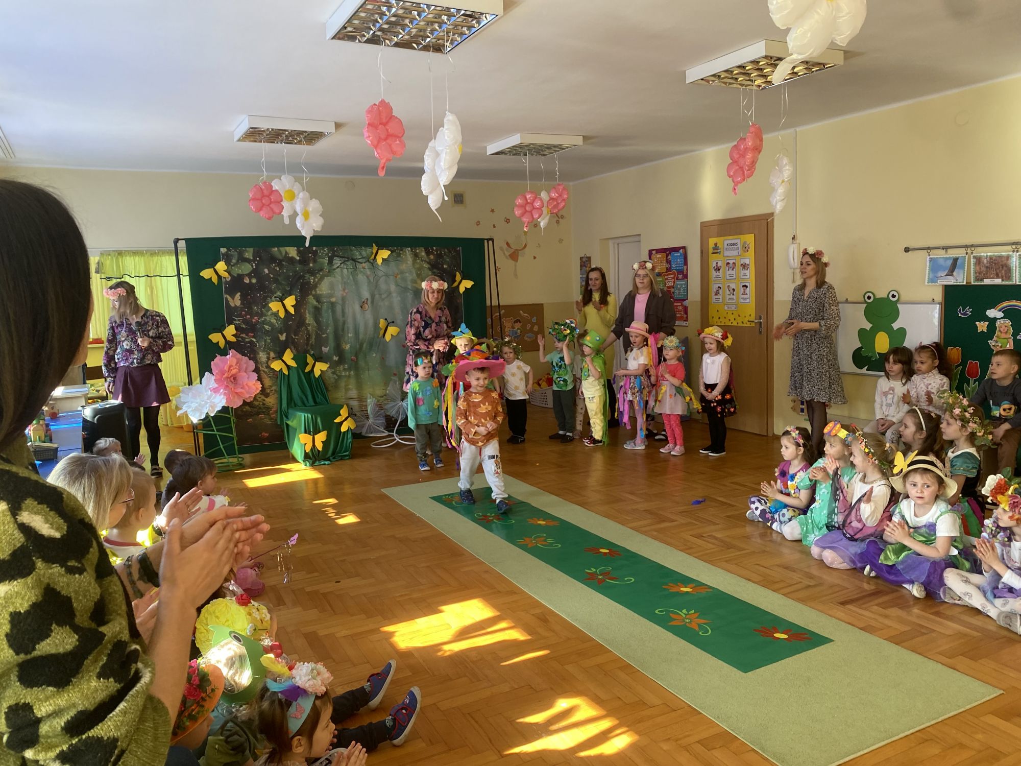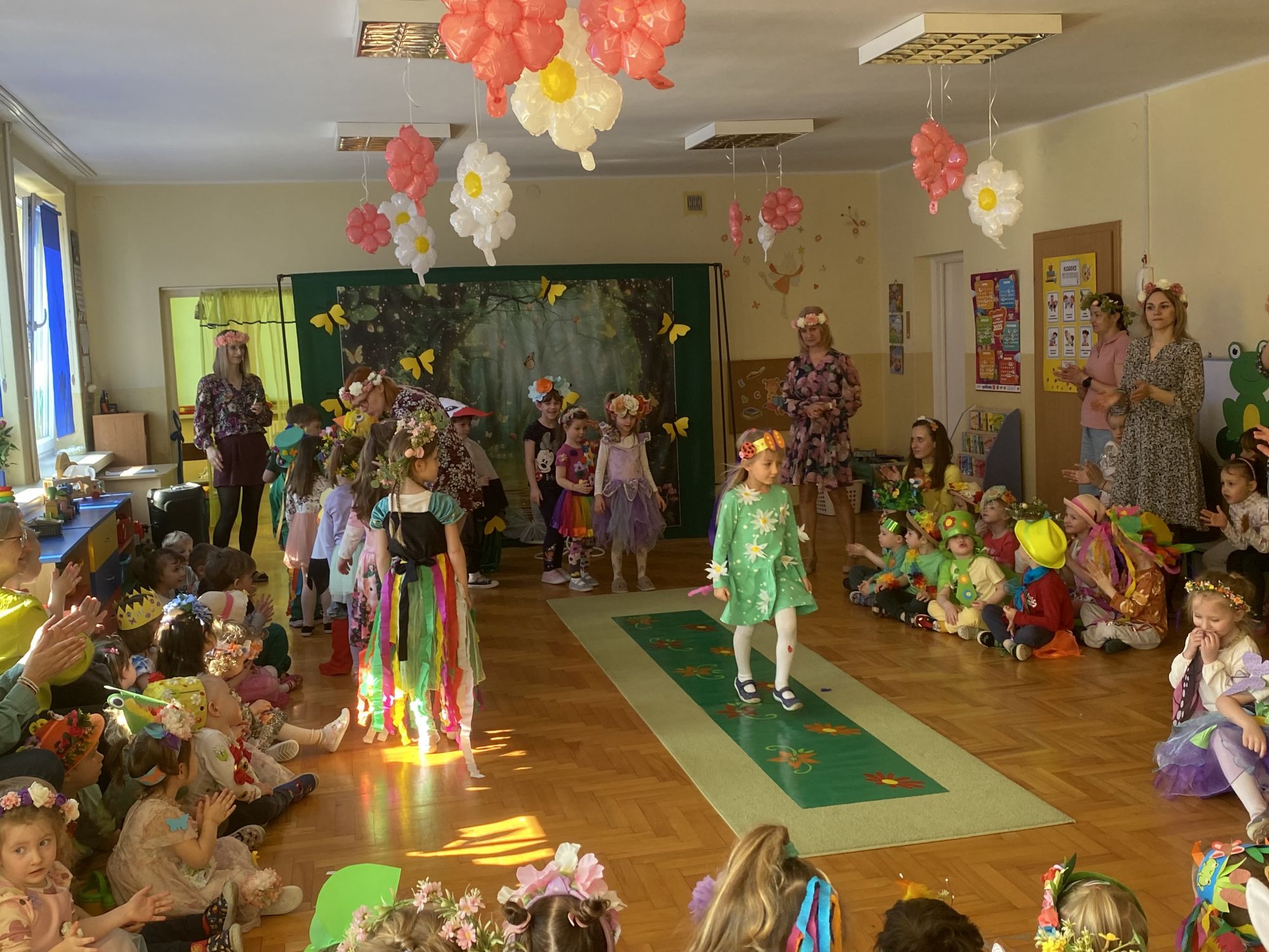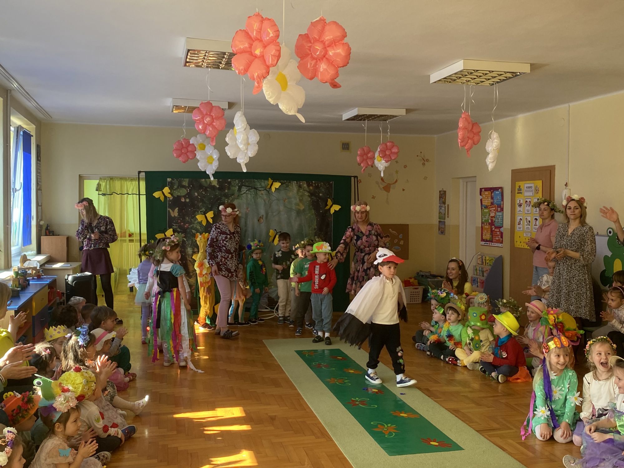 Następnie na dzieci czekały wiosenne zagadki oraz wesołe zabawy ruchowe, które wprowadziły wszystkich w doskonały nastrój. Kolejnym, bardzo wyczekiwanym punktem programu był wiosenny pokaz mody. Dzieci, ubrane w kolorowe, pomysłowe stroje inspirowane wiosną, z dumą prezentowały się na zielonym dywanie, wzbudzając zachwyt i ogromne brawa.