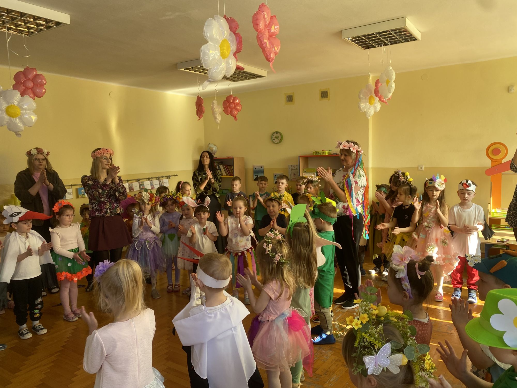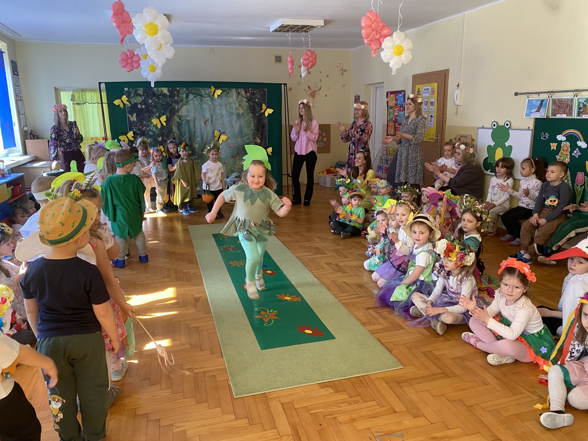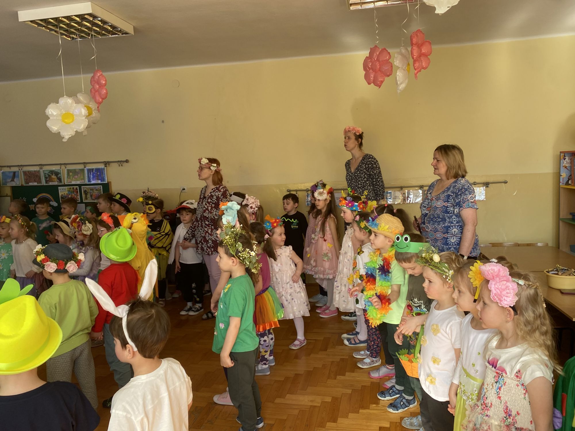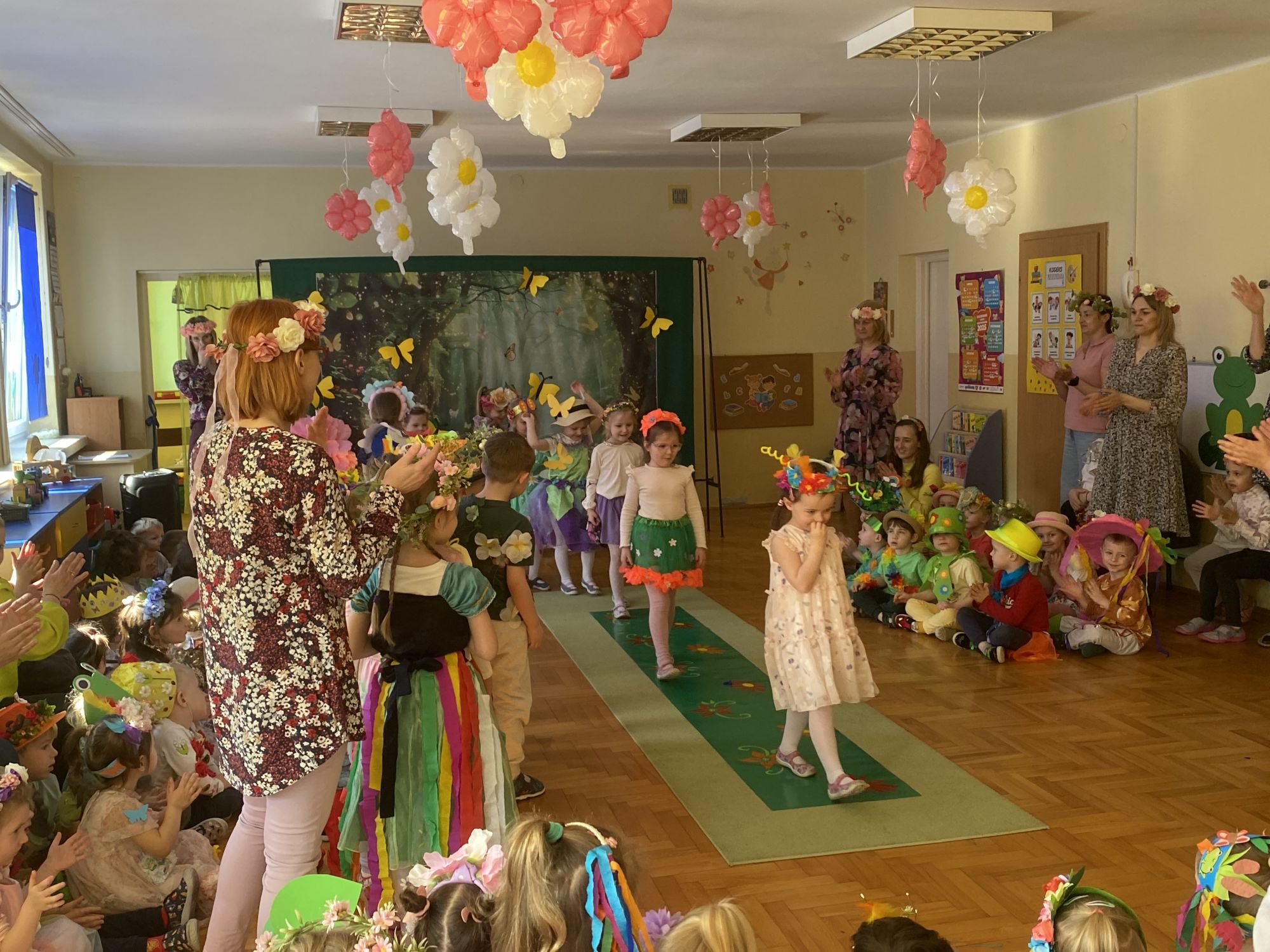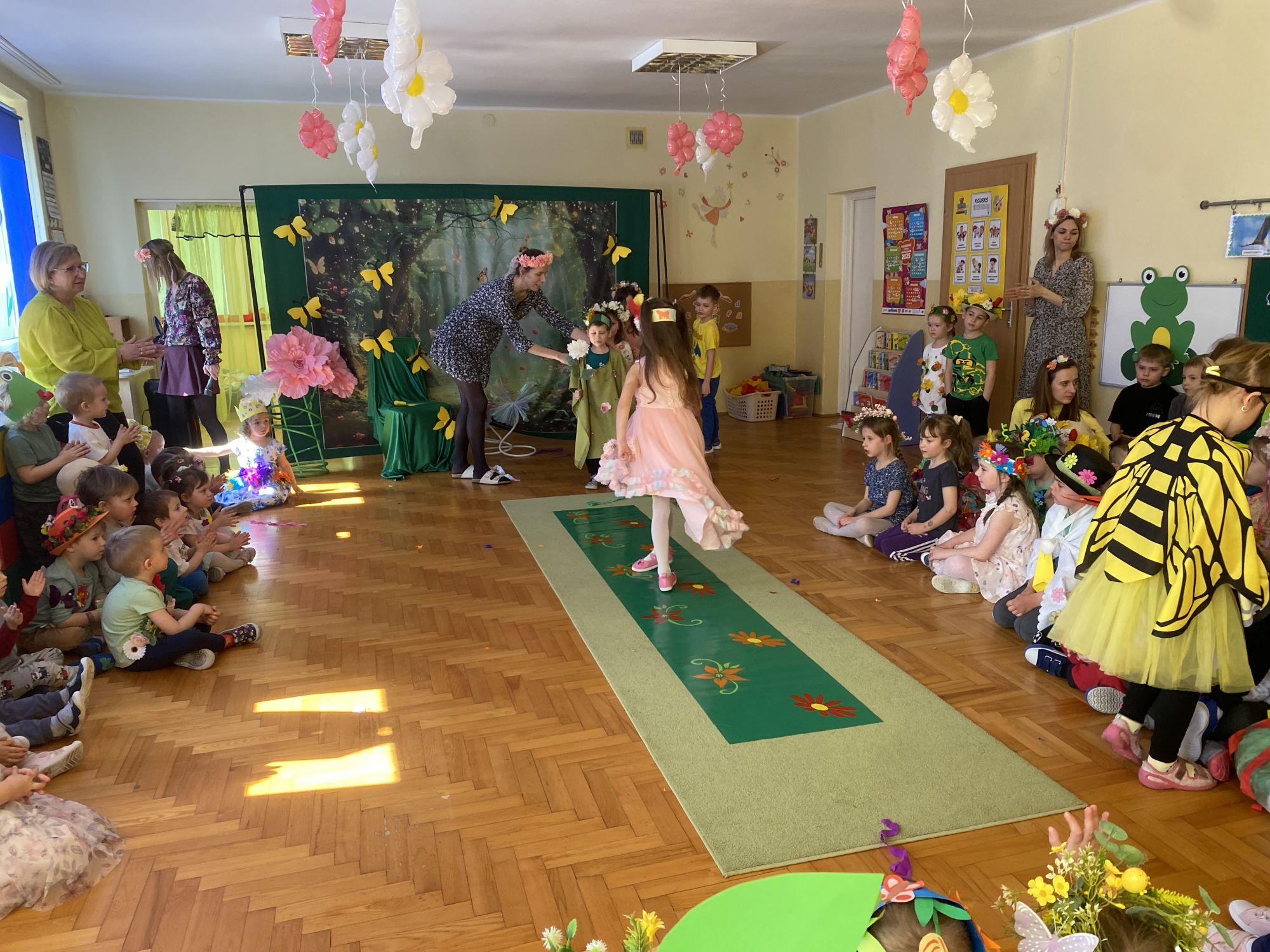 Następnie na dzieci czekały wiosenne zagadki oraz wesołe zabawy ruchowe, które wprowadziły wszystkich w doskonały nastrój. Kolejnym, bardzo wyczekiwanym punktem programu był wiosenny pokaz mody. Dzieci, ubrane w kolorowe, pomysłowe stroje inspirowane wiosną, z dumą prezentowały się na zielonym dywanie, wzbudzając zachwyt i ogromne brawa.