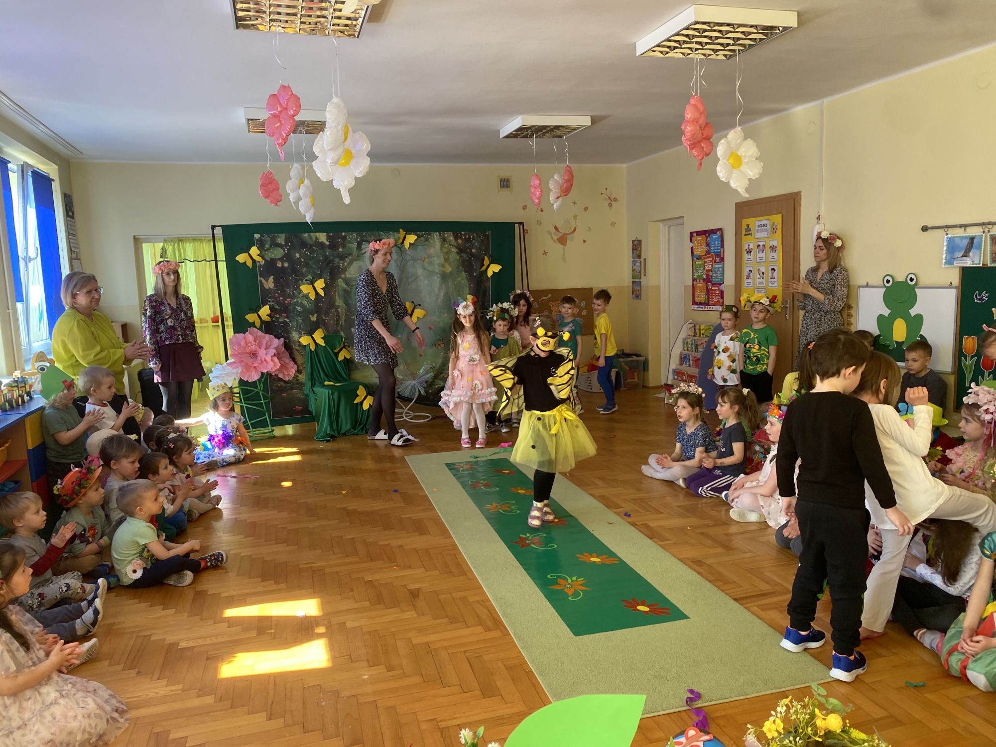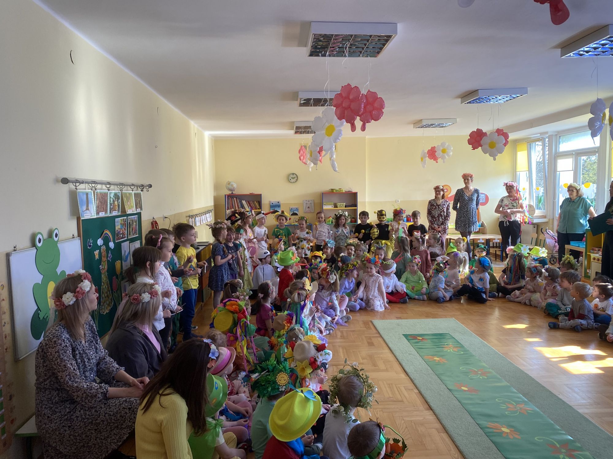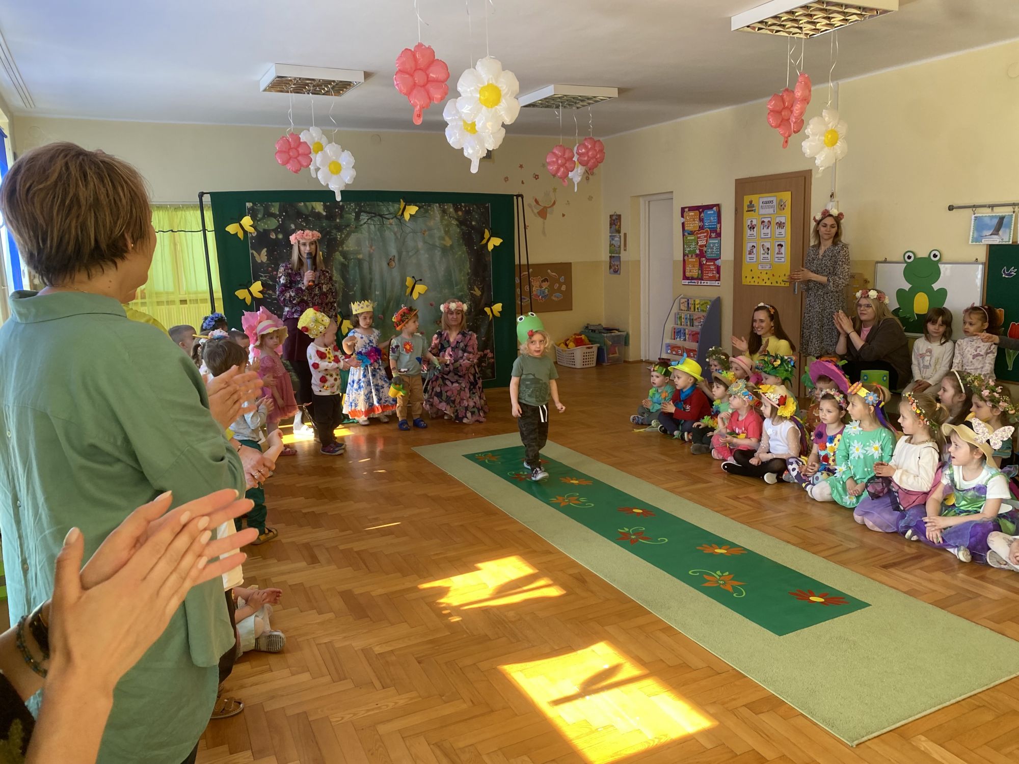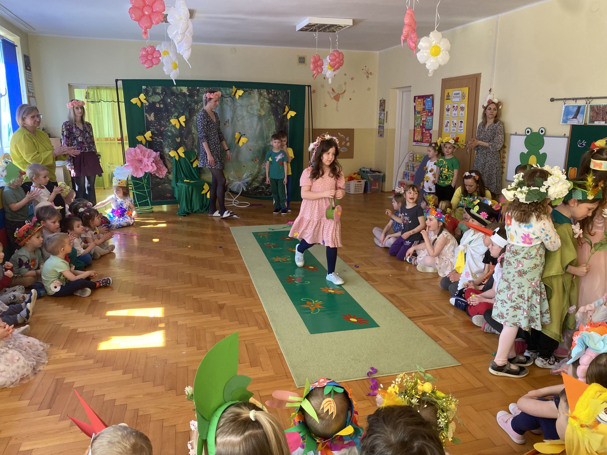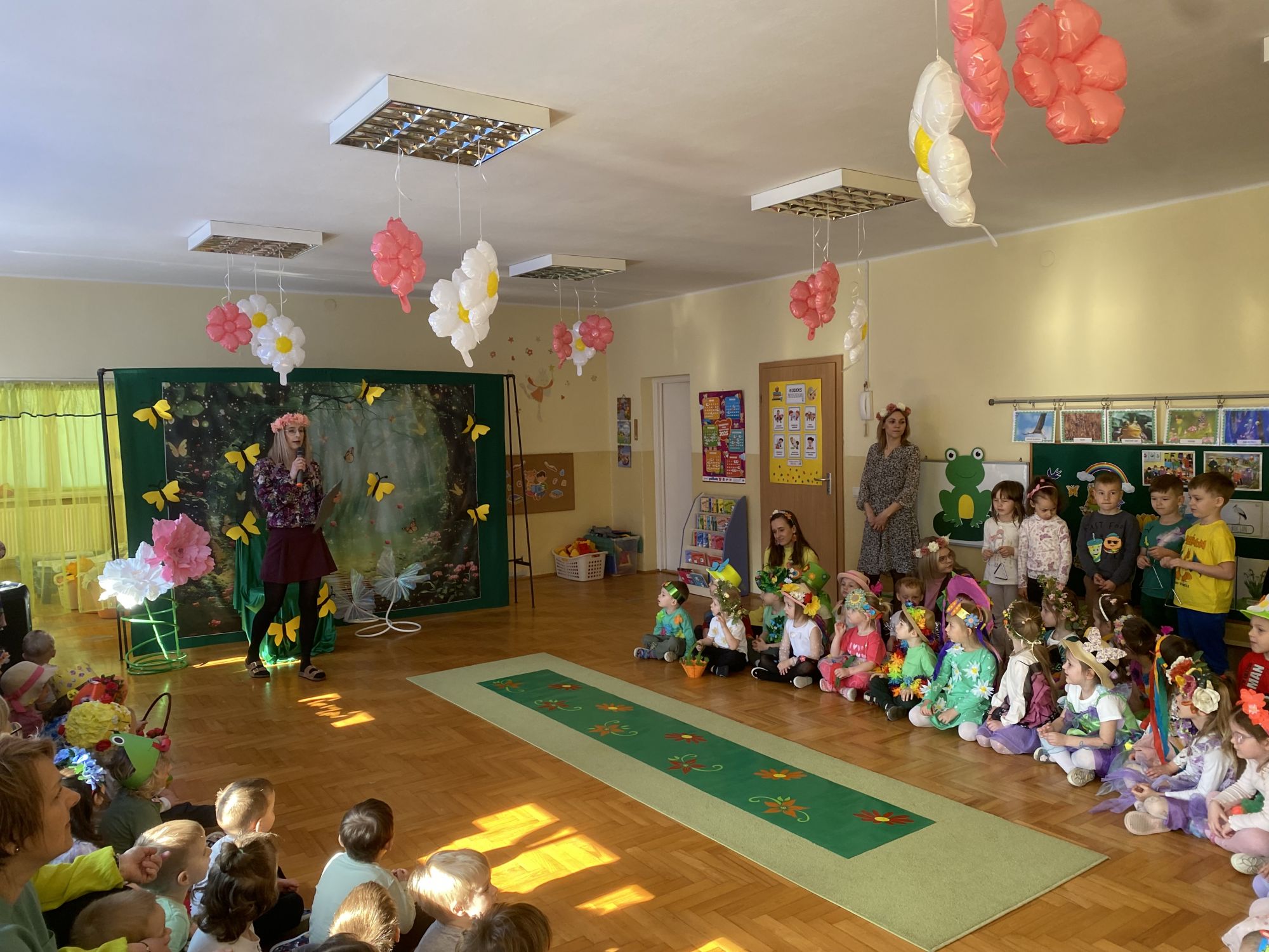 Następnie na dzieci czekały wiosenne zagadki oraz wesołe zabawy ruchowe, które wprowadziły wszystkich w doskonały nastrój. Kolejnym, bardzo wyczekiwanym punktem programu był wiosenny pokaz mody. Dzieci, ubrane w kolorowe, pomysłowe stroje inspirowane wiosną, z dumą prezentowały się na zielonym dywanie, wzbudzając zachwyt i ogromne brawa.