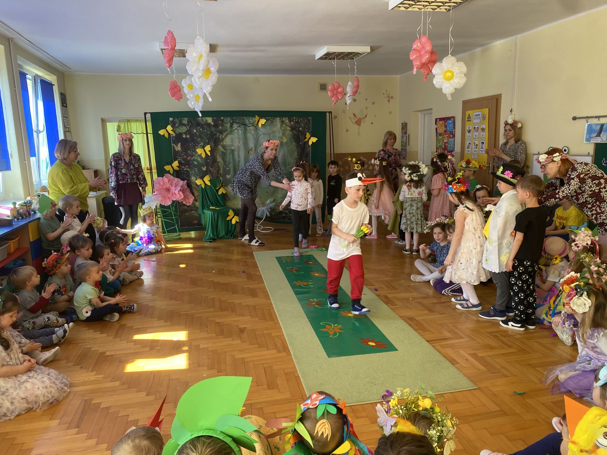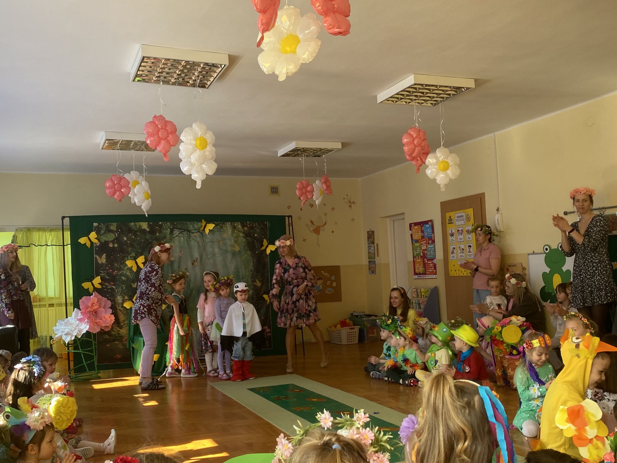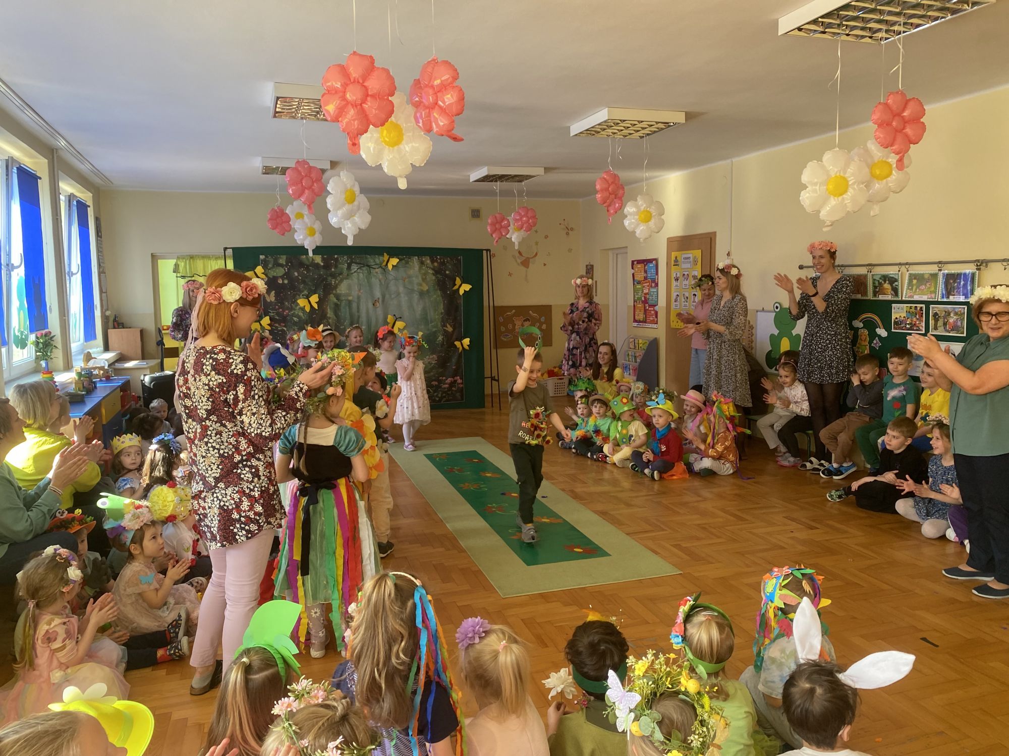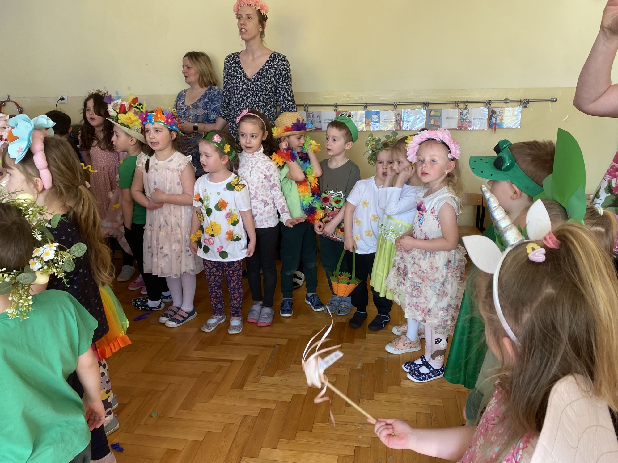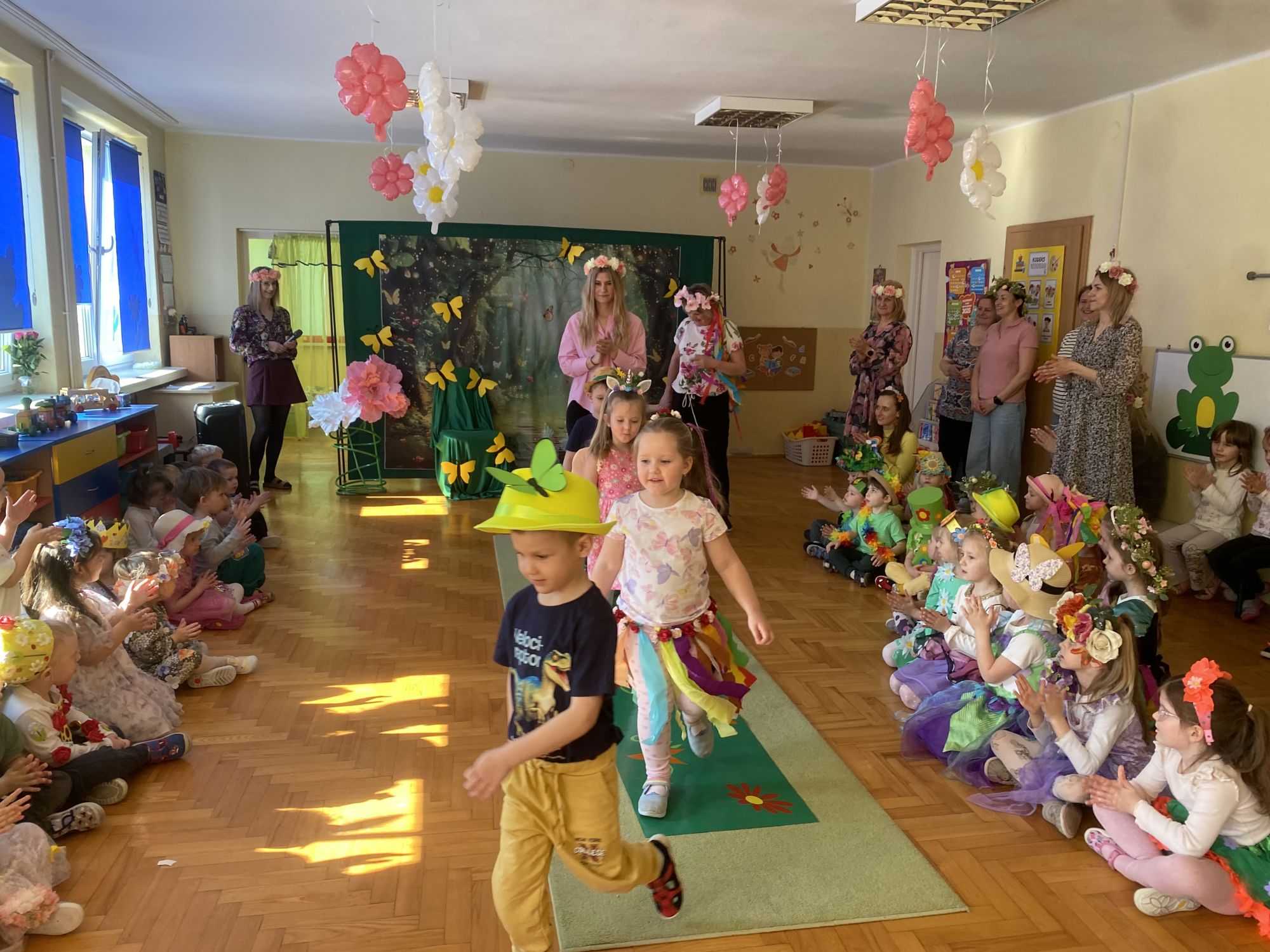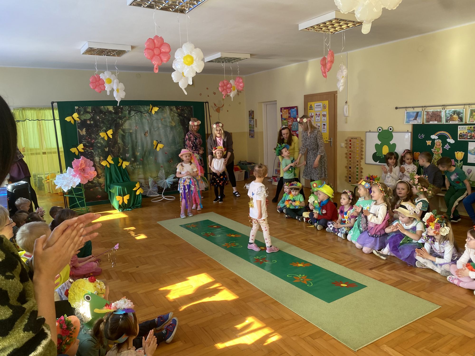 Następnie na dzieci czekały wiosenne zagadki oraz wesołe zabawy ruchowe, które wprowadziły wszystkich w doskonały nastrój. Kolejnym, bardzo wyczekiwanym punktem programu był wiosenny pokaz mody. Dzieci, ubrane w kolorowe, pomysłowe stroje inspirowane wiosną, z dumą prezentowały się na zielonym dywanie, wzbudzając zachwyt i ogromne brawa.