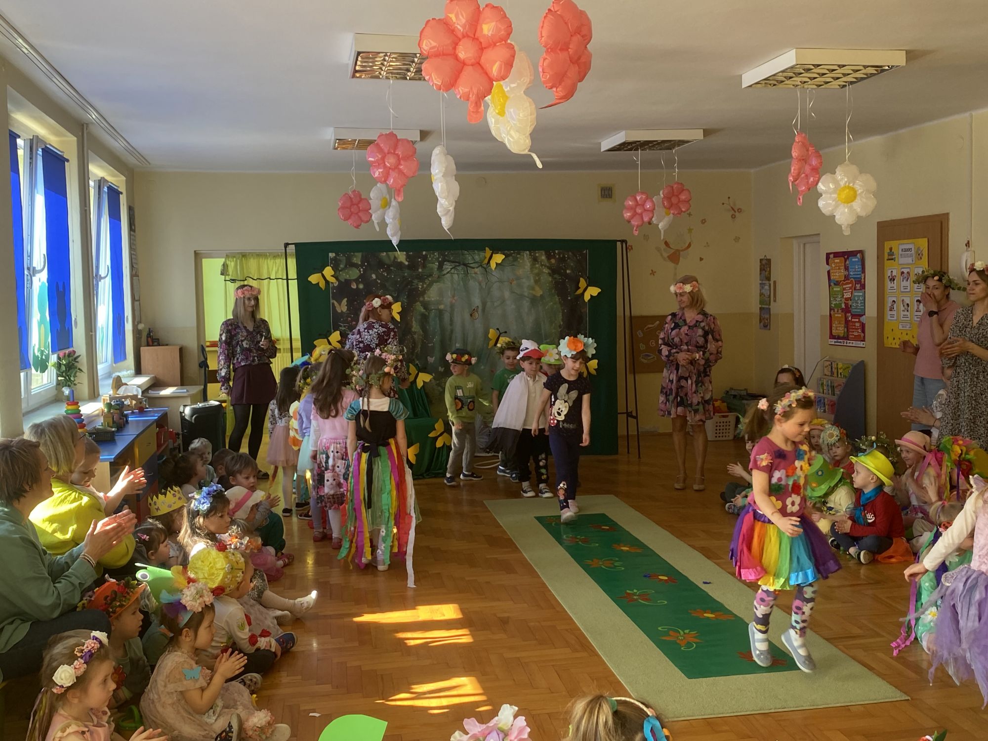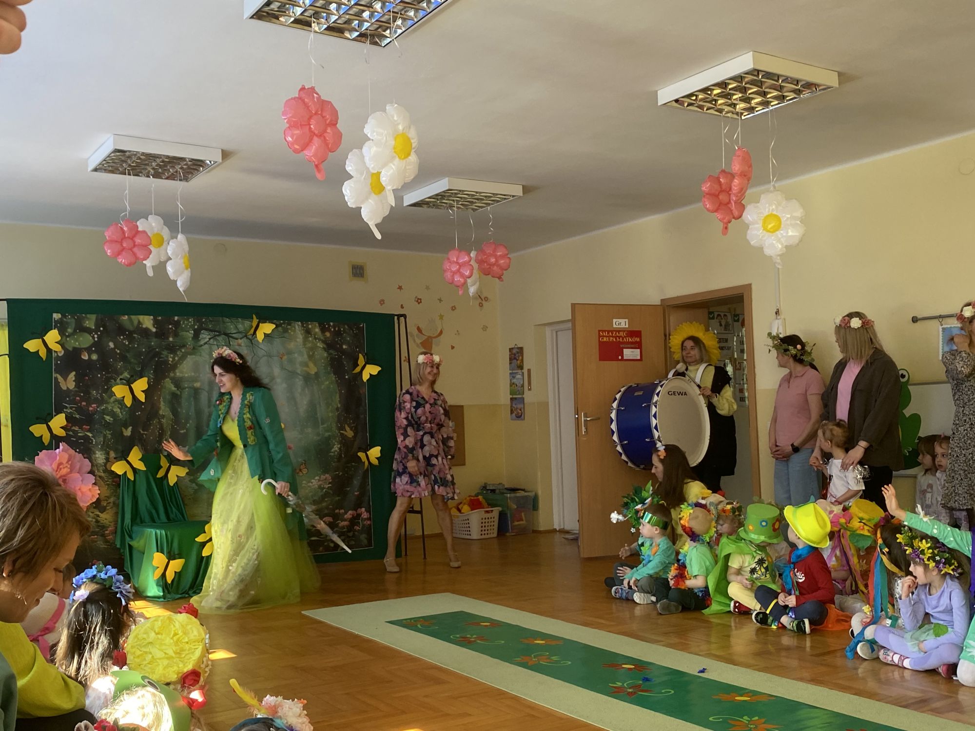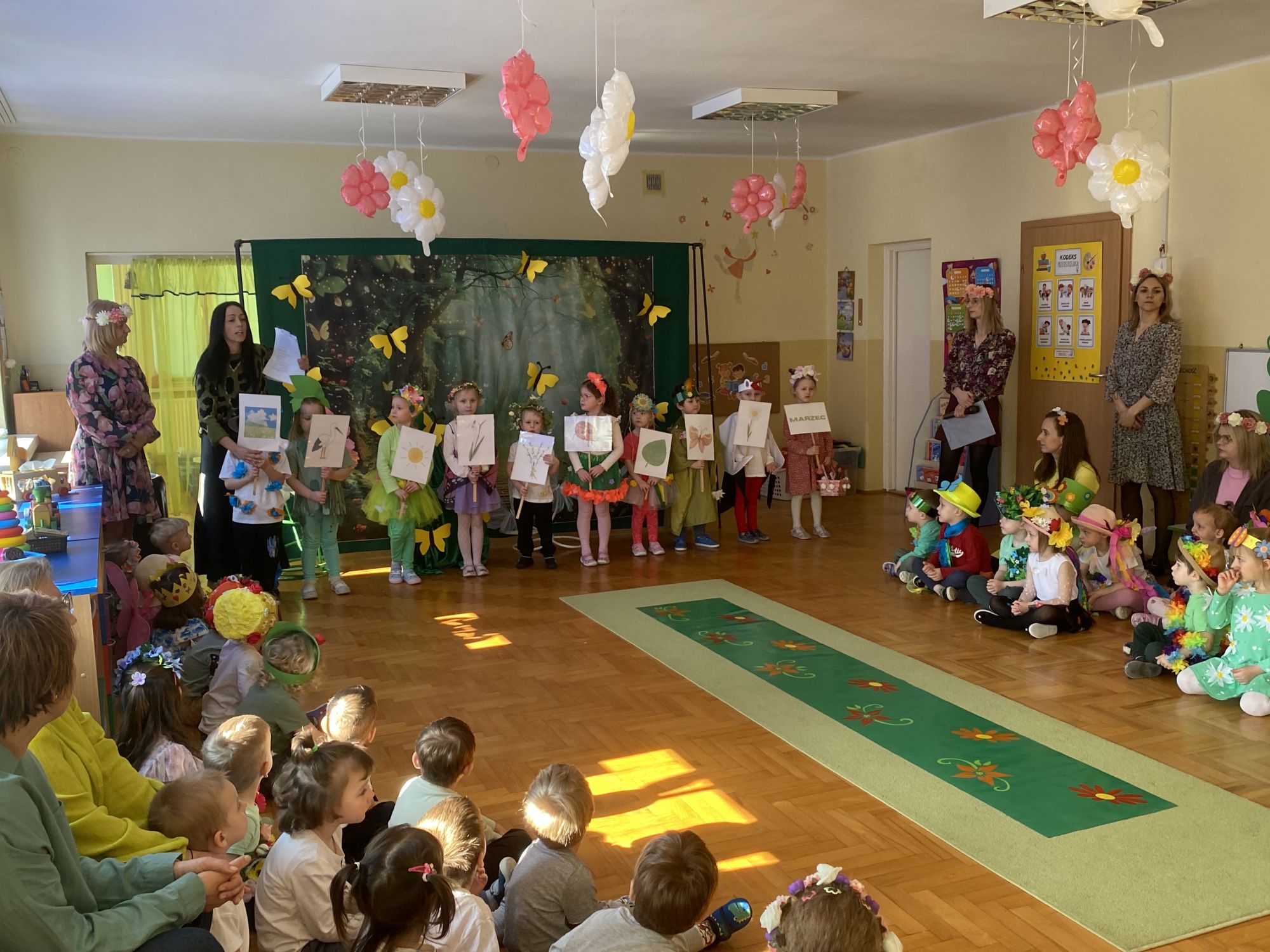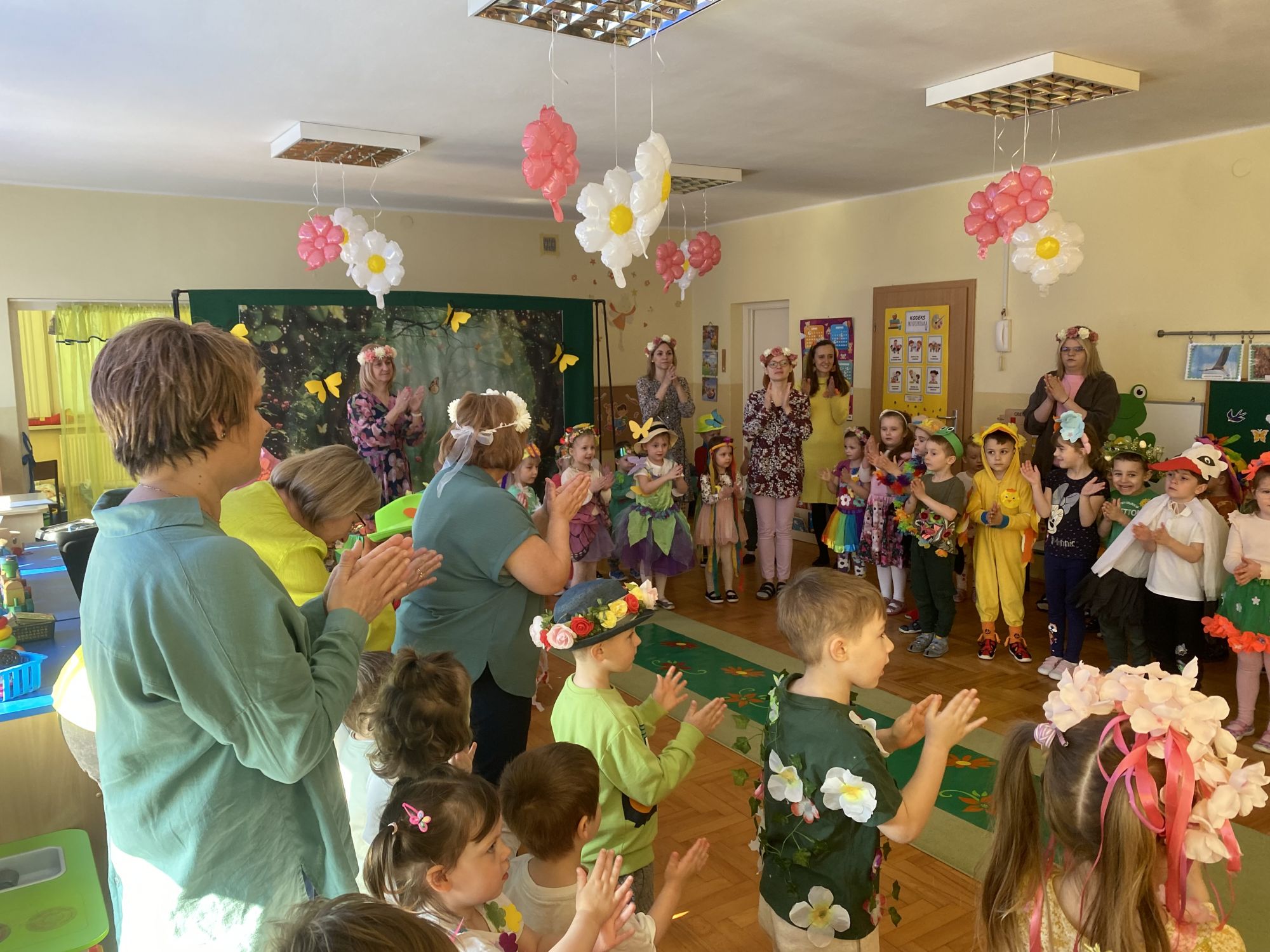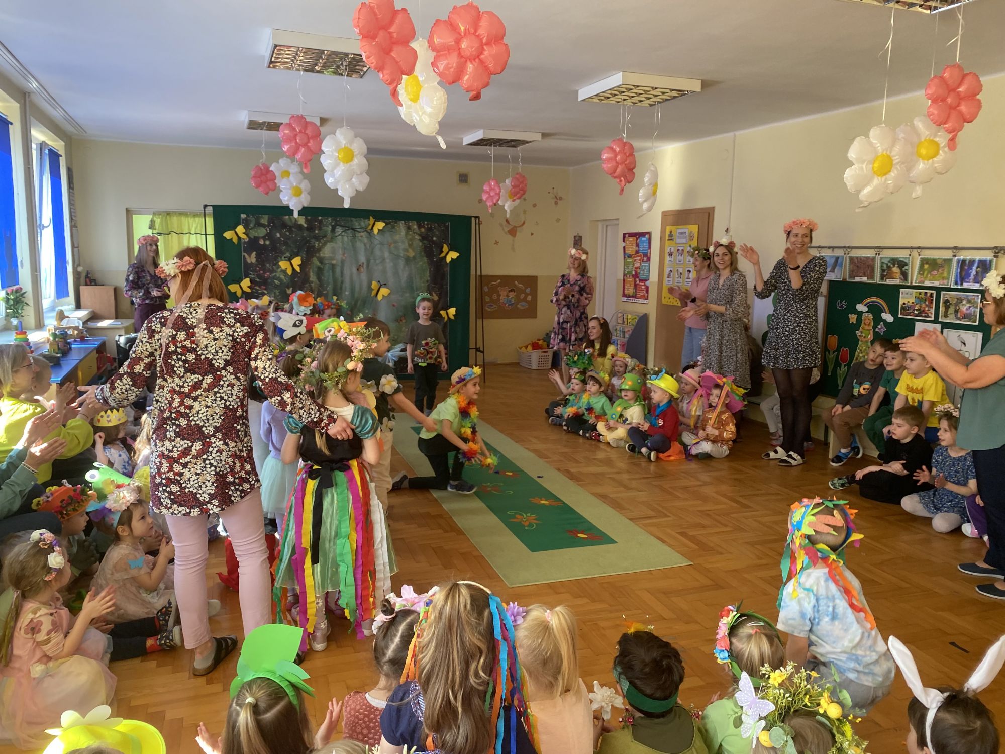 Następnie na dzieci czekały wiosenne zagadki oraz wesołe zabawy ruchowe, które wprowadziły wszystkich w doskonały nastrój. Kolejnym, bardzo wyczekiwanym punktem programu był wiosenny pokaz mody. Dzieci, ubrane w kolorowe, pomysłowe stroje inspirowane wiosną, z dumą prezentowały się na zielonym dywanie, wzbudzając zachwyt i ogromne brawa.