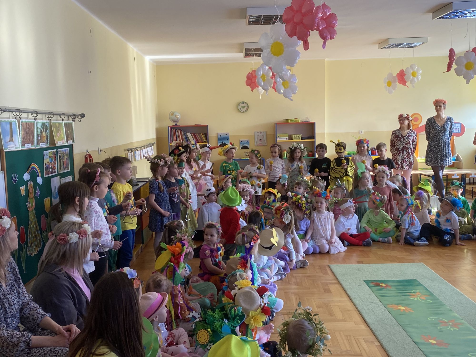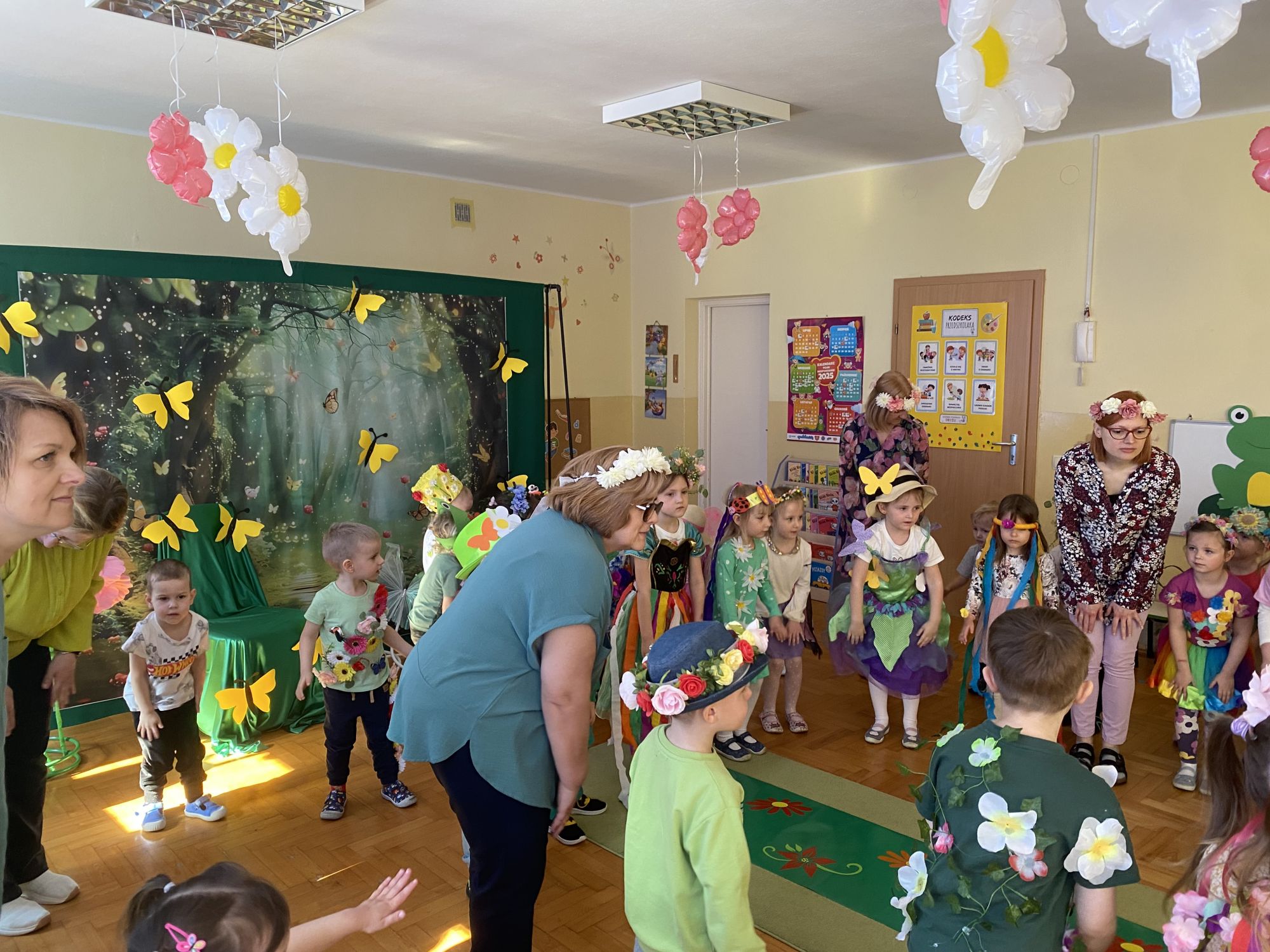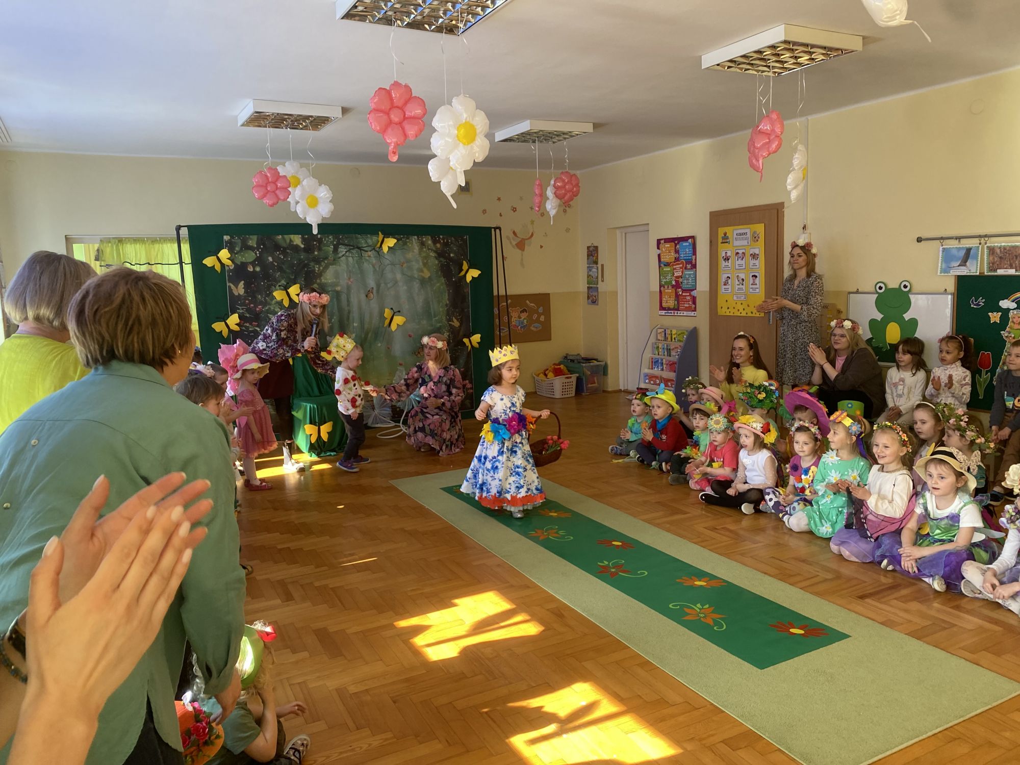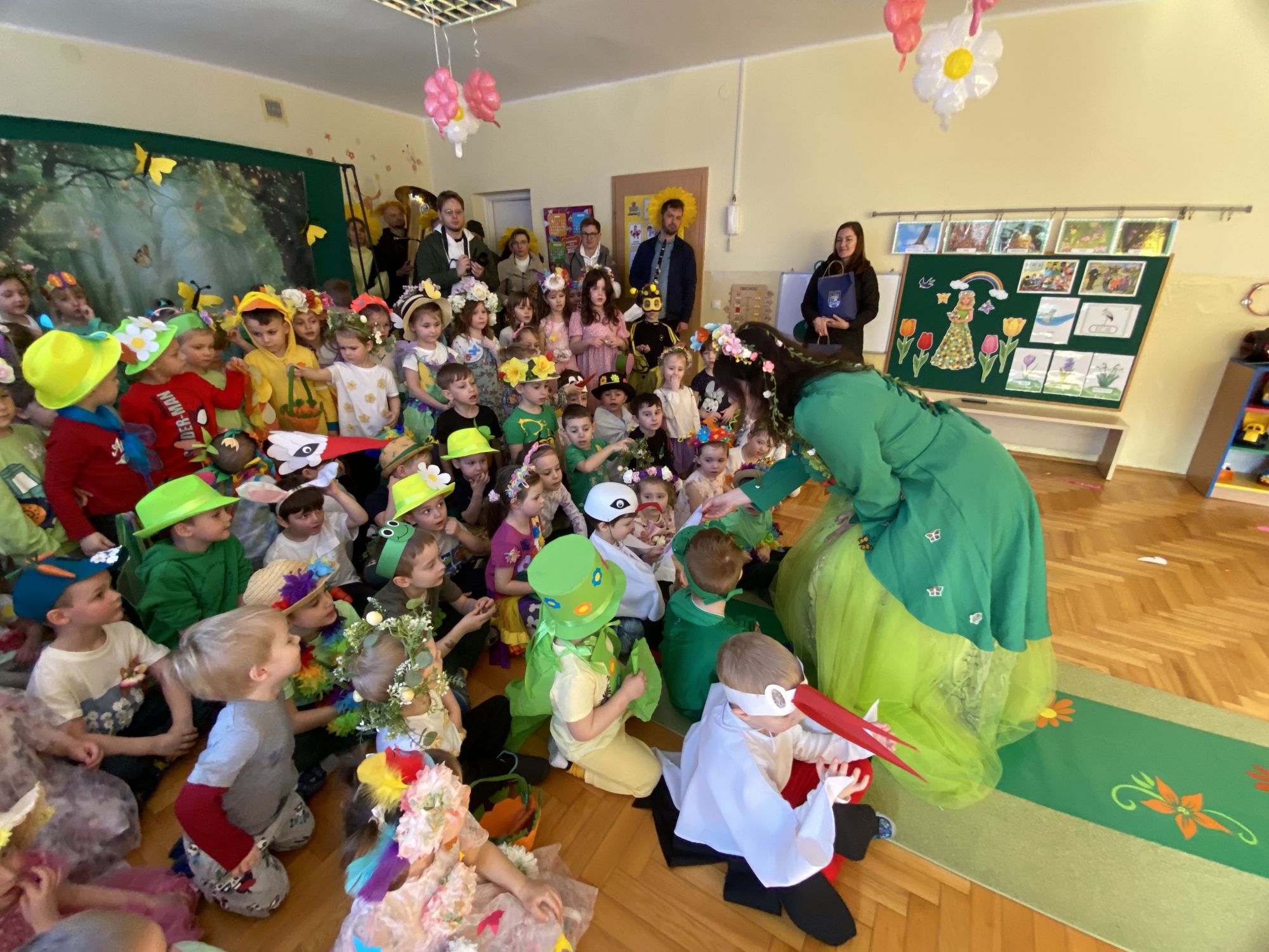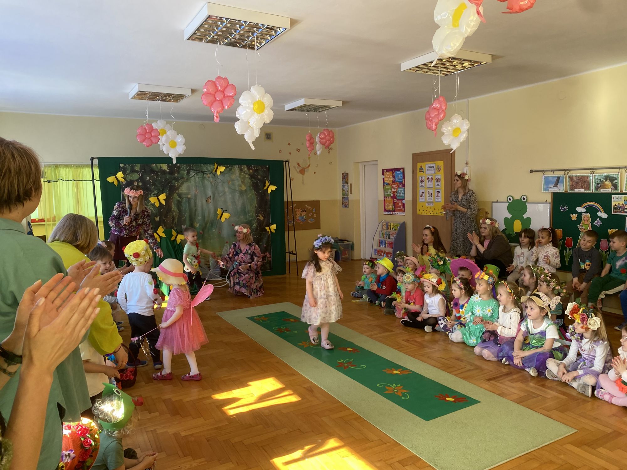 Następnie na dzieci czekały wiosenne zagadki oraz wesołe zabawy ruchowe, które wprowadziły wszystkich w doskonały nastrój. Kolejnym, bardzo wyczekiwanym punktem programu był wiosenny pokaz mody. Dzieci, ubrane w kolorowe, pomysłowe stroje inspirowane wiosną, z dumą prezentowały się na zielonym dywanie, wzbudzając zachwyt i ogromne brawa.