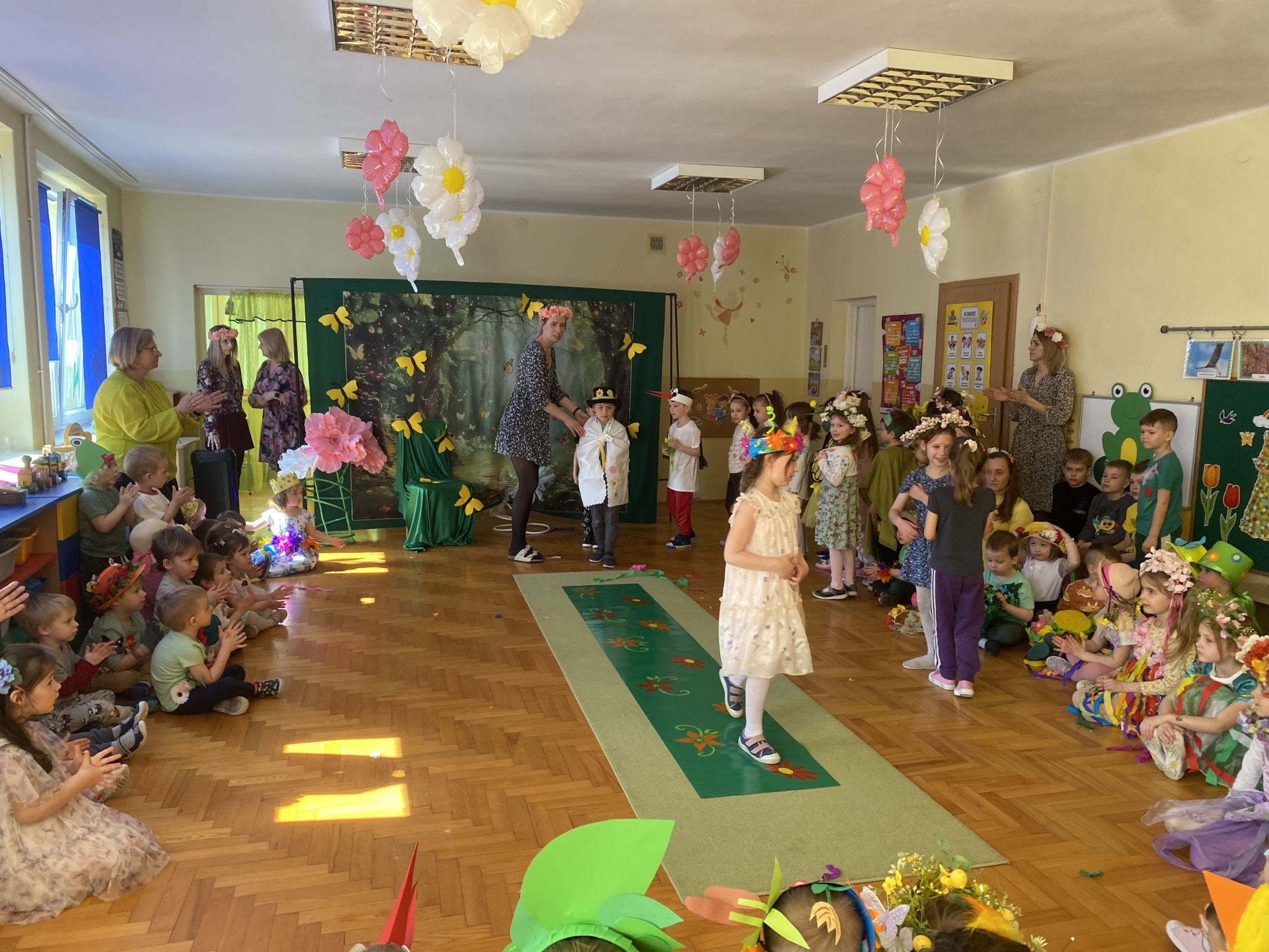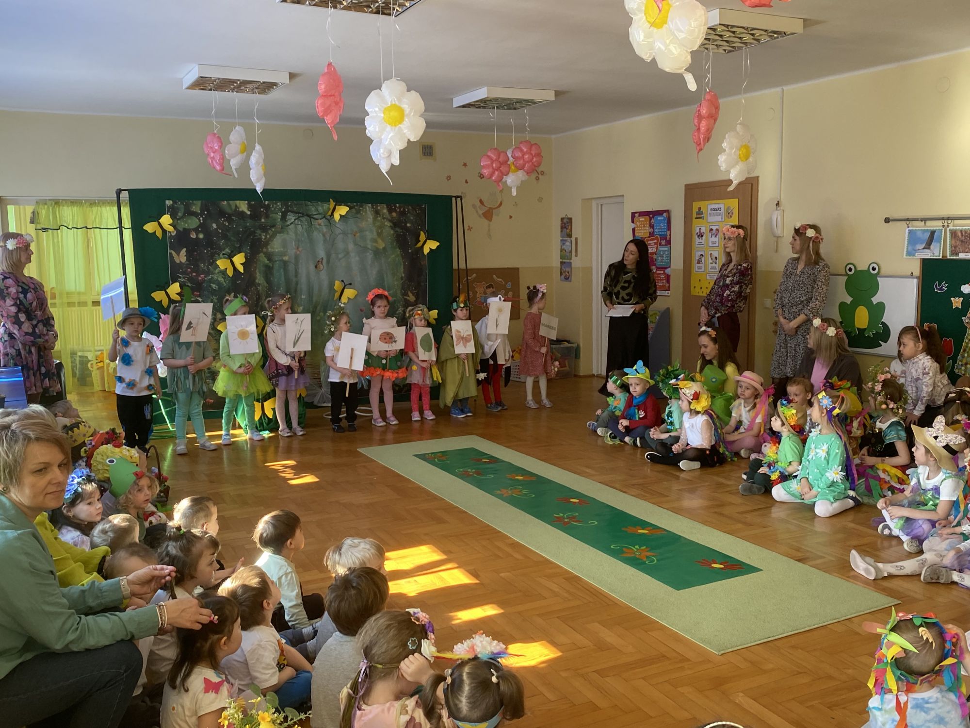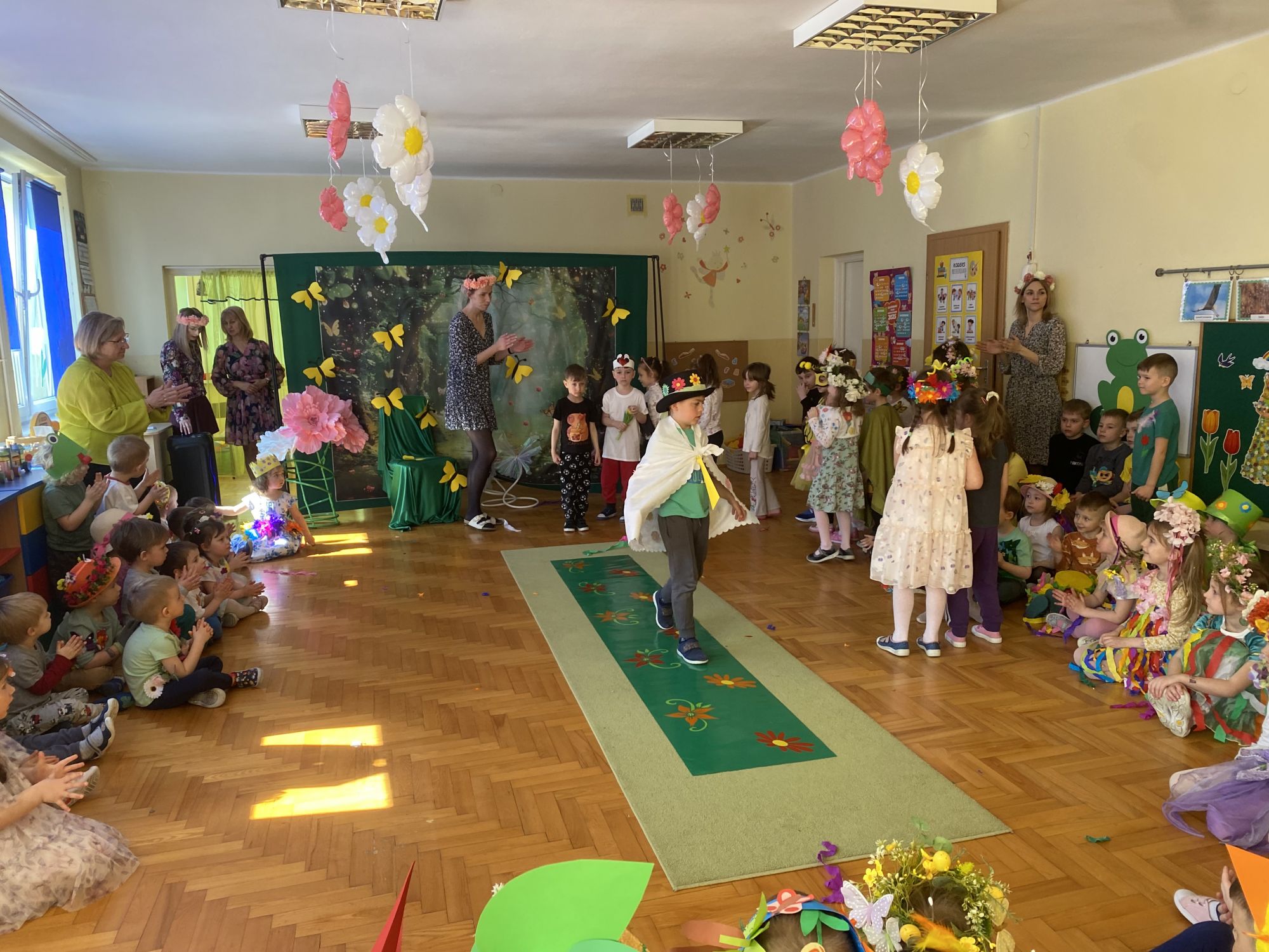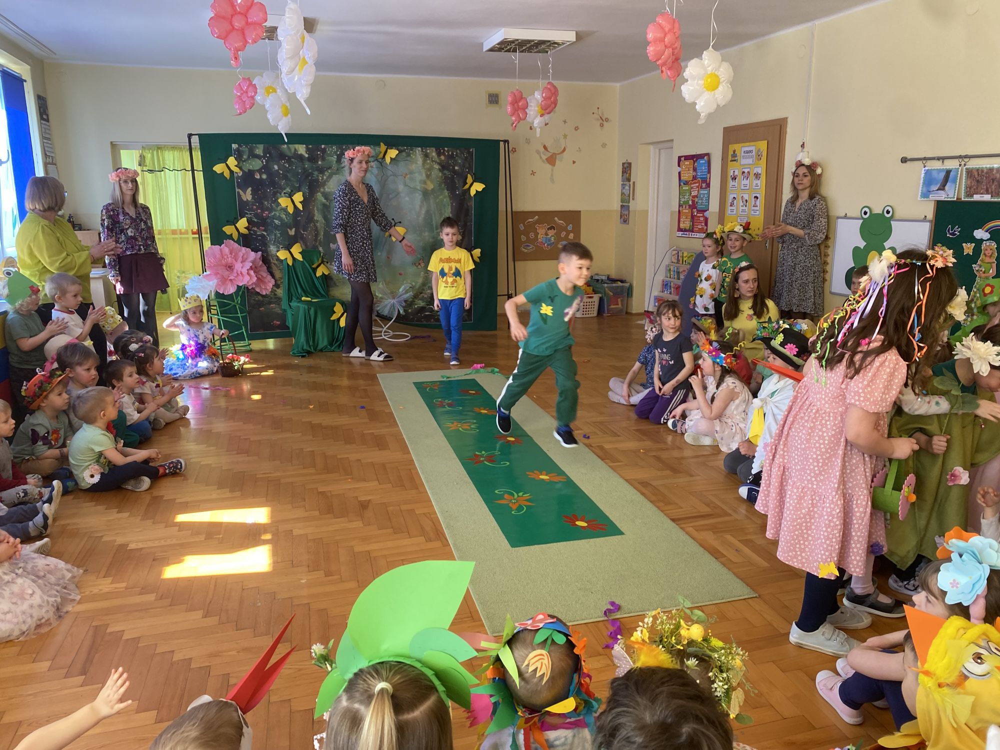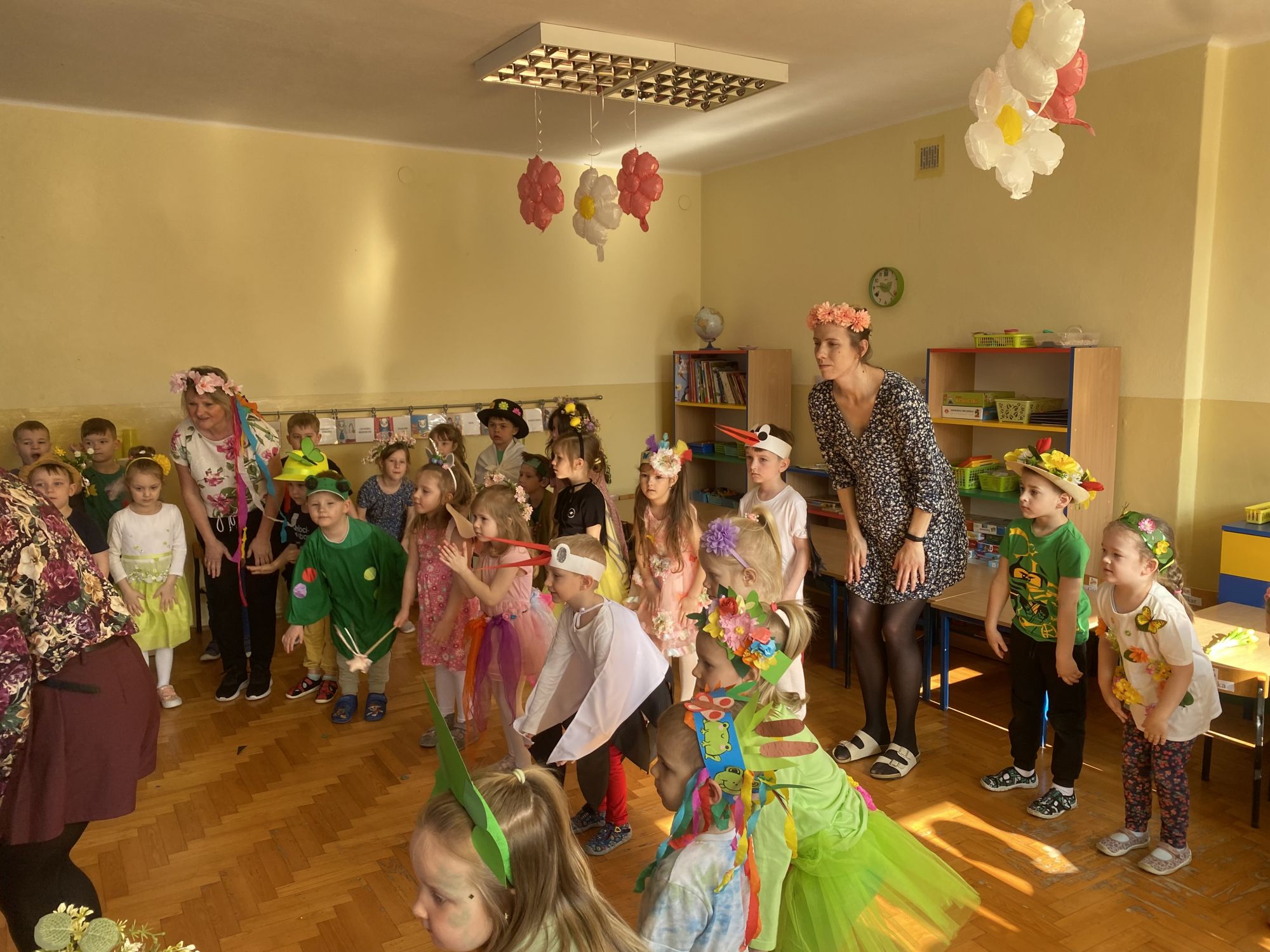 Następnie na dzieci czekały wiosenne zagadki oraz wesołe zabawy ruchowe, które wprowadziły wszystkich w doskonały nastrój. Kolejnym, bardzo wyczekiwanym punktem programu był wiosenny pokaz mody. Dzieci, ubrane w kolorowe, pomysłowe stroje inspirowane wiosną, z dumą prezentowały się na zielonym dywanie, wzbudzając zachwyt i ogromne brawa.