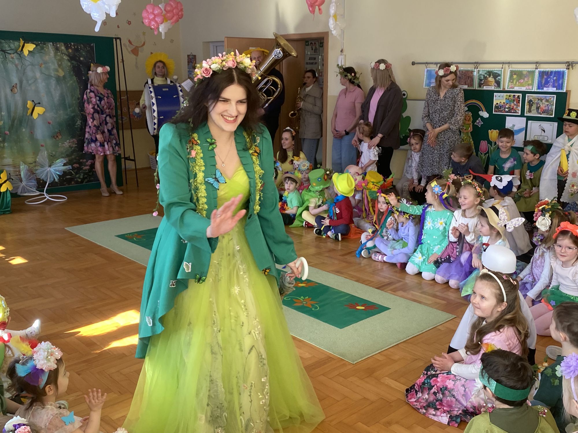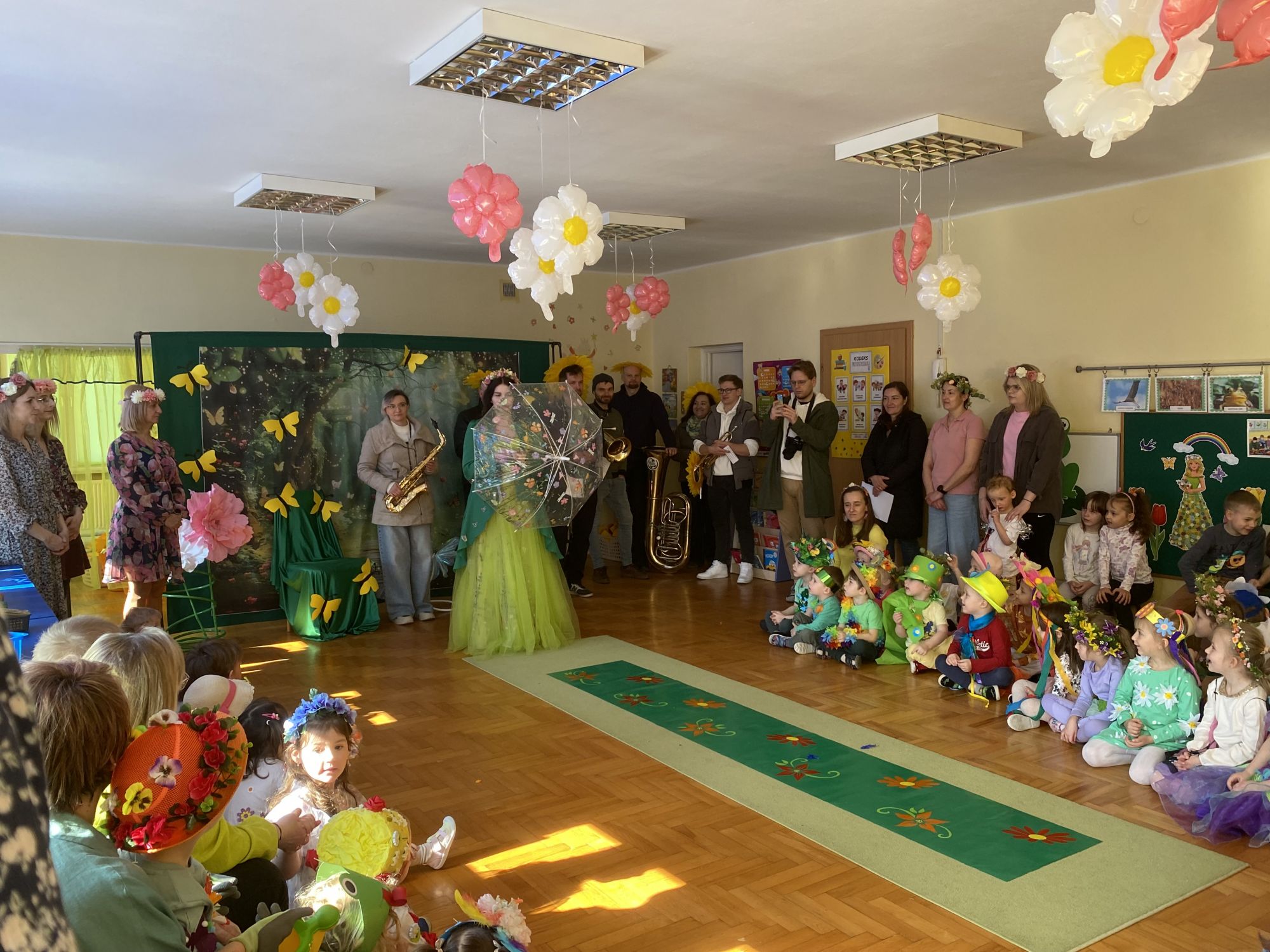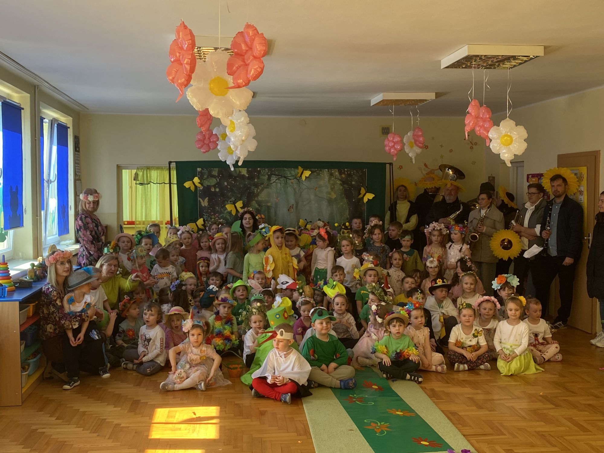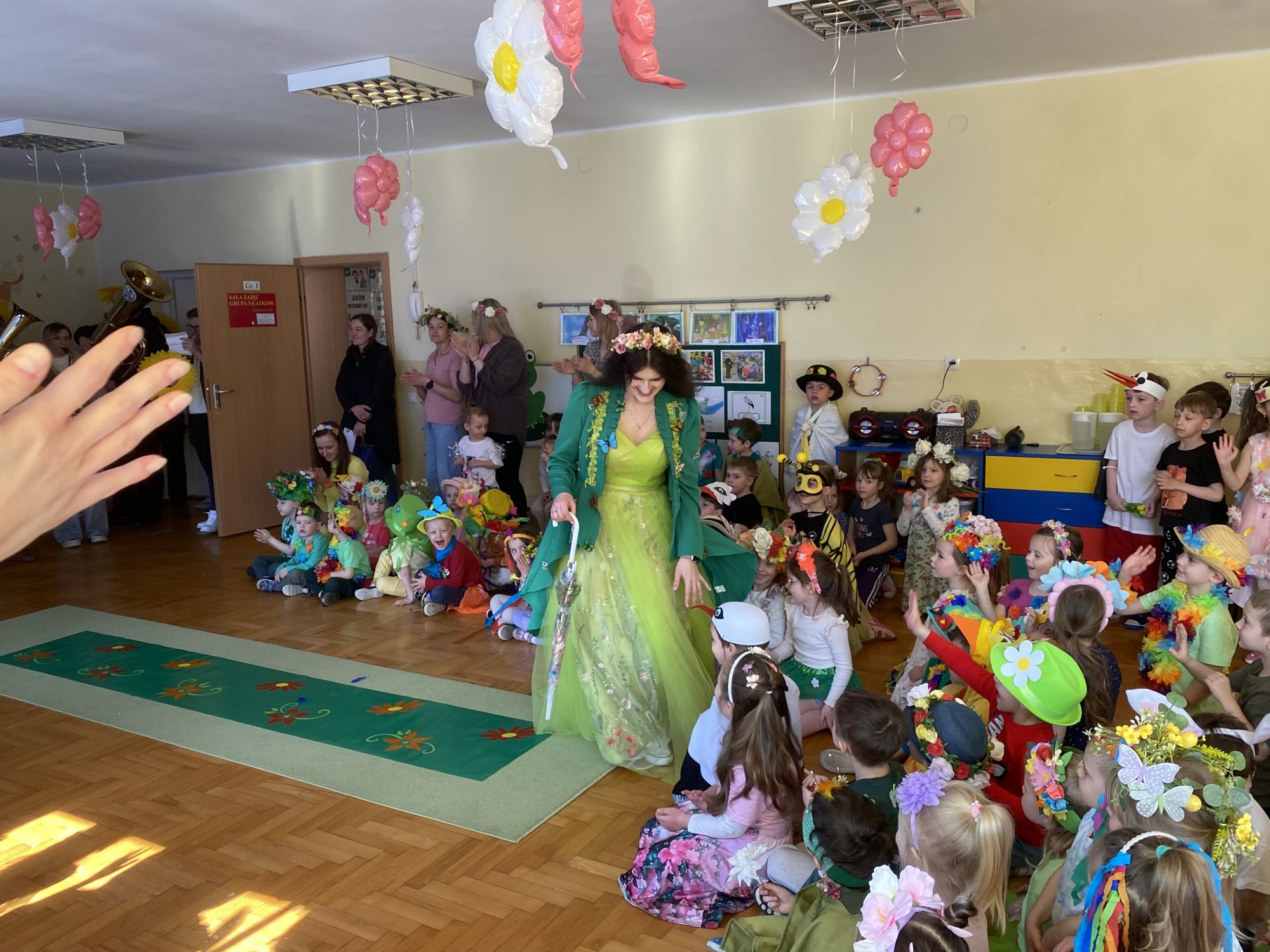 Po zakończeniu pokazu odwiedził nas wyjątkowy gość– Pani Wiosna wraz z Orkiestrą Dętą z Ozimka, która uświetniła to wydarzenie piękną muzyką. Spotkanie z Panią Wiosną było dla dzieci miłą niespodzianką. Przedszkolaki zaśpiewały dla niej piosenkę „Przyszła wiosna”, a następnie wspólnie zatańczyły.