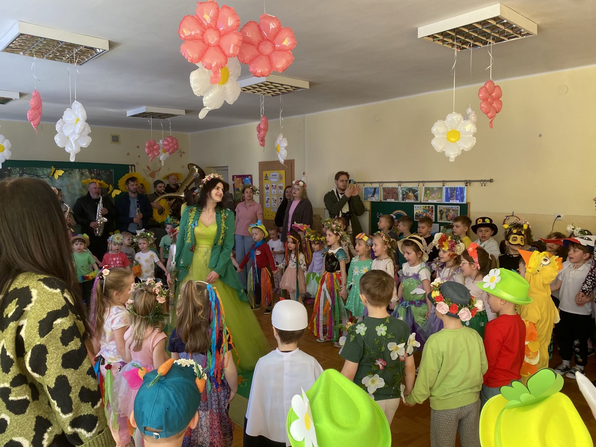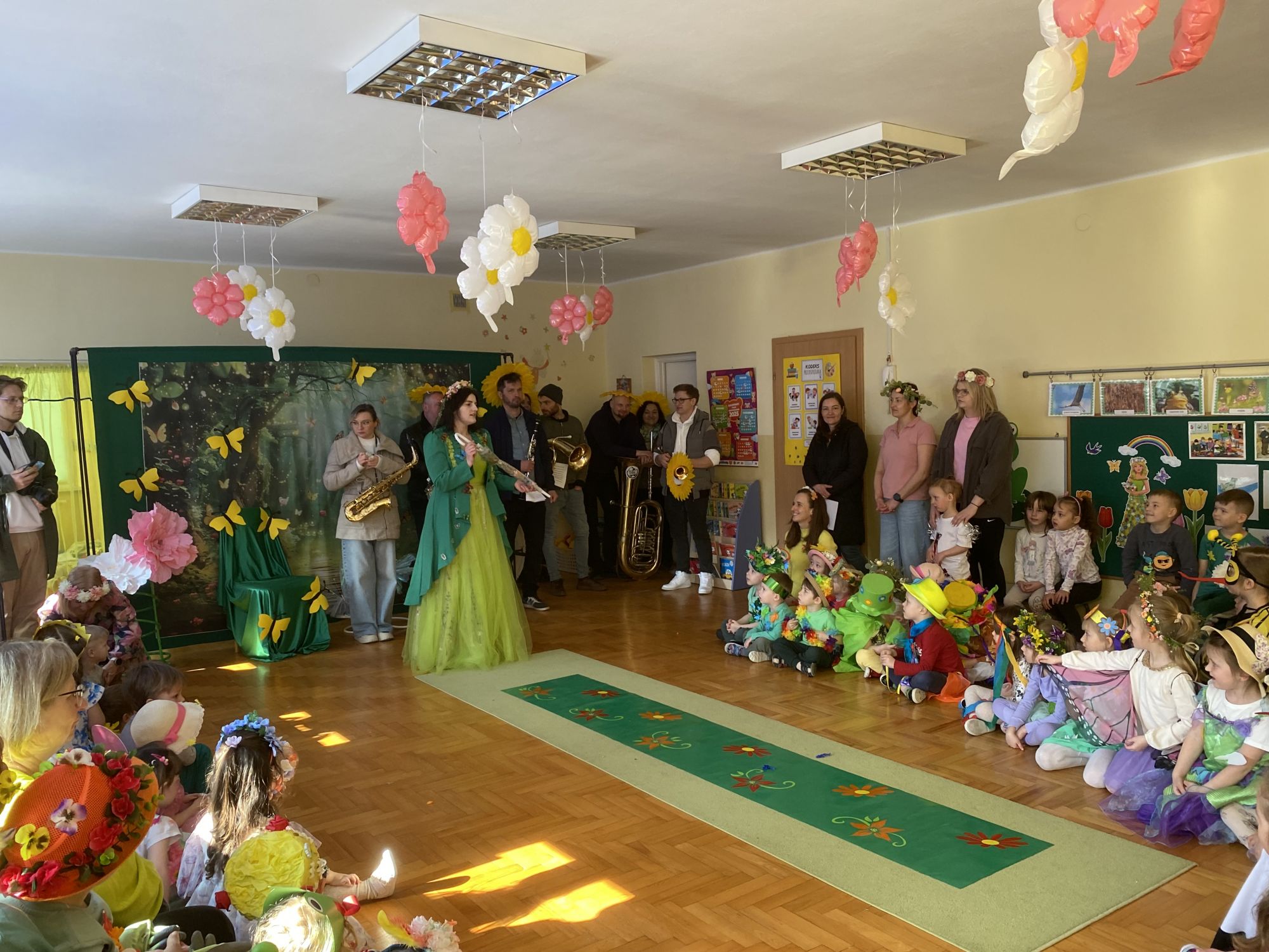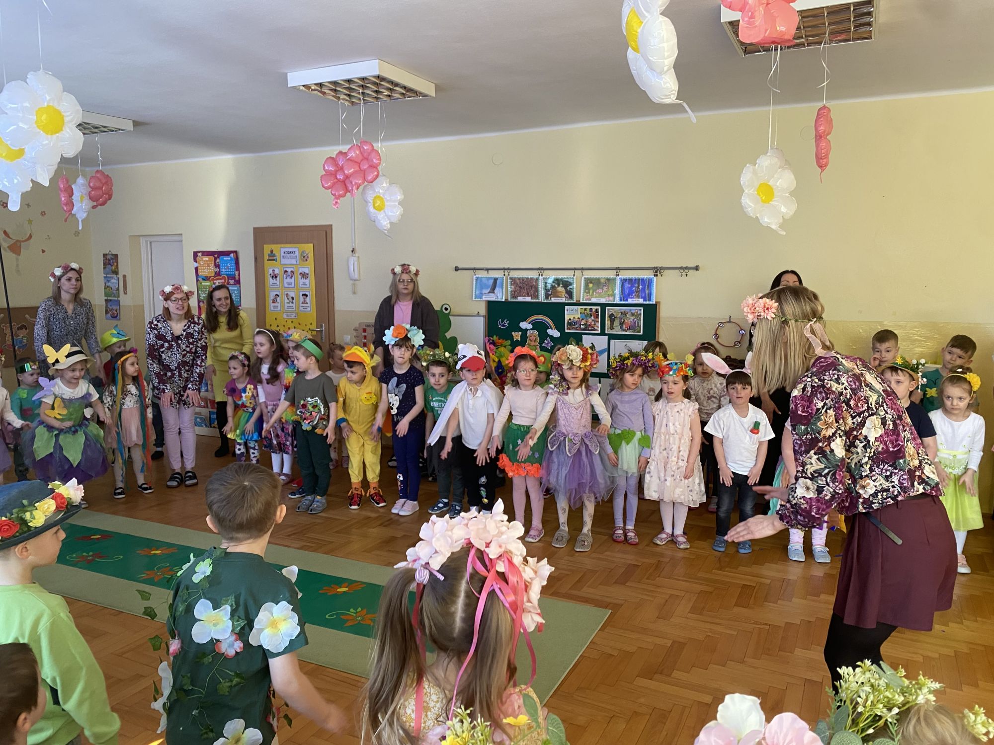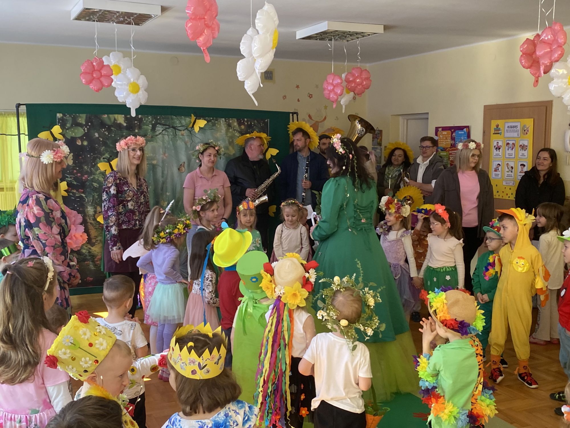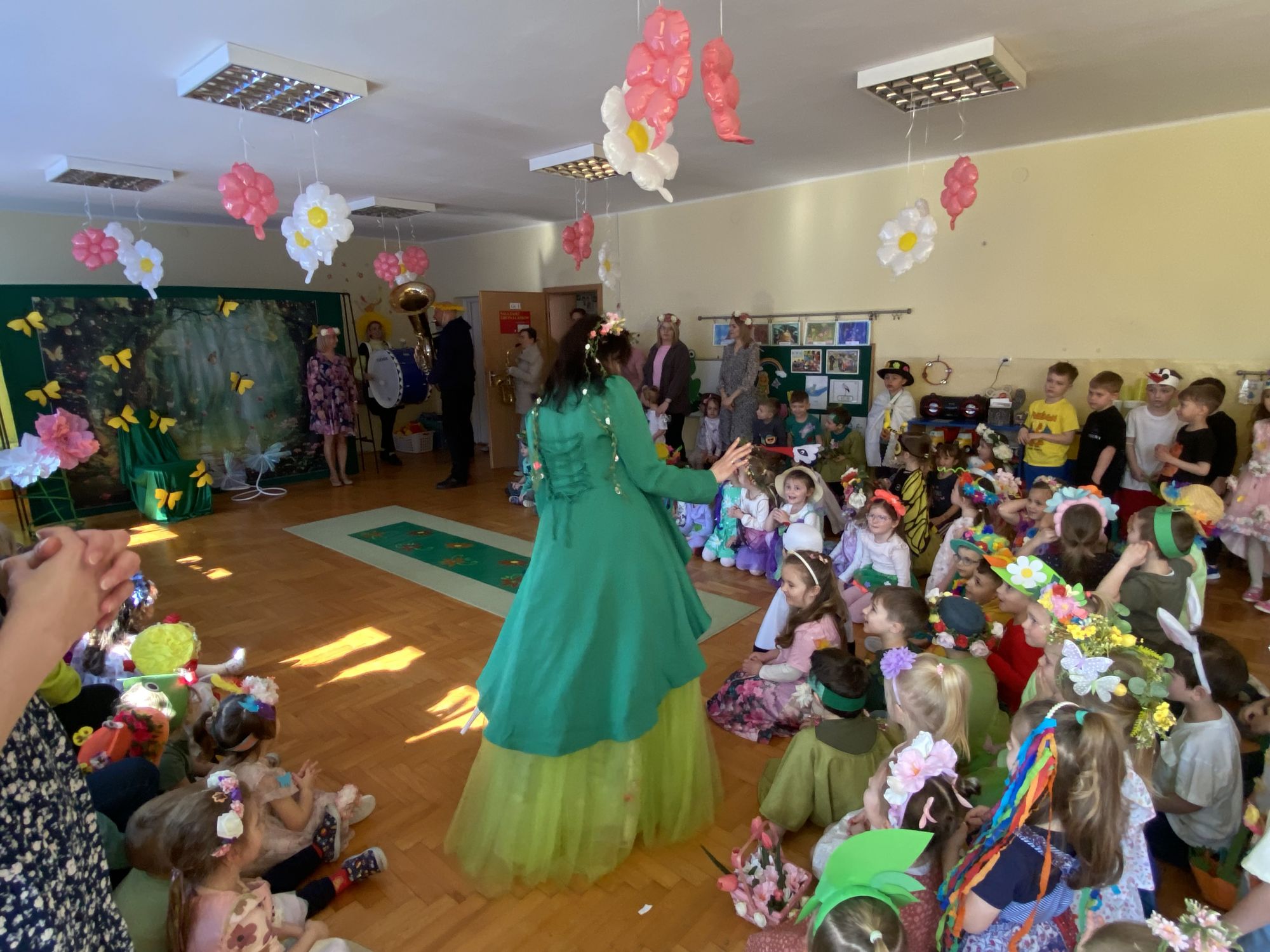 Po zakończeniu pokazu odwiedził nas wyjątkowy gość– Pani Wiosna wraz z Orkiestrą Dętą z Ozimka, która uświetniła to wydarzenie piękną muzyką. Spotkanie z Panią Wiosną było dla dzieci miłą niespodzianką. Przedszkolaki zaśpiewały dla niej piosenkę „Przyszła wiosna”, a następnie wspólnie zatańczyły.