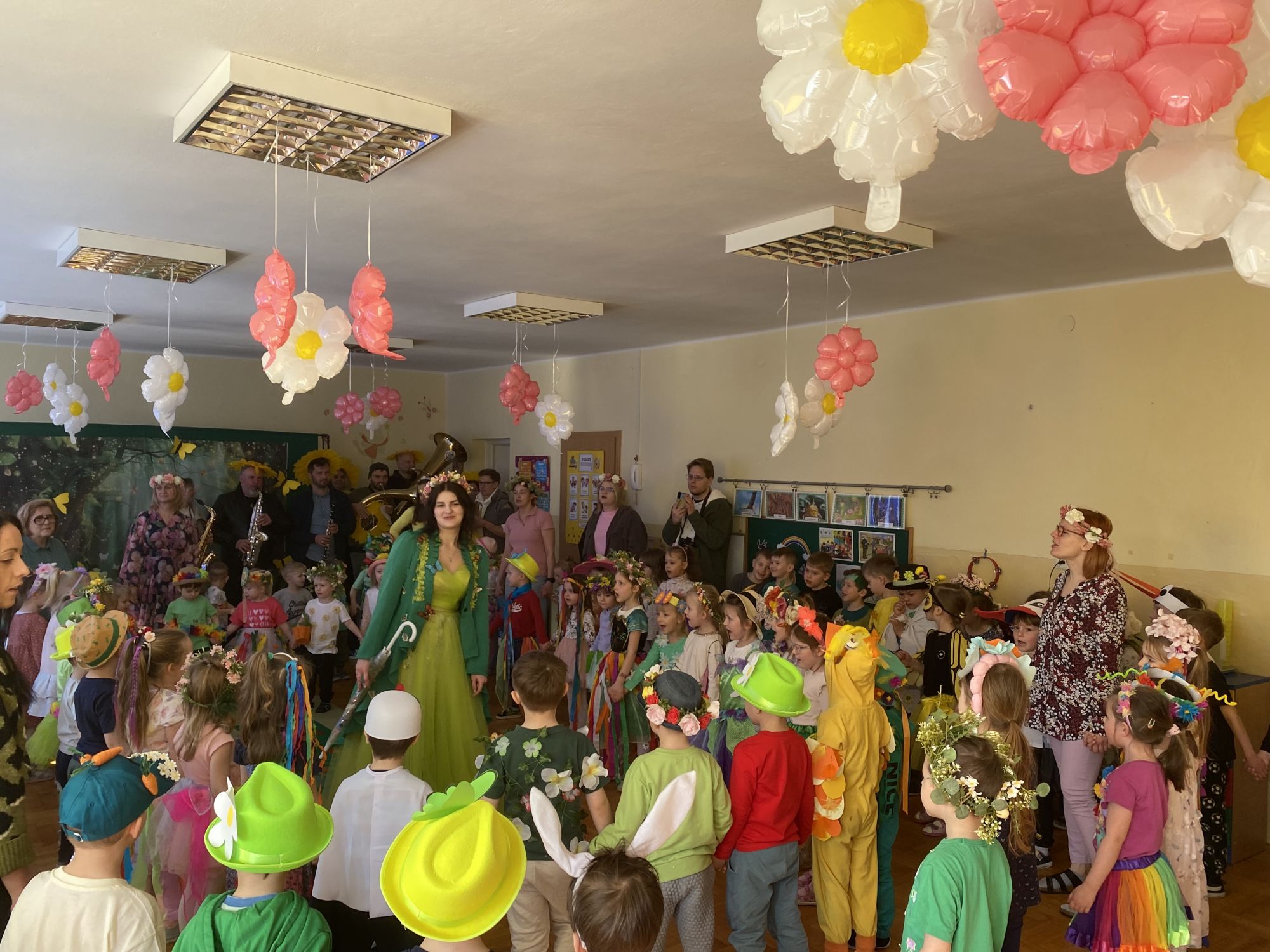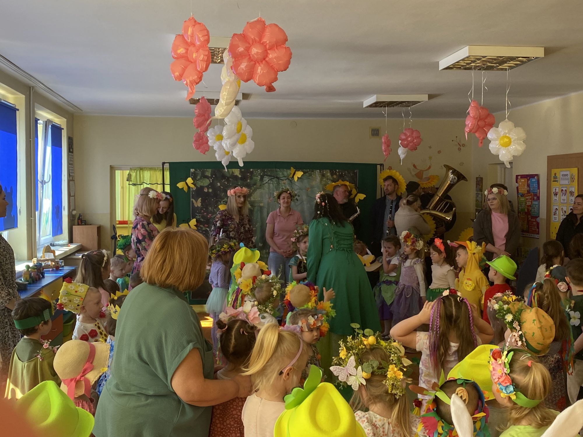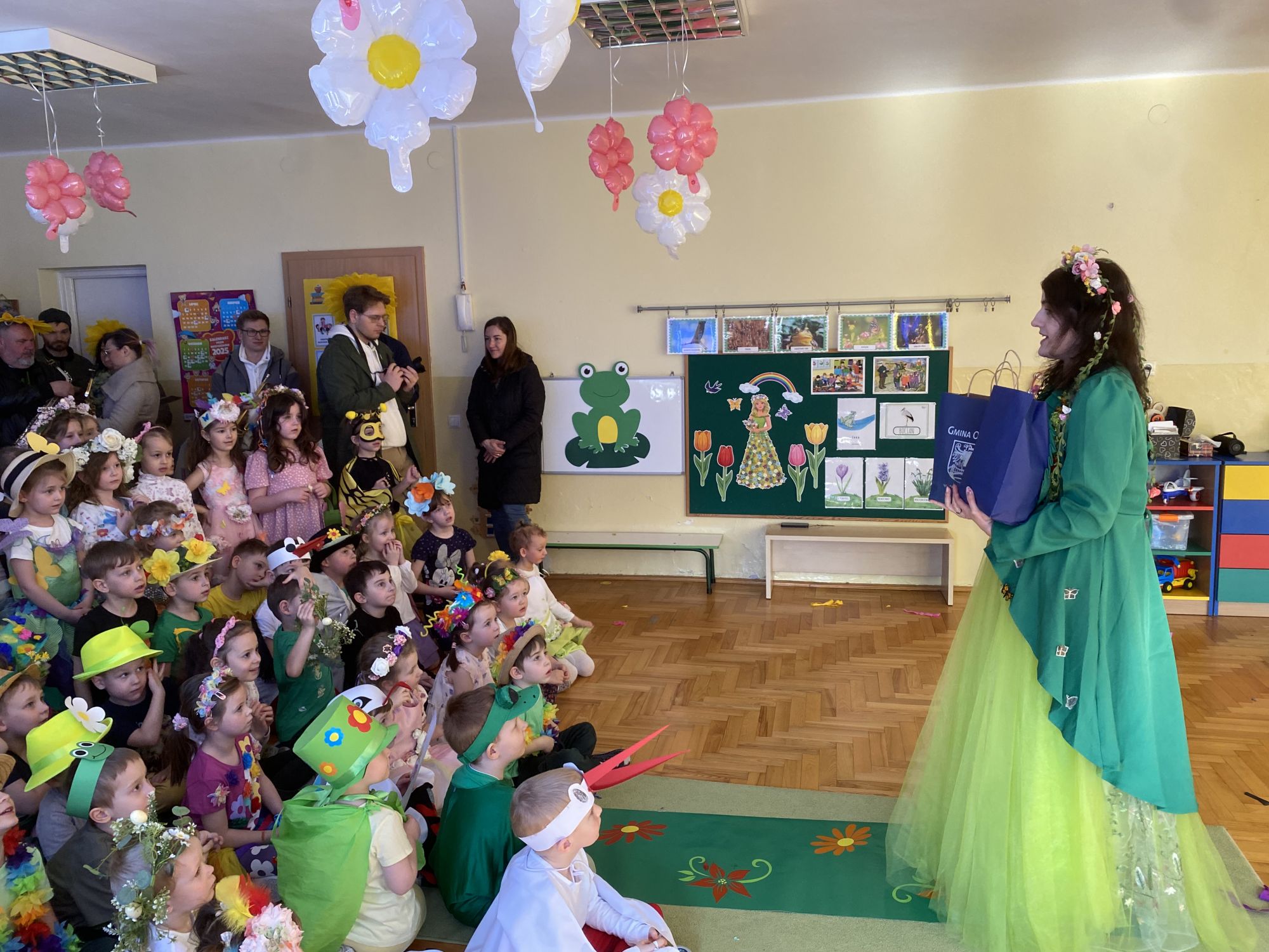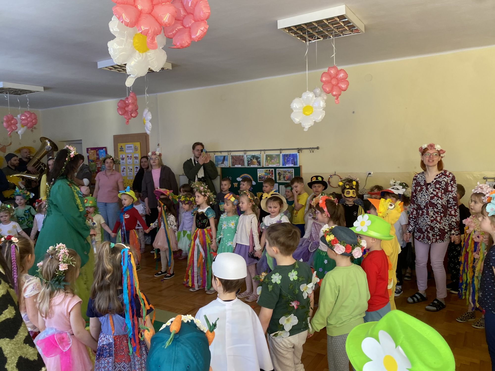 Po zakończeniu pokazu odwiedził nas wyjątkowy gość– Pani Wiosna wraz z Orkiestrą Dętą z Ozimka, która uświetniła to wydarzenie piękną muzyką. Spotkanie z Panią Wiosną było dla dzieci miłą niespodzianką. Przedszkolaki zaśpiewały dla niej piosenkę „Przyszła wiosna”, a następnie wspólnie zatańczyły.