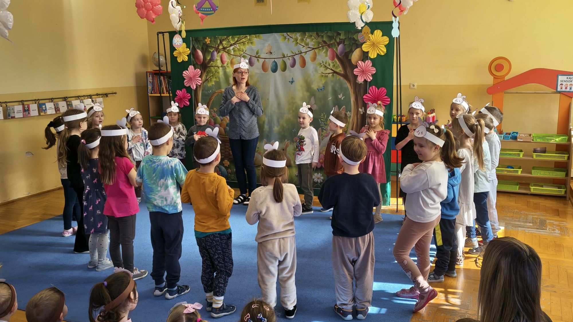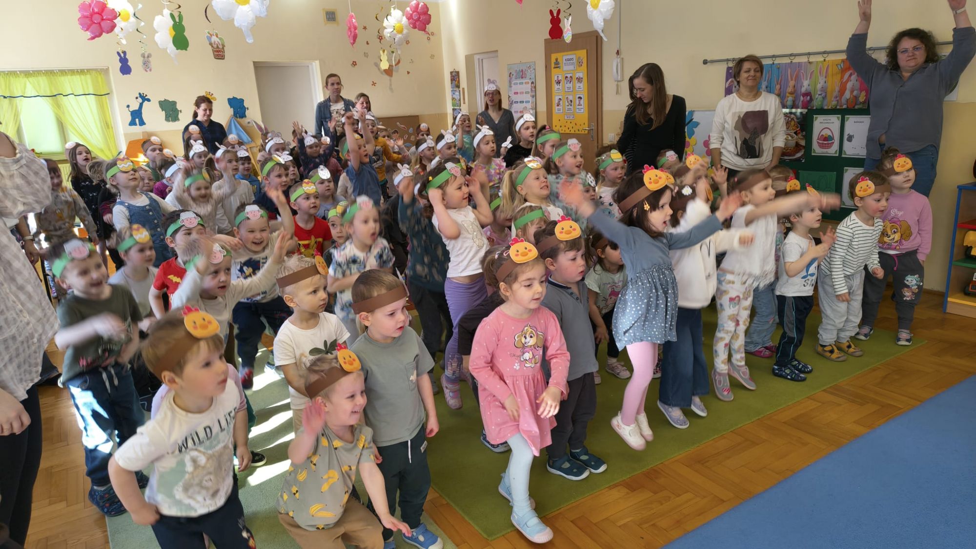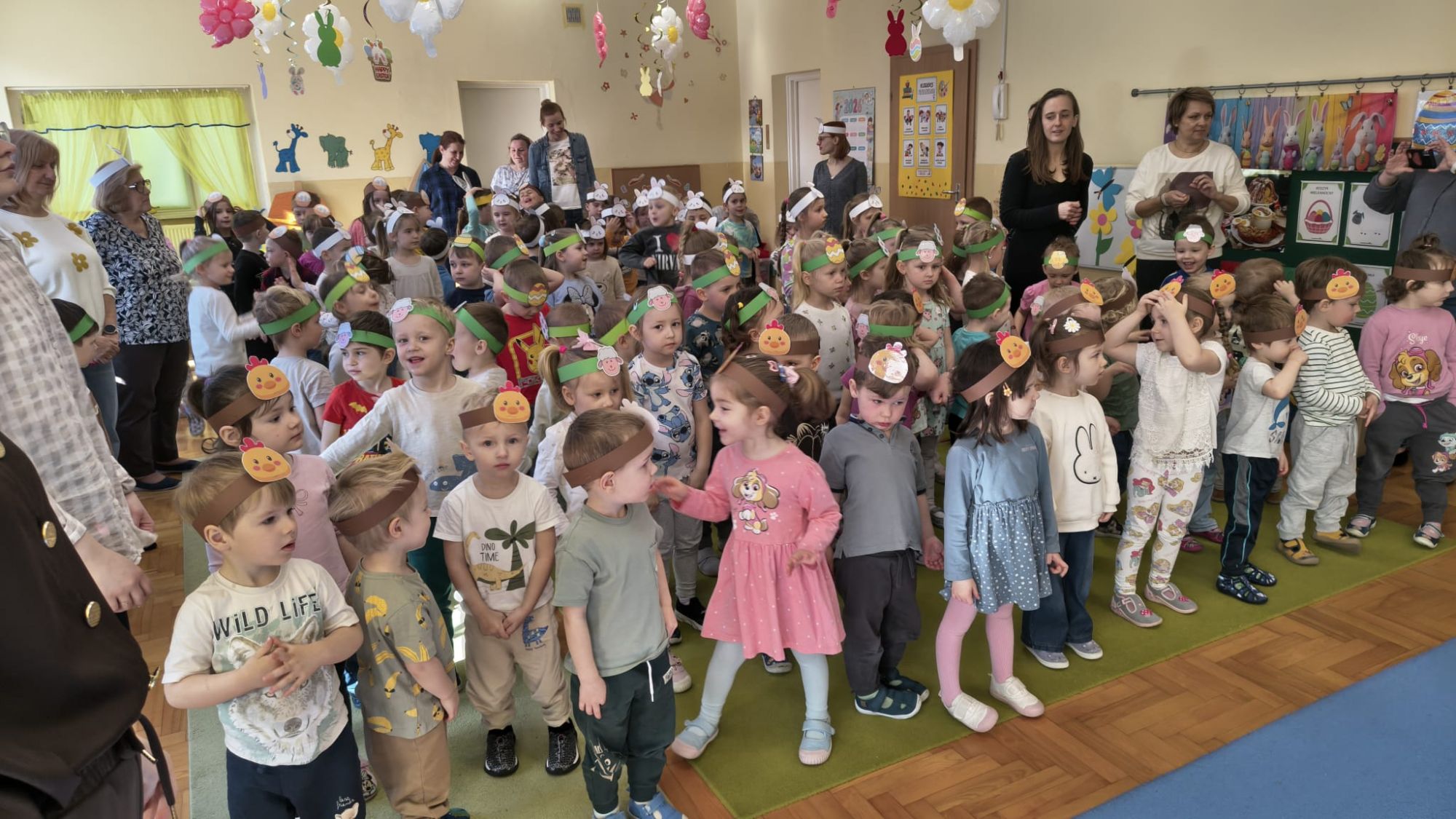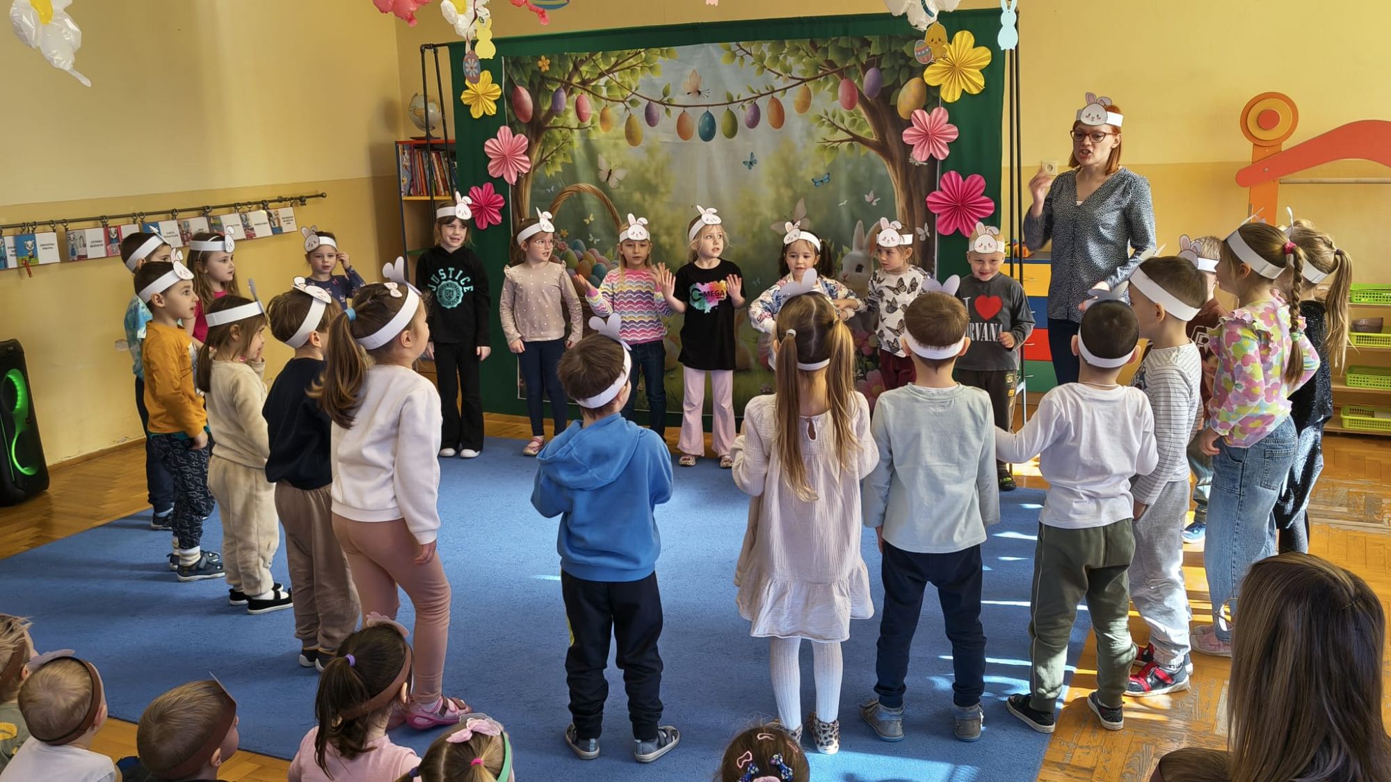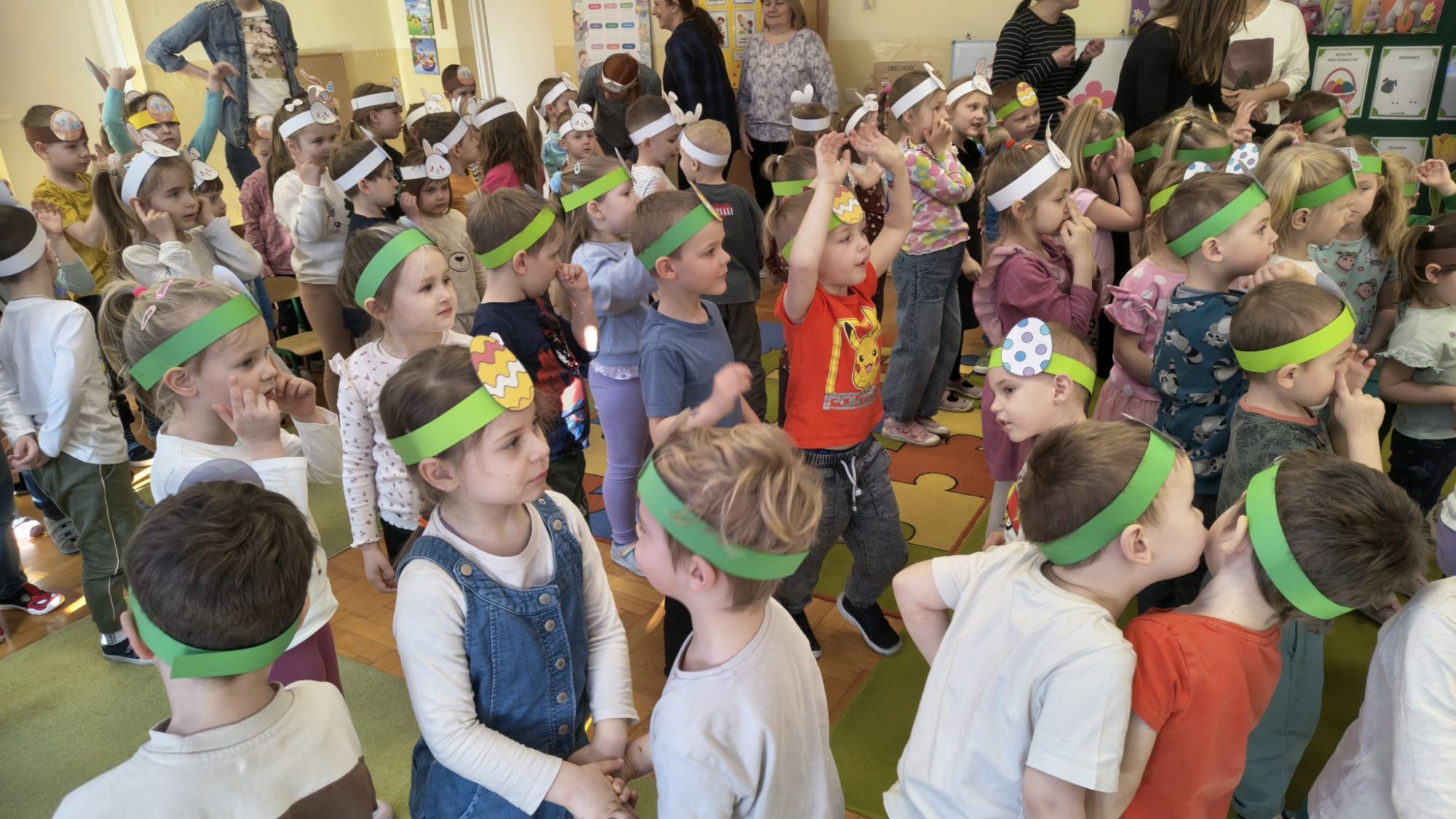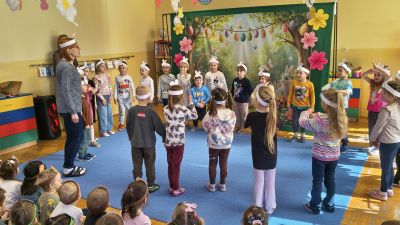 1 kwietnia w Przedszkolu Publicznym Nr 4 w Ozimku odbyło się radosne szukanie Zajączka Wielkanocnego. Na początku każda grupa zaprezentowała się – dzieci śpiewały wielkanocne piosenki, grały na instrumentach oraz tańczyły. Wszystkie grupy miały przygotowane opaski z motywem wielkanocnym, co dodawało uroku całemu wydarzeniu.