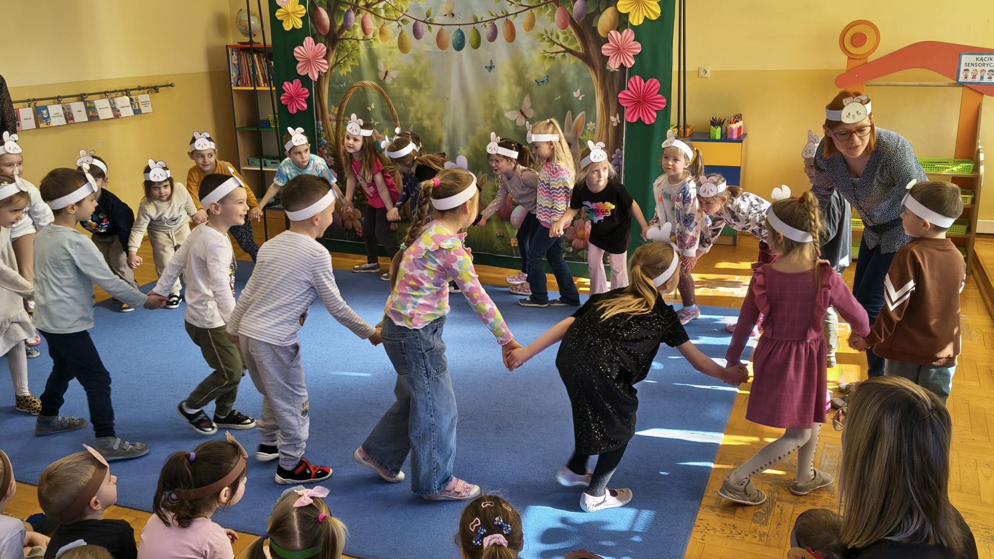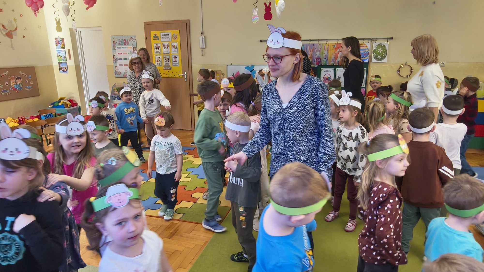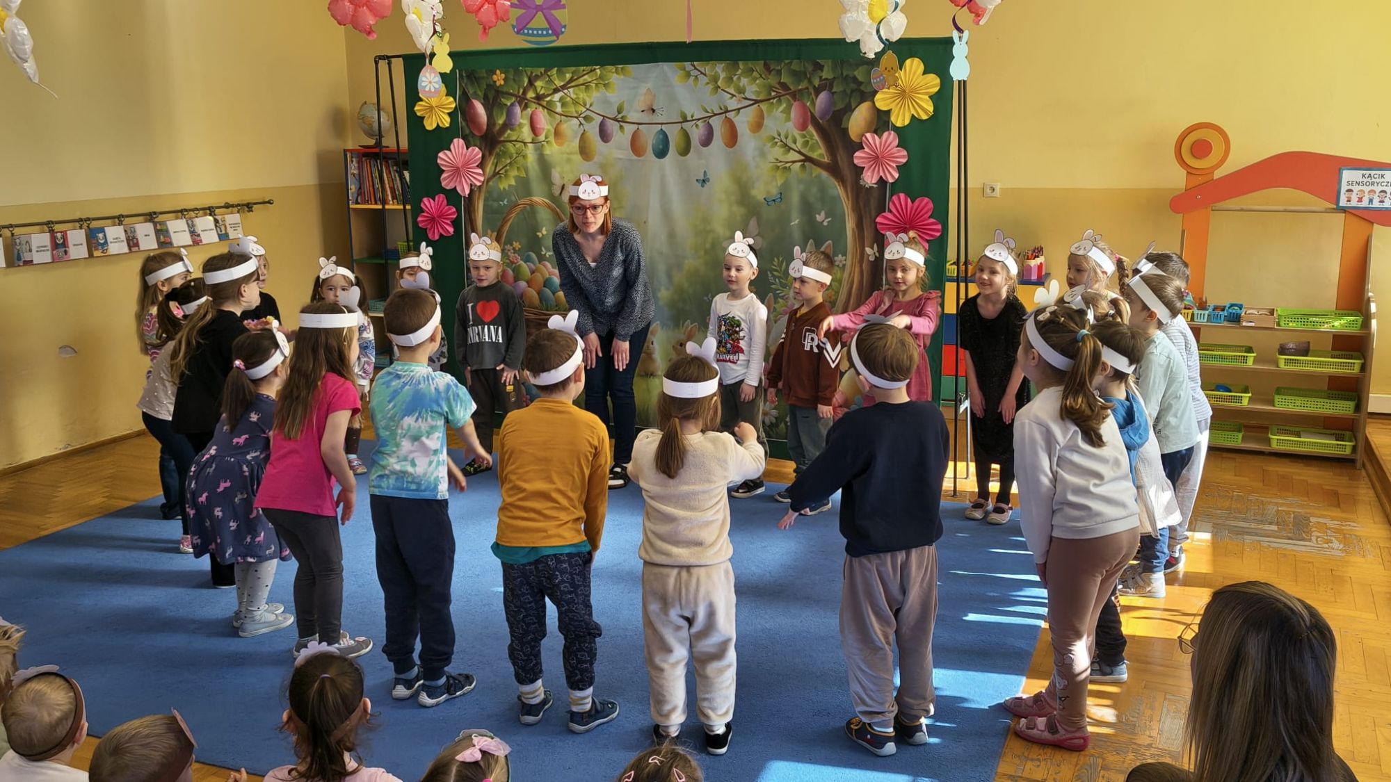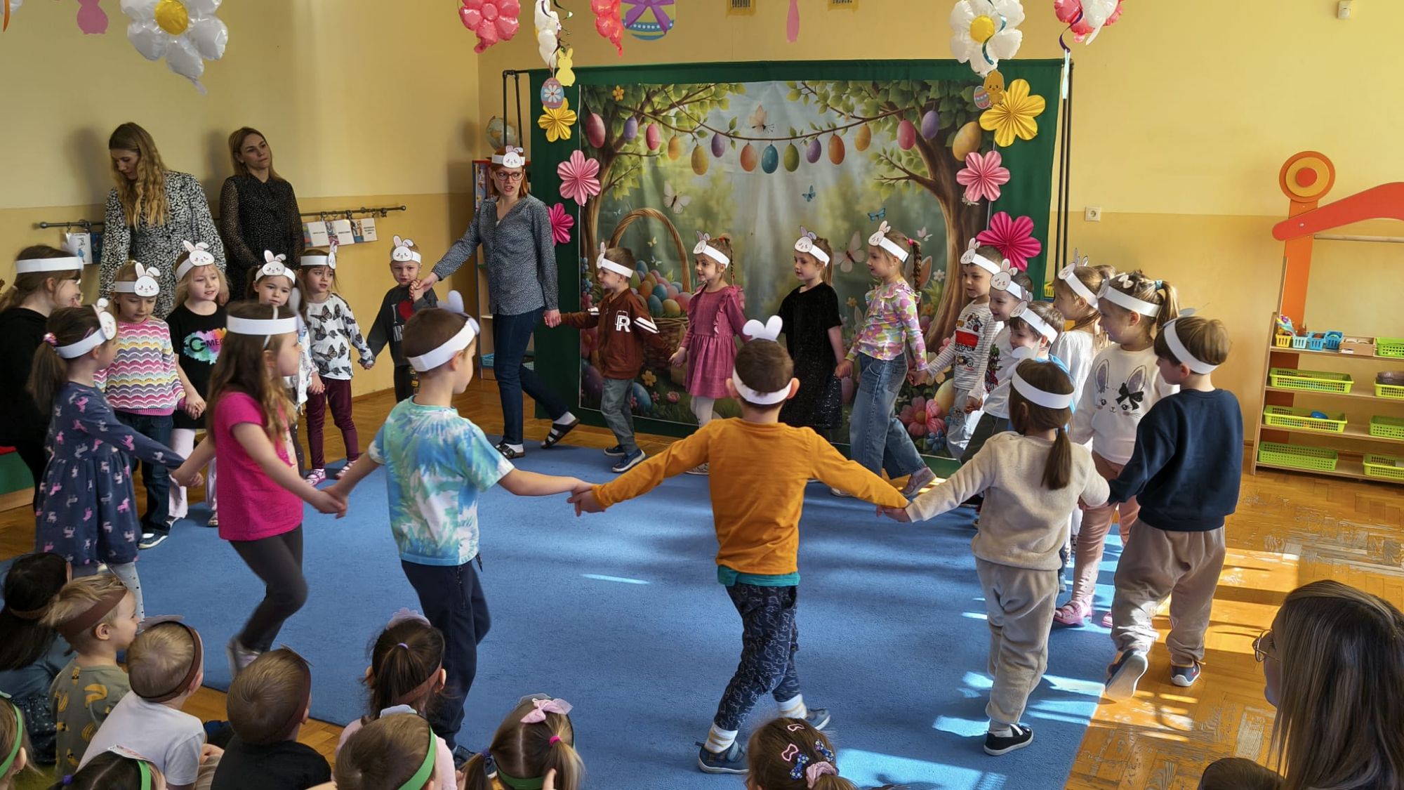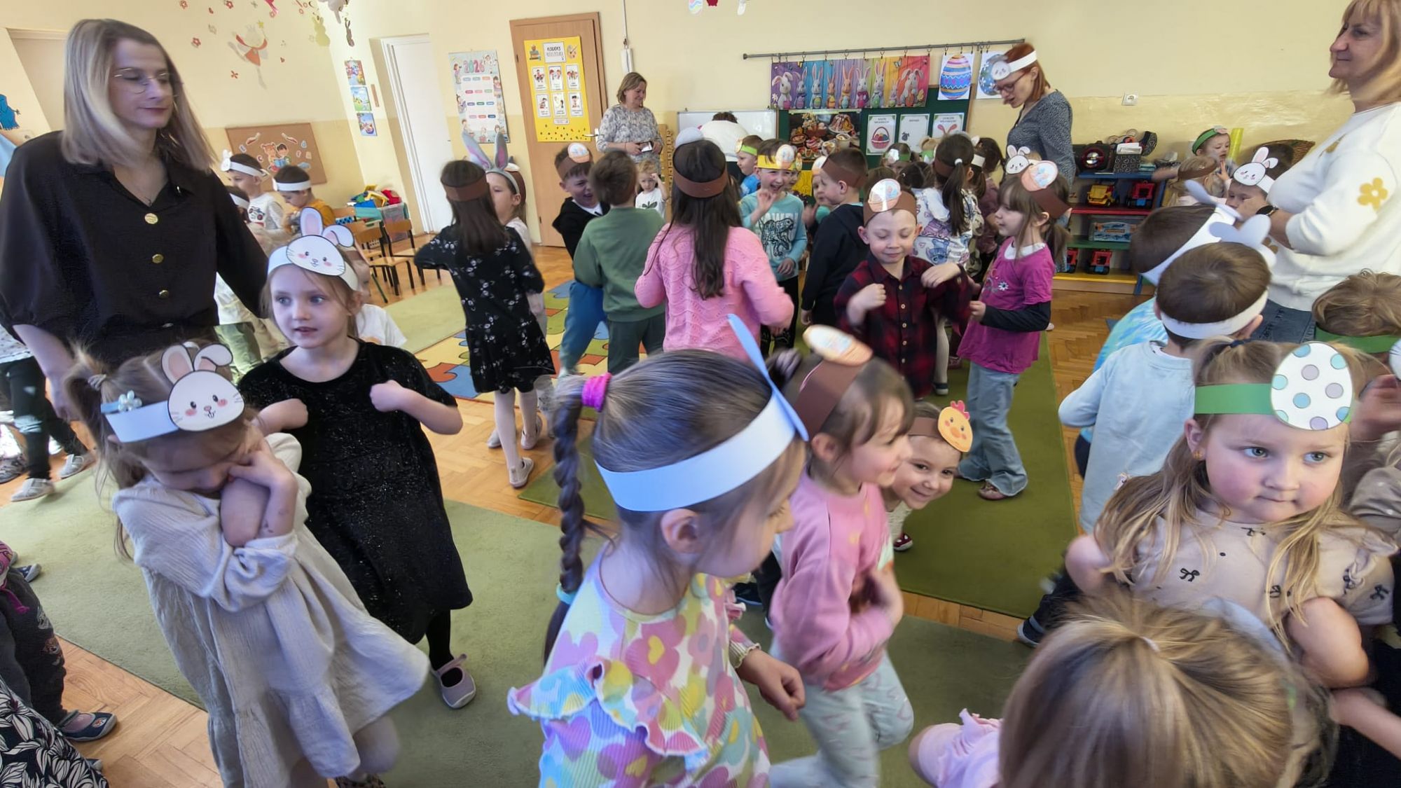 1 kwietnia w Przedszkolu Publicznym Nr 4 w Ozimku odbyło się radosne szukanie Zajączka Wielkanocnego. Na początku każda grupa zaprezentowała się – dzieci śpiewały wielkanocne piosenki, grały na instrumentach oraz tańczyły. Wszystkie grupy miały przygotowane opaski z motywem wielkanocnym, co dodawało uroku całemu wydarzeniu.