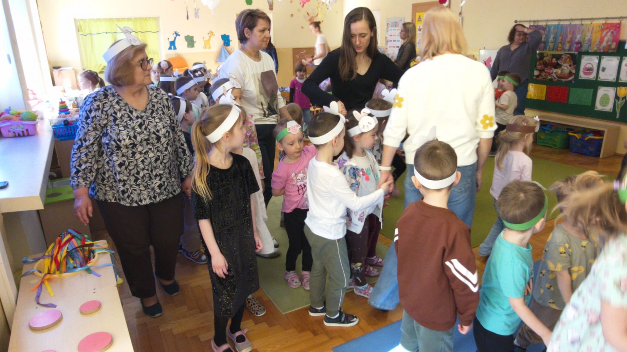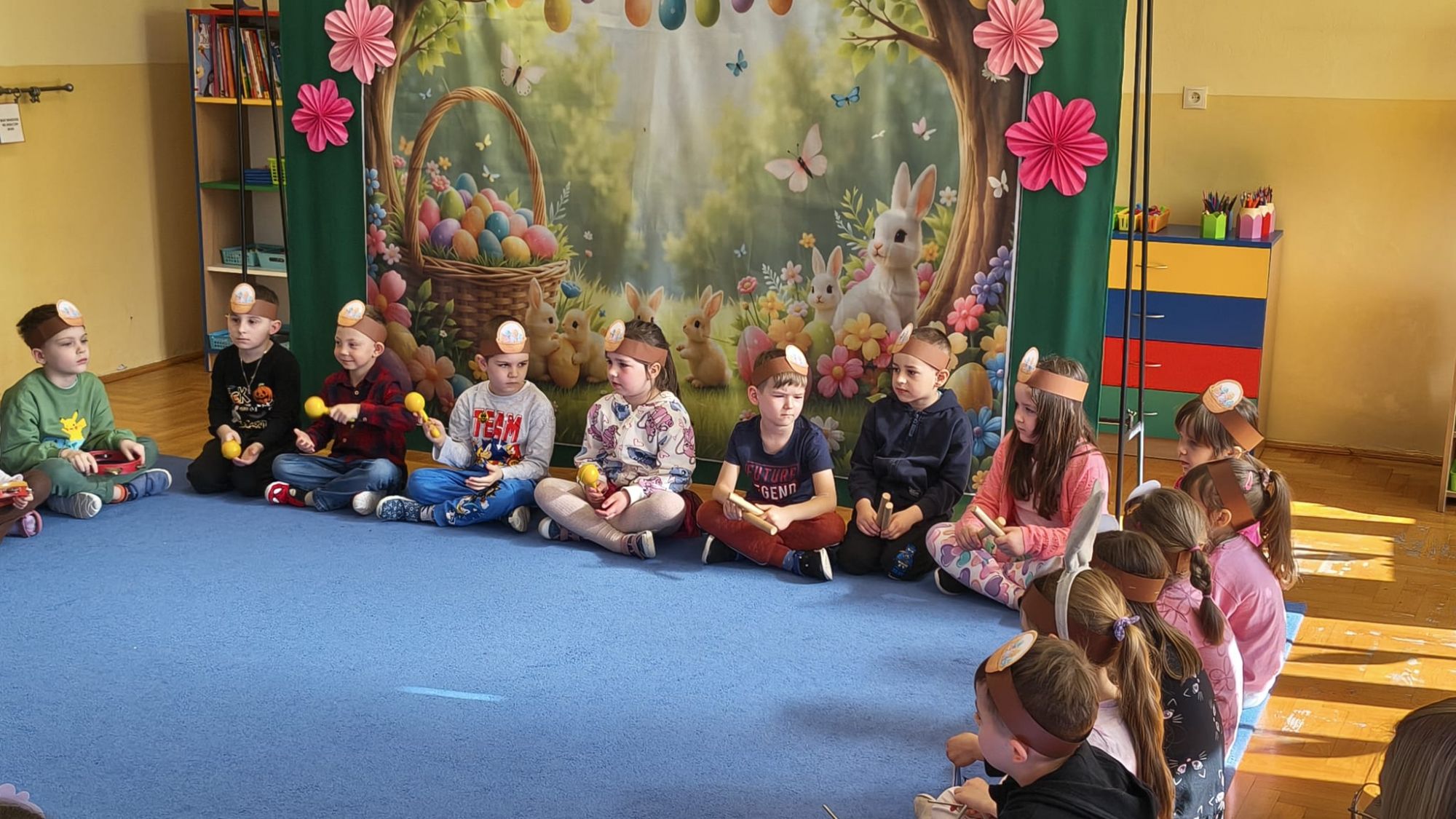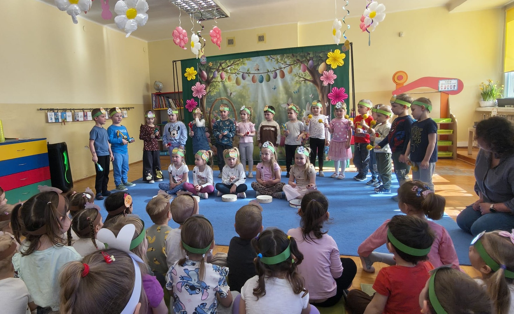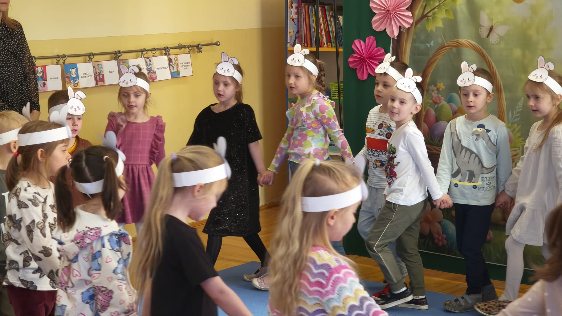 1 kwietnia w Przedszkolu Publicznym Nr 4 w Ozimku odbyło się radosne szukanie Zajączka Wielkanocnego. Na początku każda grupa zaprezentowała się – dzieci śpiewały wielkanocne piosenki, grały na instrumentach oraz tańczyły. Wszystkie grupy miały przygotowane opaski z motywem wielkanocnym, co dodawało uroku całemu wydarzeniu.