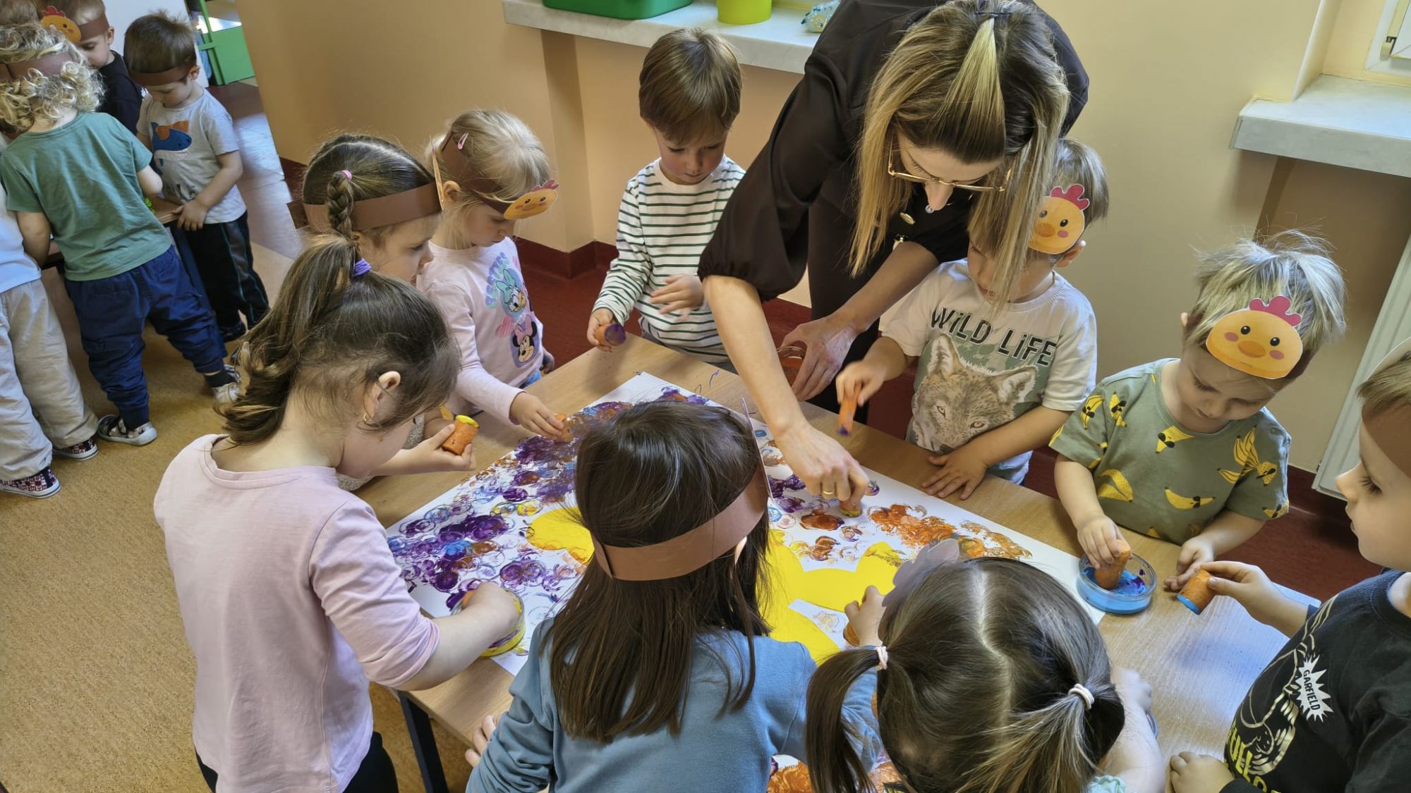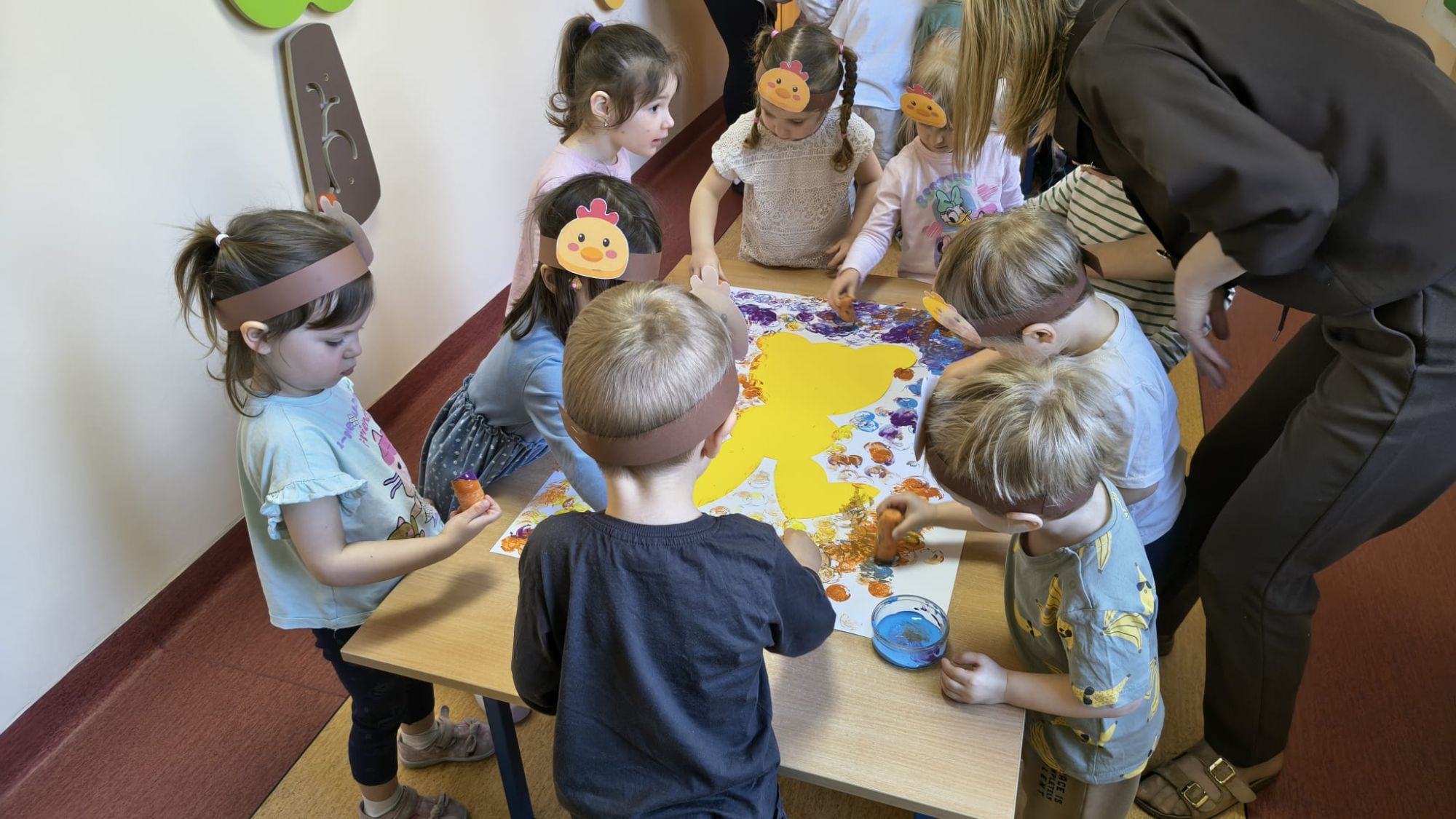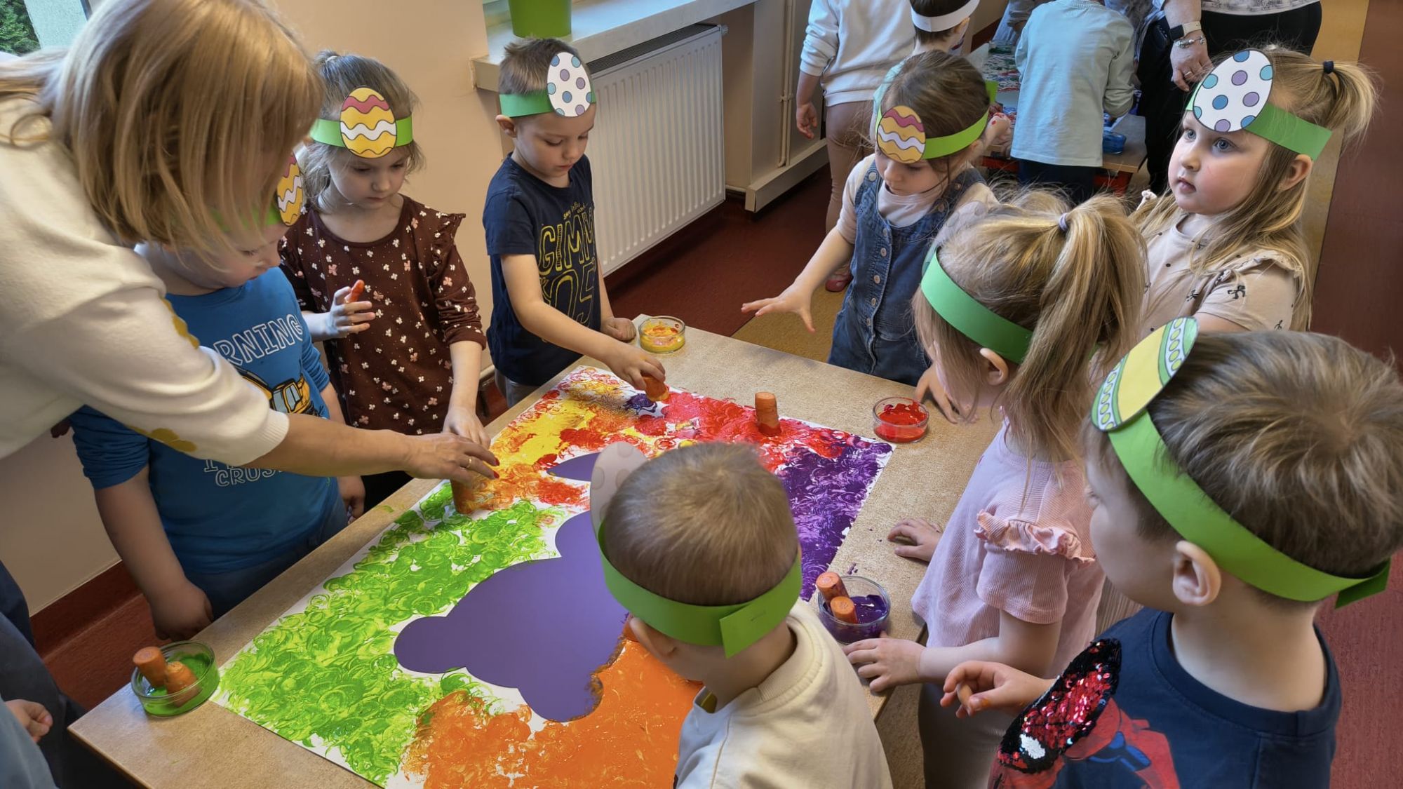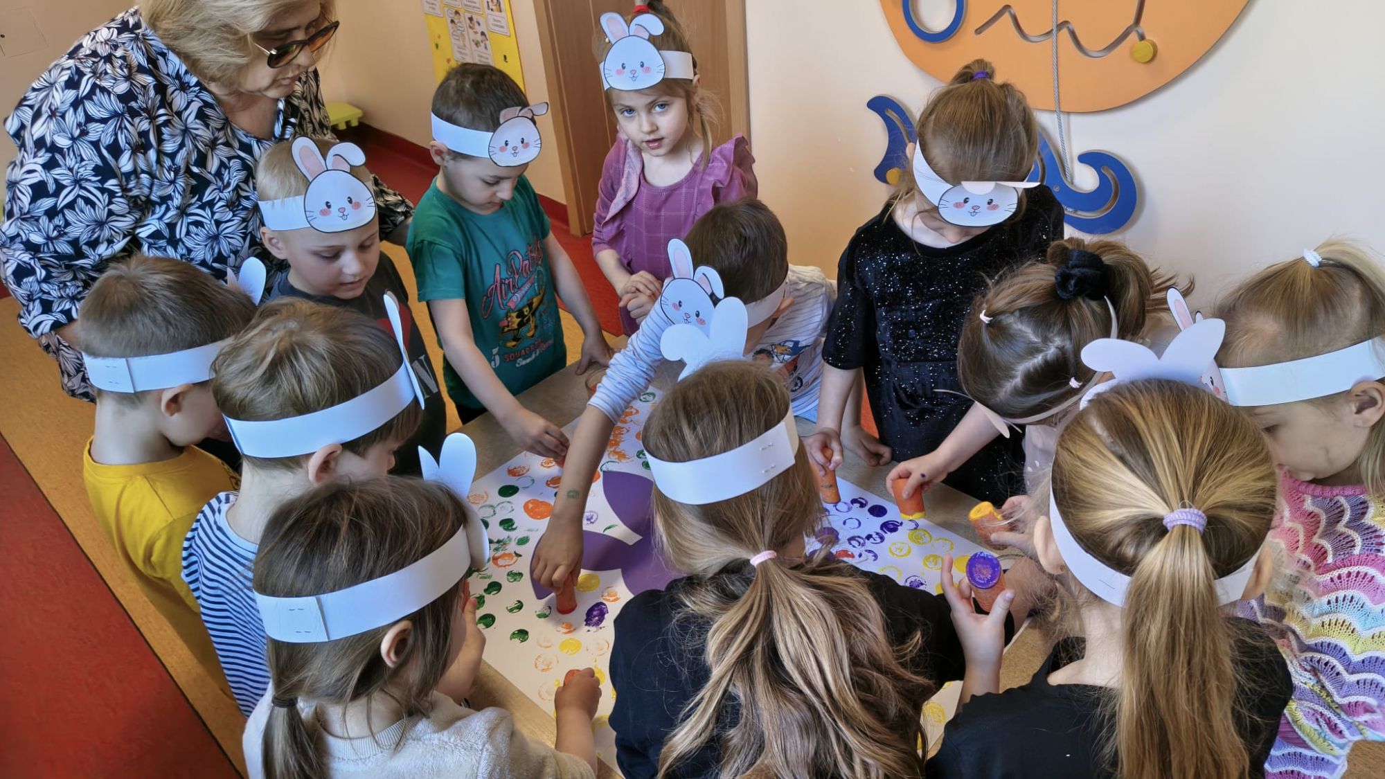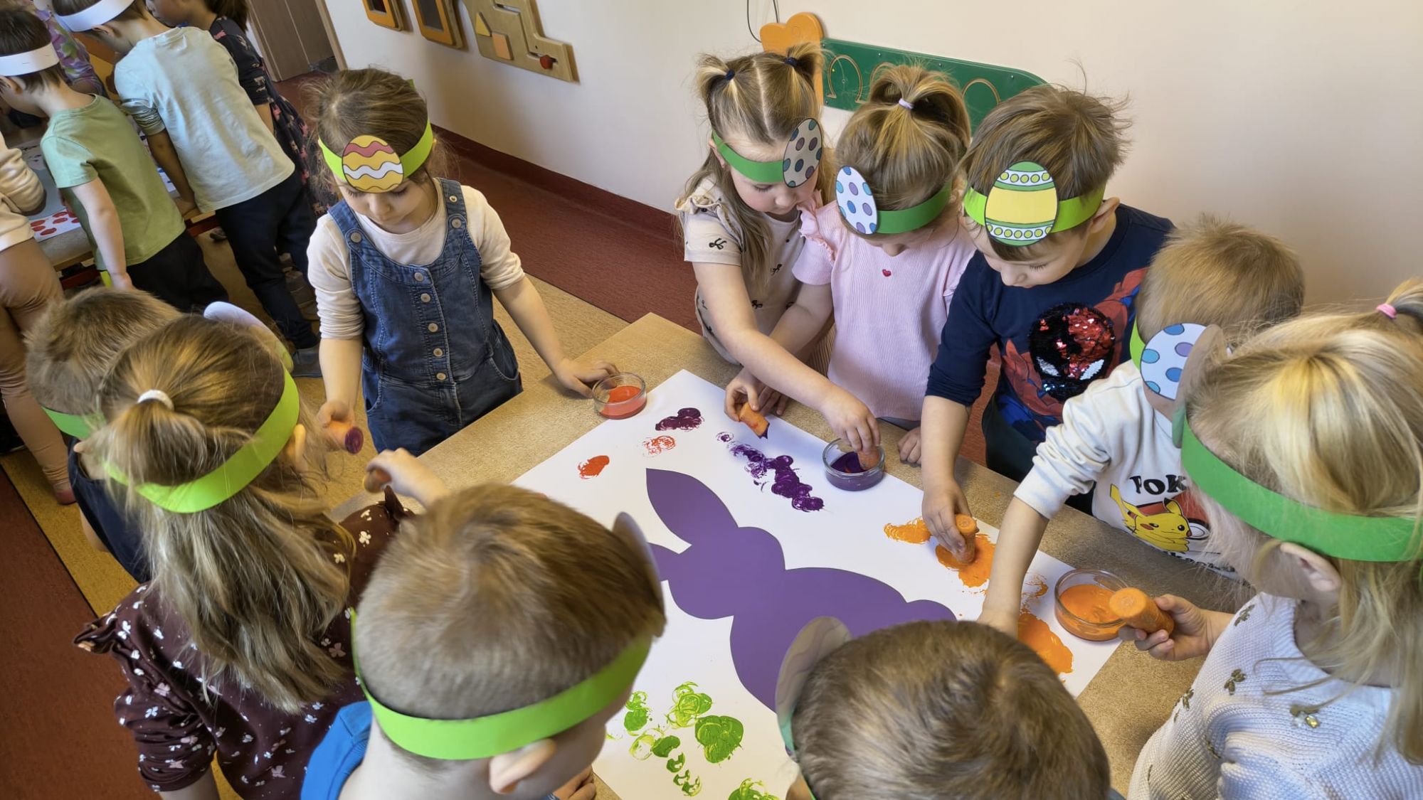 Następnie dzieci tworzyły własne zajączki, stemplując marchewki zamoczone w farbie, co sprawiło im wiele radości i pozwoliło rozwijać kreatywność.