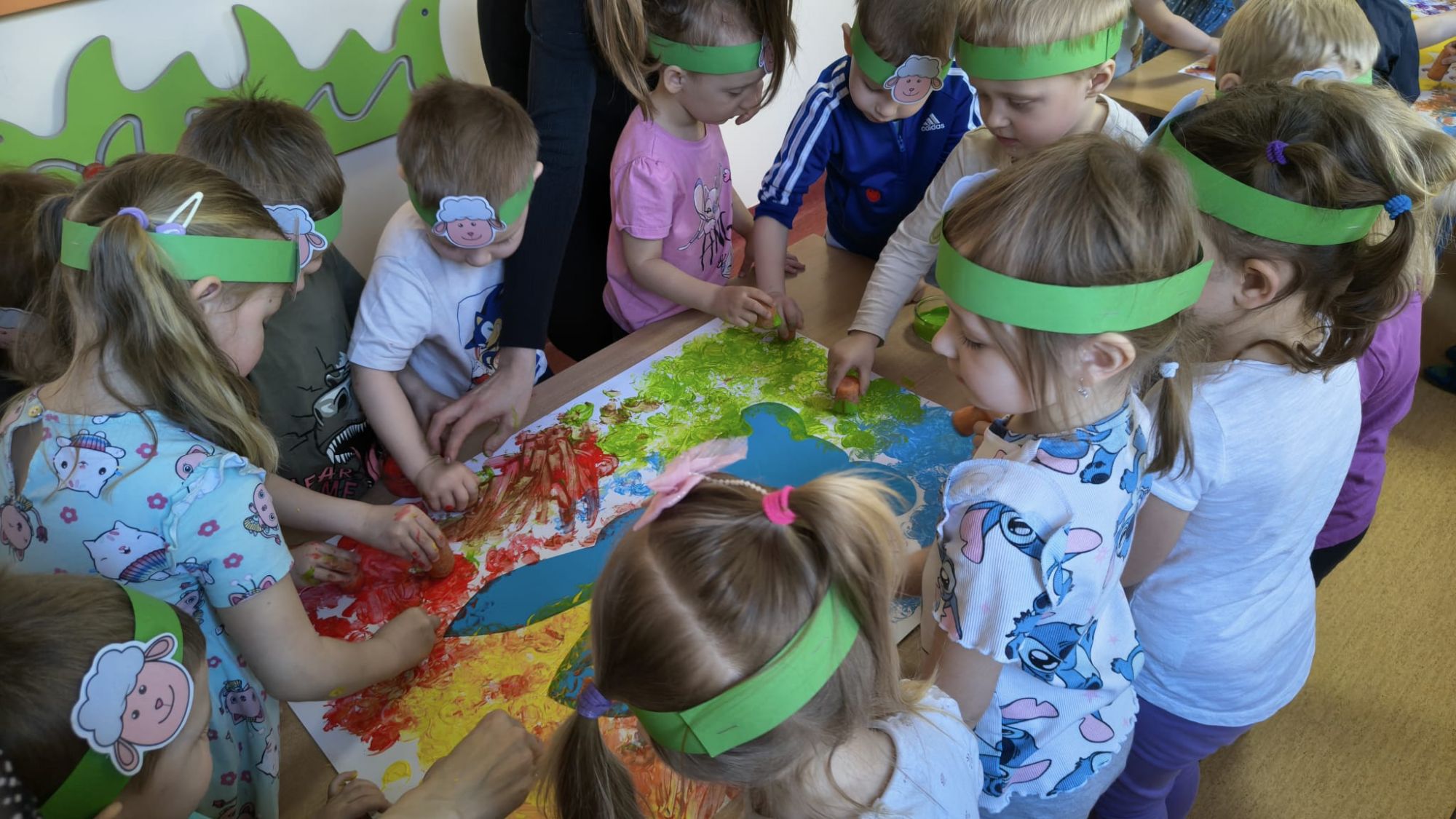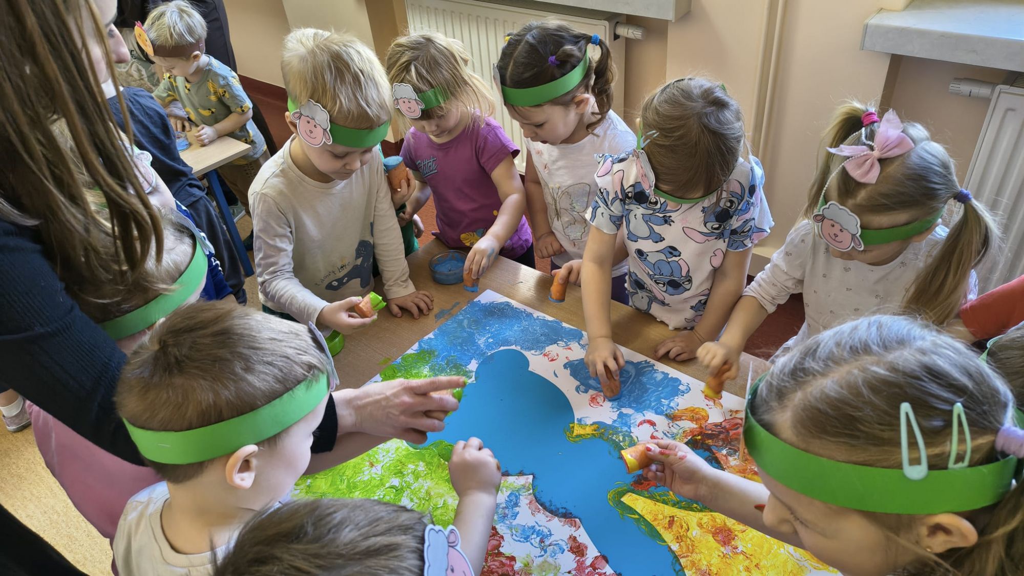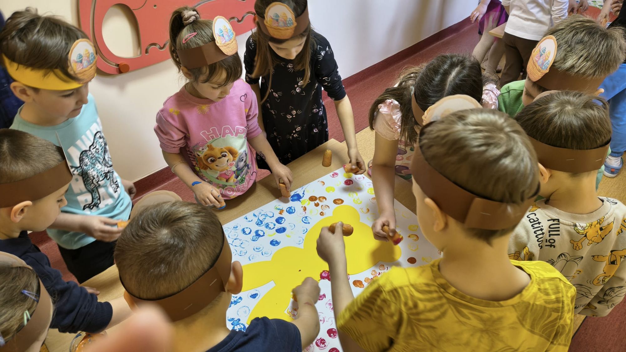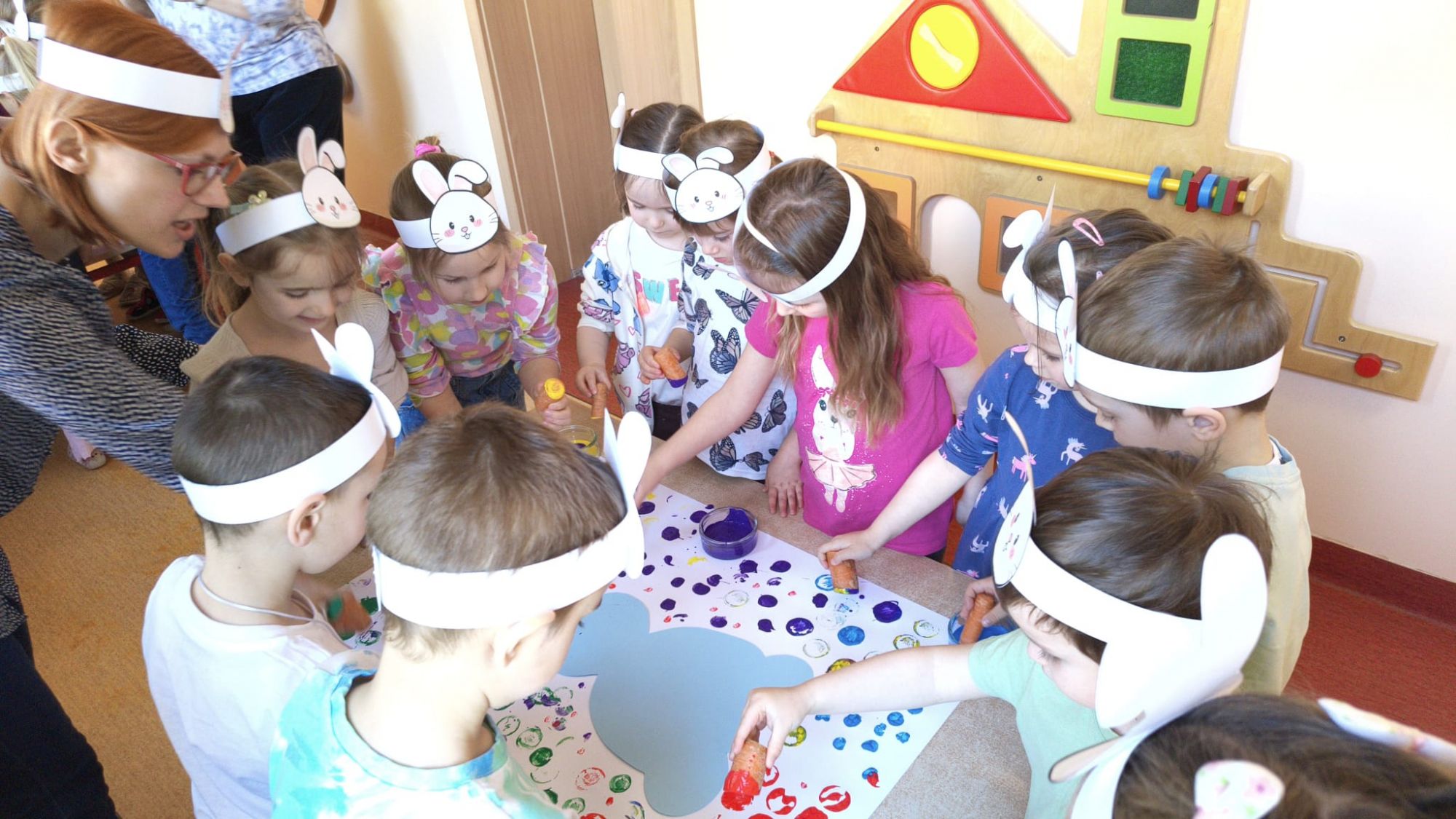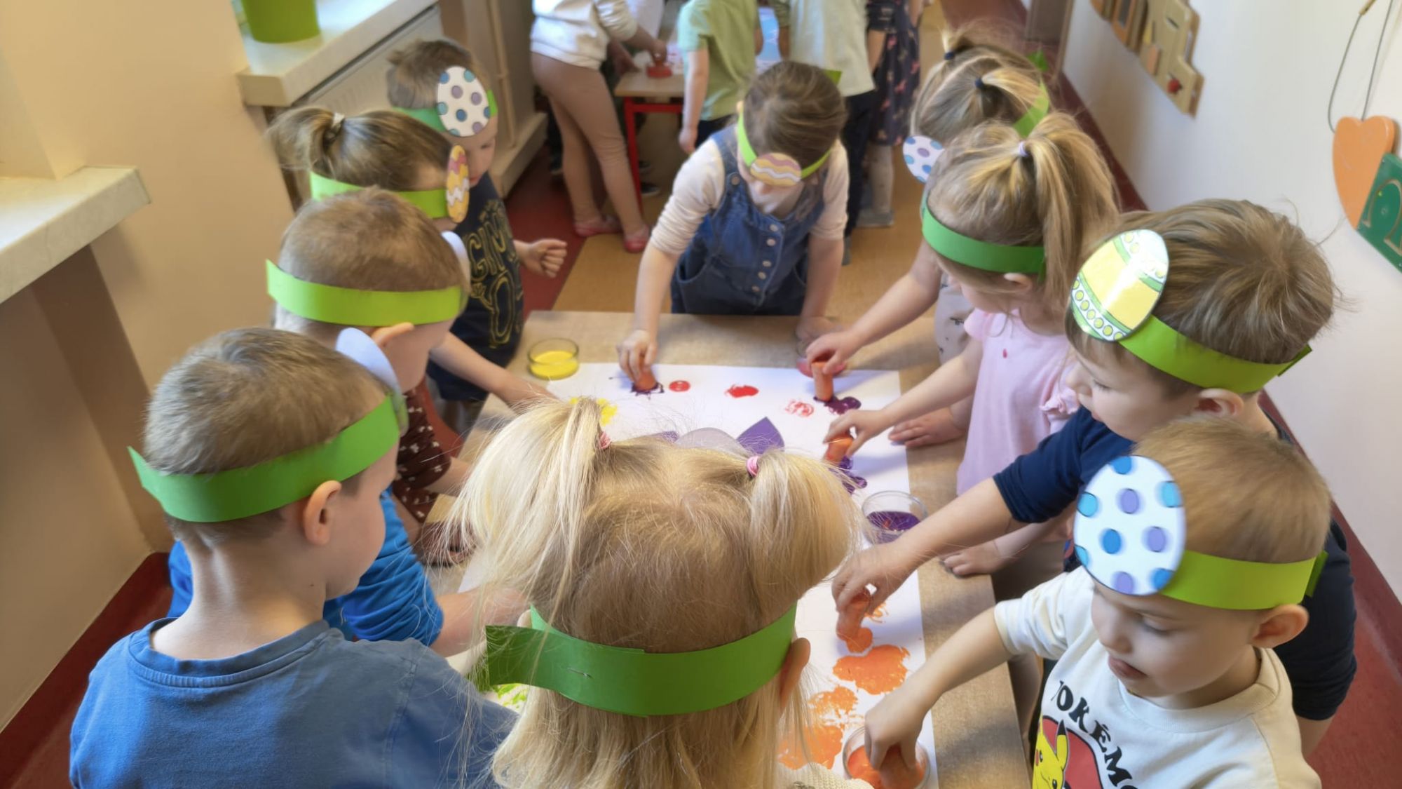 Następnie dzieci tworzyły własne zajączki, stemplując marchewki zamoczone w farbie, co sprawiło im wiele radości i pozwoliło rozwijać kreatywność.