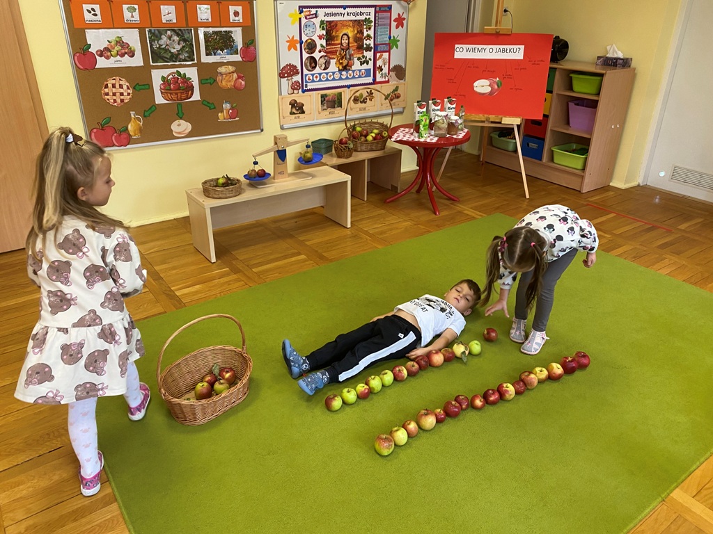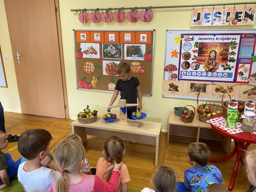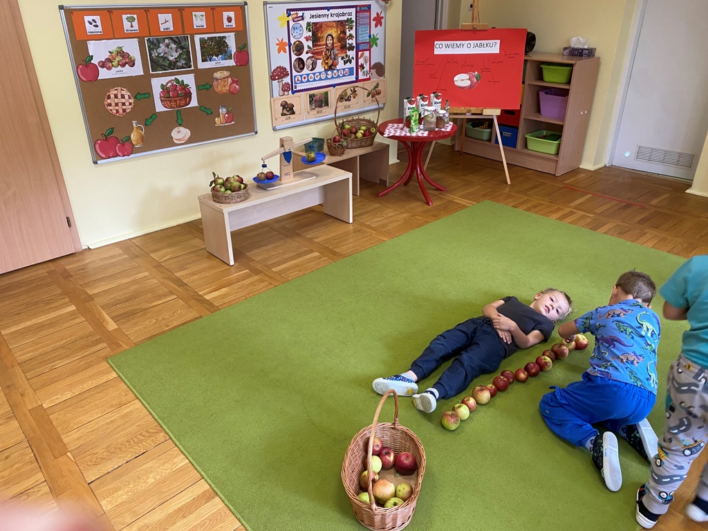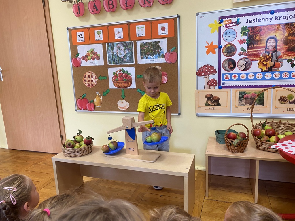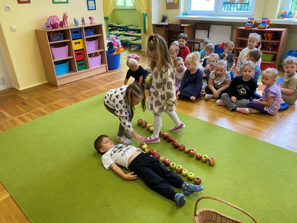 Podczas zajęć rozmawialiśmy o tym, co można zrobić z jabłek – dzieci wymieniały m.in. szarlotkę, sok, mus, czy kompot. Rozwijając kompetencje matematyczne, przedszkolaki ważyły jabłka na wadze, porównując ich ciężar, a następnie z uśmiechem mierzyły długość siebie nawzajem… jabłkami! Śmiechu było co niemiara, a dzieci z ogromnym zaangażowaniem uczestniczyły w zabawie.