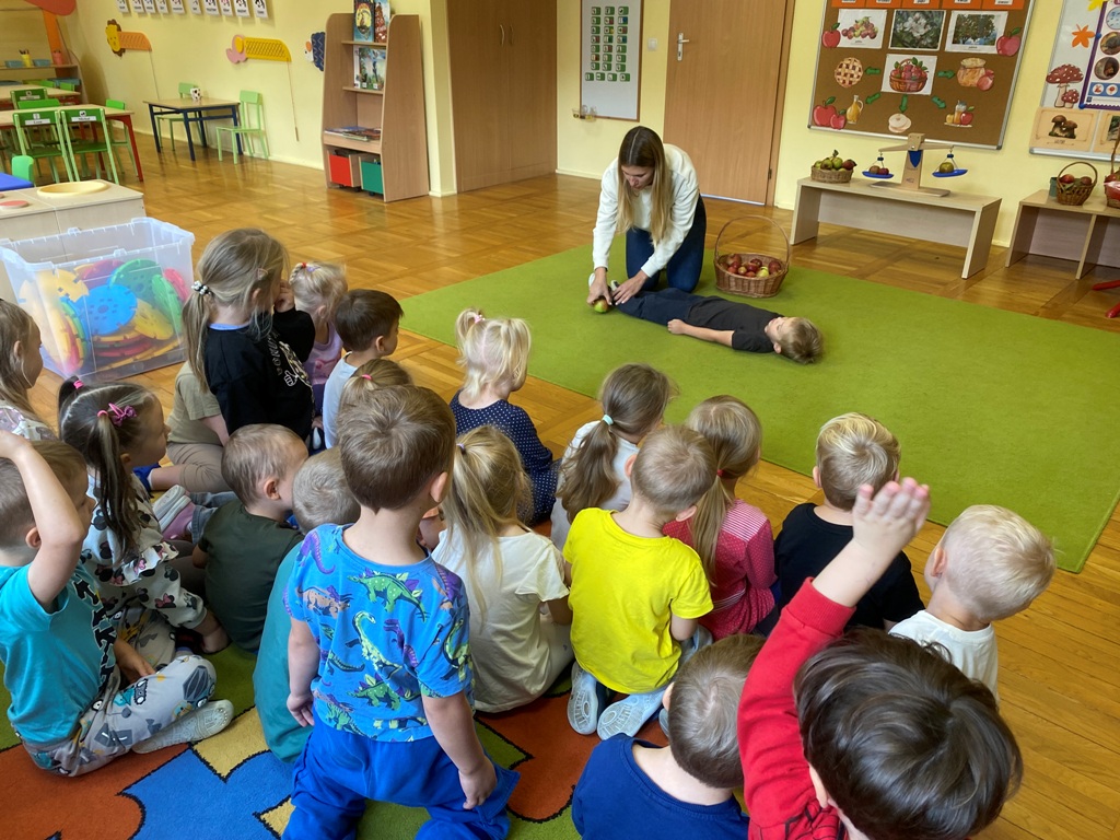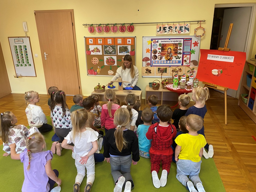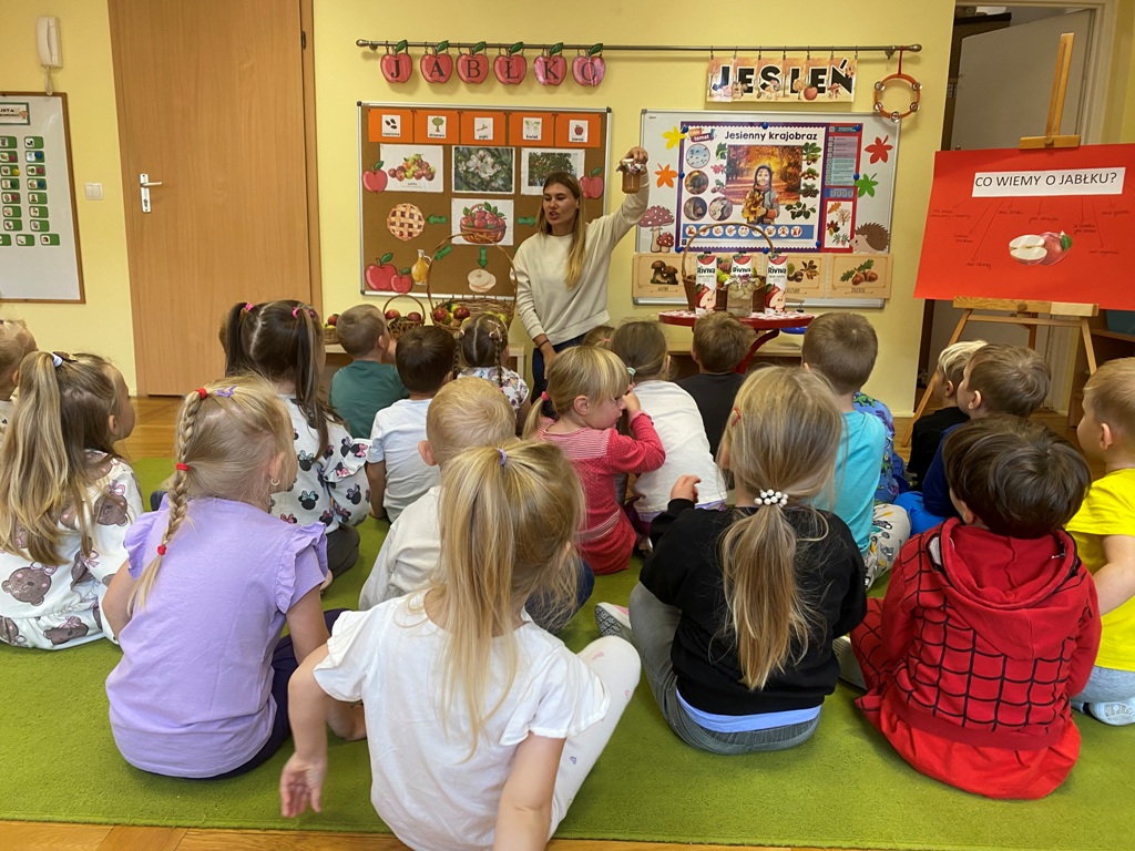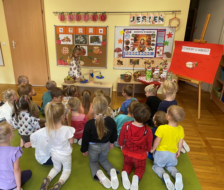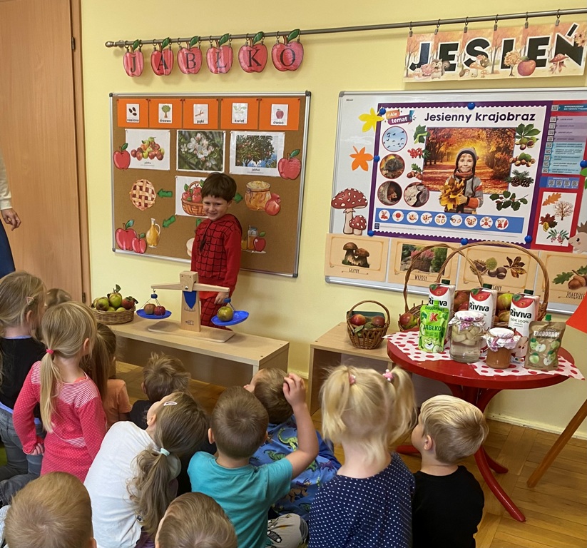 Podczas zajęć rozmawialiśmy o tym, co można zrobić z jabłek – dzieci wymieniały m.in. szarlotkę, sok, mus, czy kompot. Rozwijając kompetencje matematyczne, przedszkolaki ważyły jabłka na wadze, porównując ich ciężar, a następnie z uśmiechem mierzyły długość siebie nawzajem… jabłkami! Śmiechu było co niemiara, a dzieci z ogromnym zaangażowaniem uczestniczyły w zabawie.
