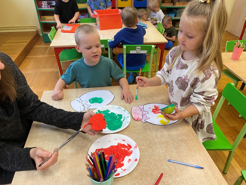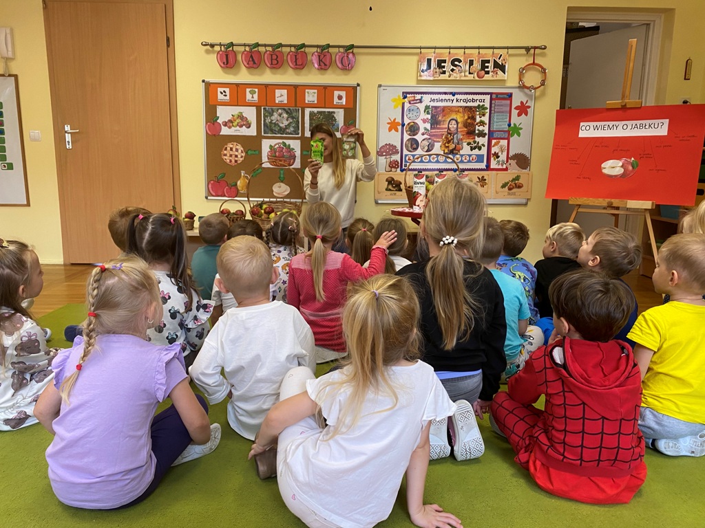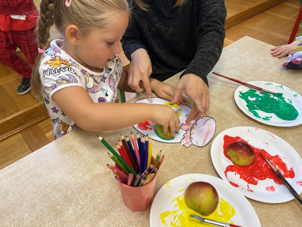 Na zakończenie zajęć każde dziecko wykonało pracę plastyczną, odbijając połówki jabłek w farbie. Dzięki temu powstały piękne, kolorowe kompozycje, a dzieci rozwijały zmysł estetyczny i motorykę małą.