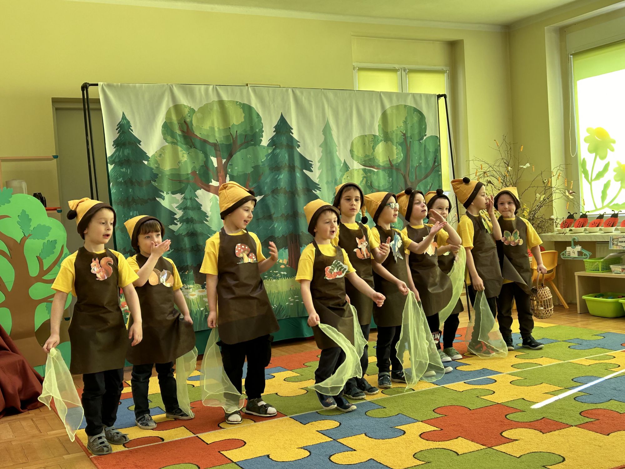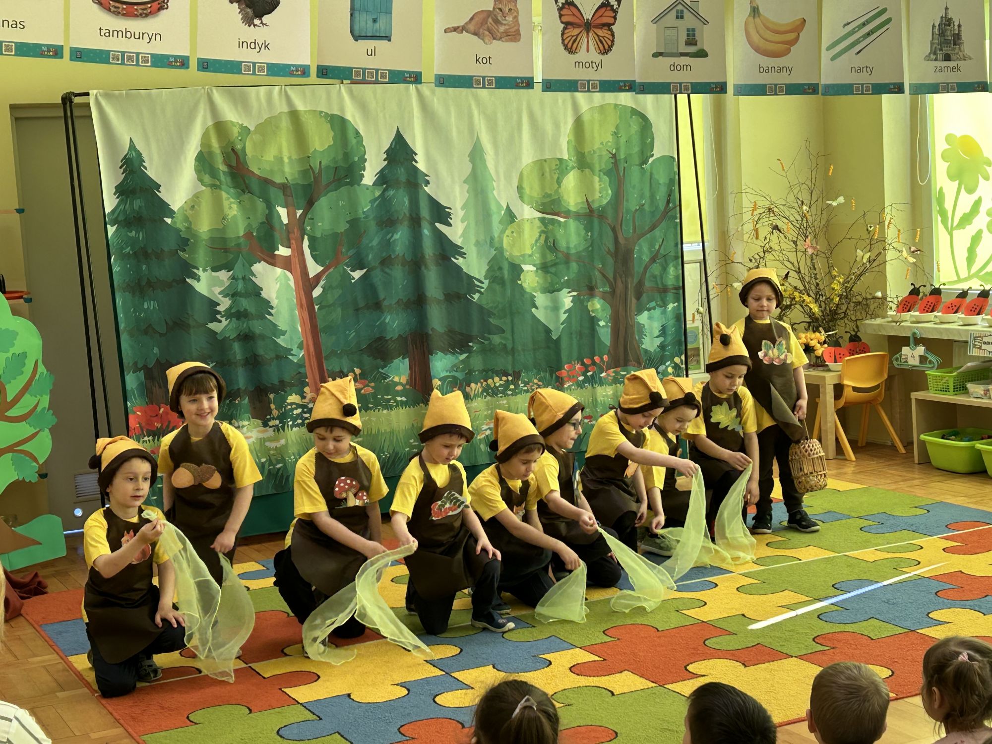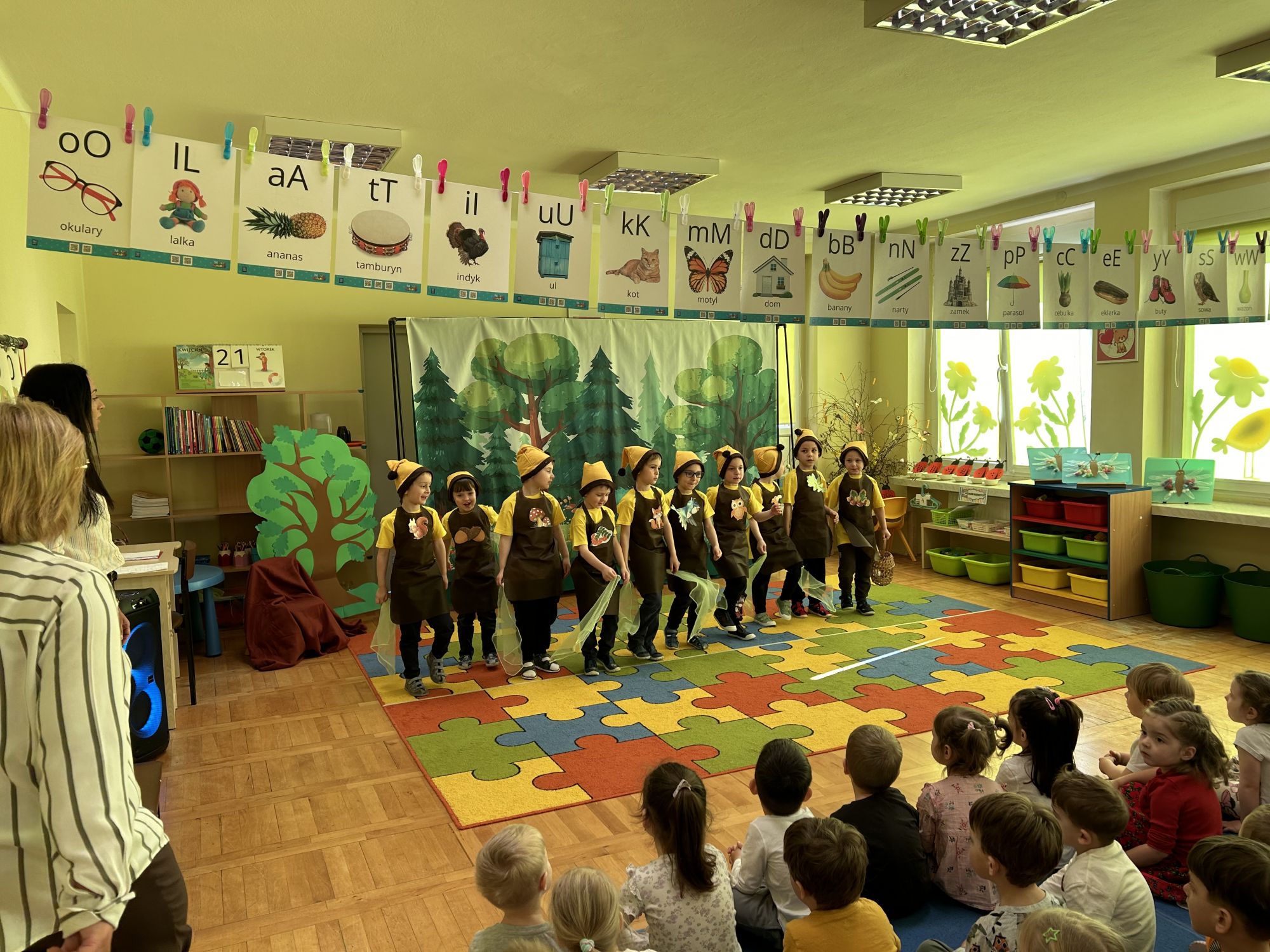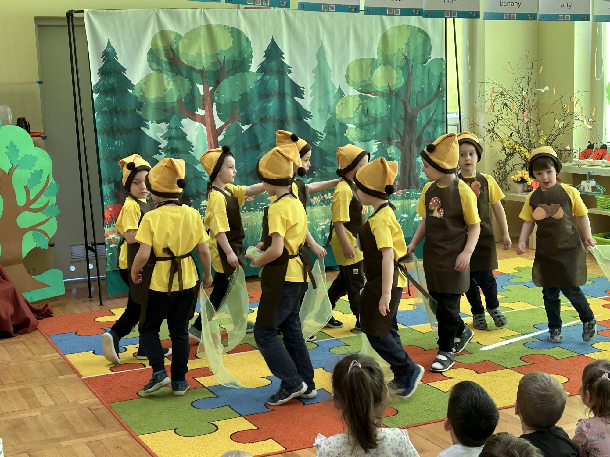Na scenie najpierw pojawiły się „leśne duszki”, których delikatny i pełen wdzięku taniec płynnie otworzył całe wydarzenie. Następnie dzieci zaprezentowały krótką inscenizacja pt. „Stary dąb”, w której dzieci pokazały, jak ważną rolę pełnią drzewa w przyrodzie. Opowieść o drzewie stała się pięknym wprowadzeniem do kolejnego występu – dziewczynki zaśpiewały piosenkę „Jagódki”, po czym zaprezentowały taniec „leśnych wróżek”.